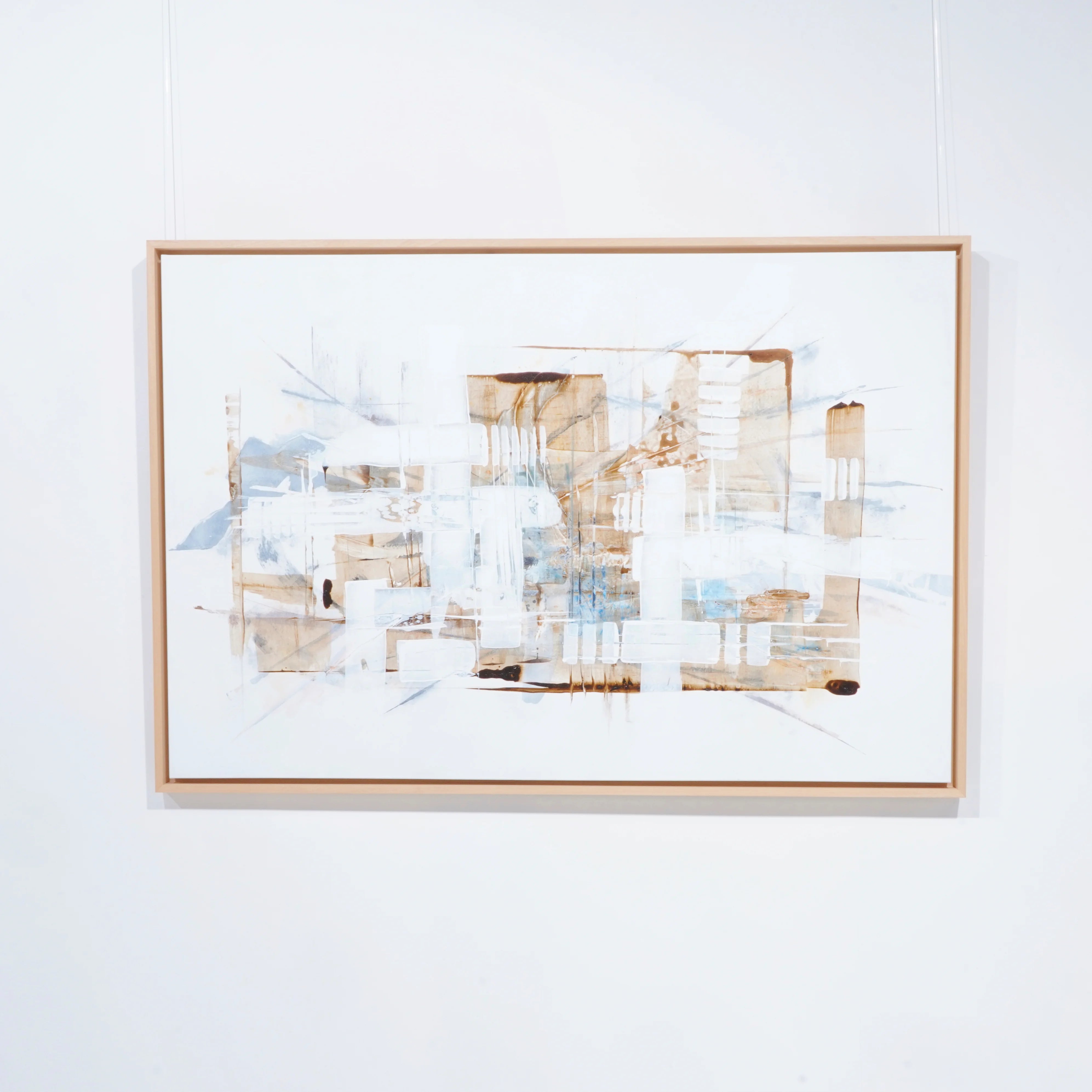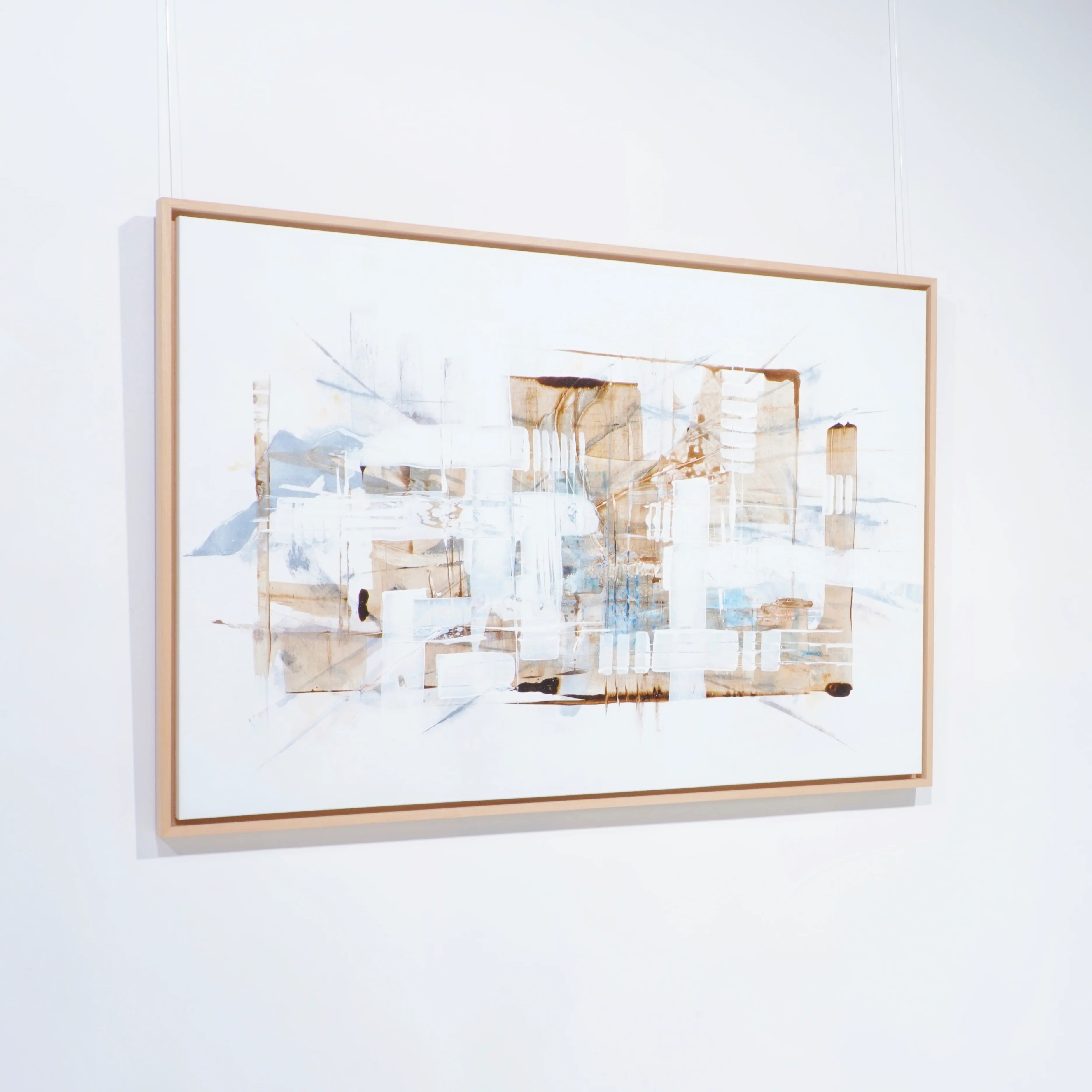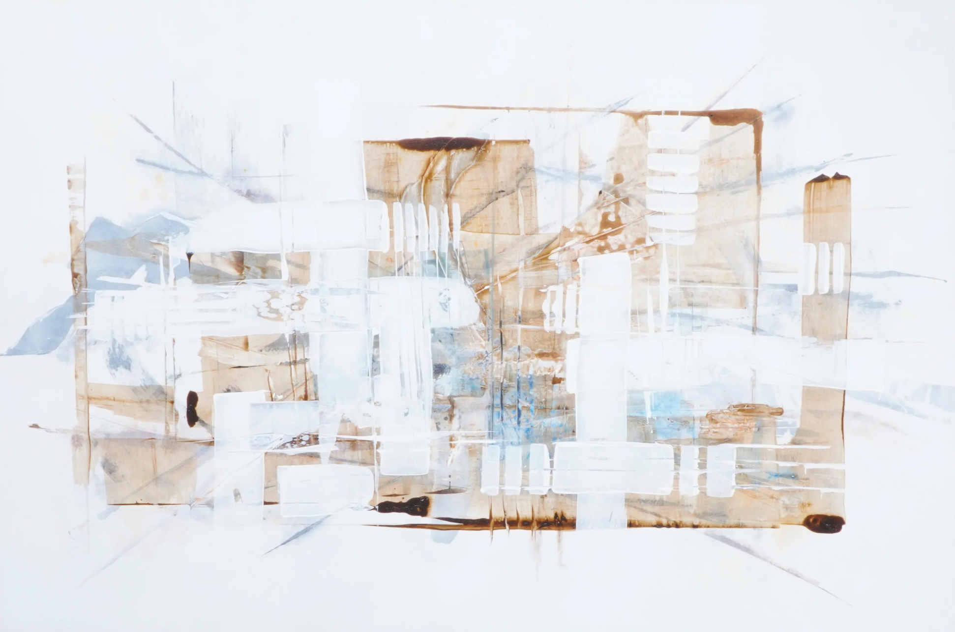 L’œuvre se distingue par une construction subtile mêlant lignes architecturales, transparences et superpositions. Les teintes douces de blanc, de beige et de brun se fondent avec des touches plus fraîches et aériennes, créant une sensation de profondeur et de légèreté. L’ensemble évoque un paysage urbain déconstruit ou une architecture imaginaire, où chaque élément semble flotter dans un équilibre délicat.