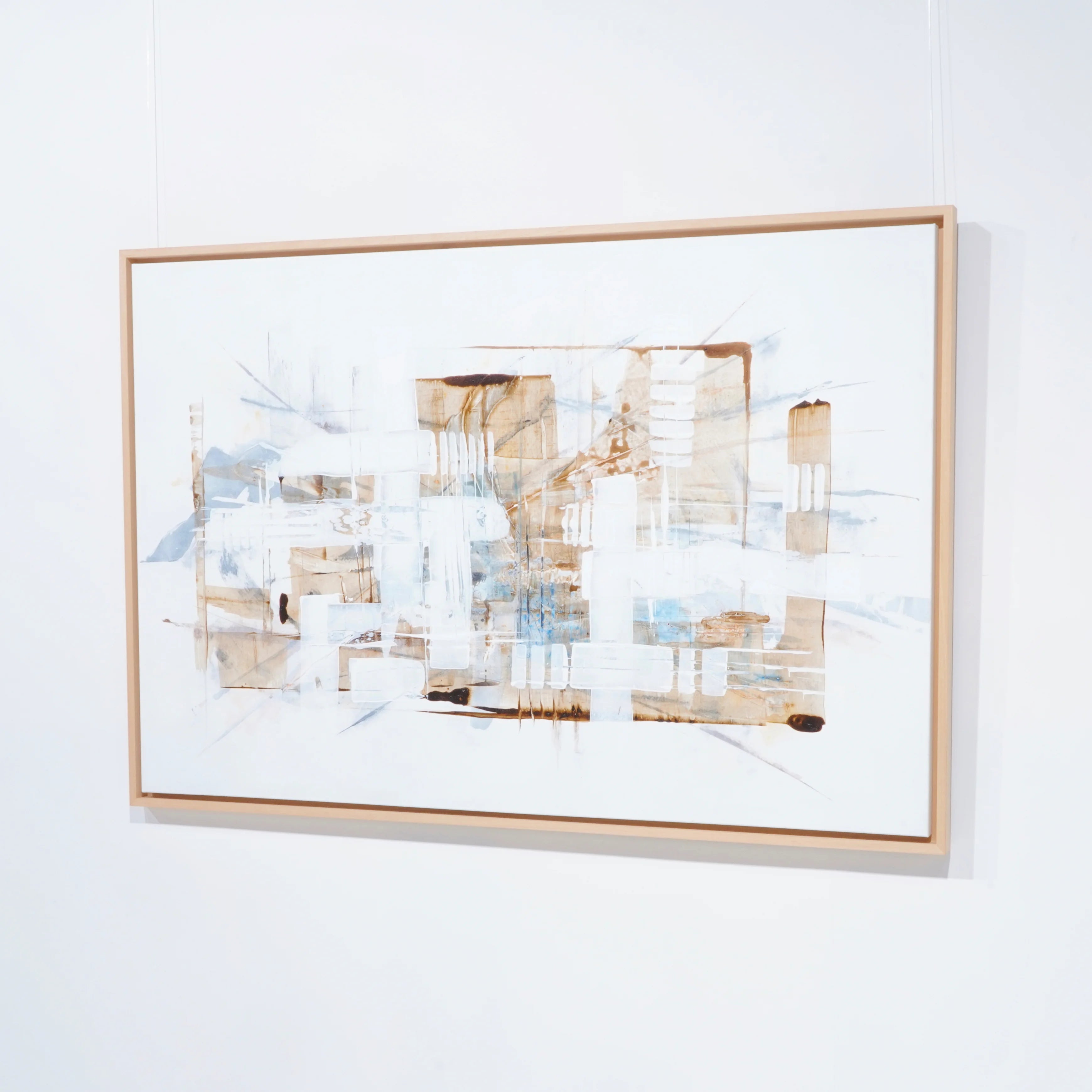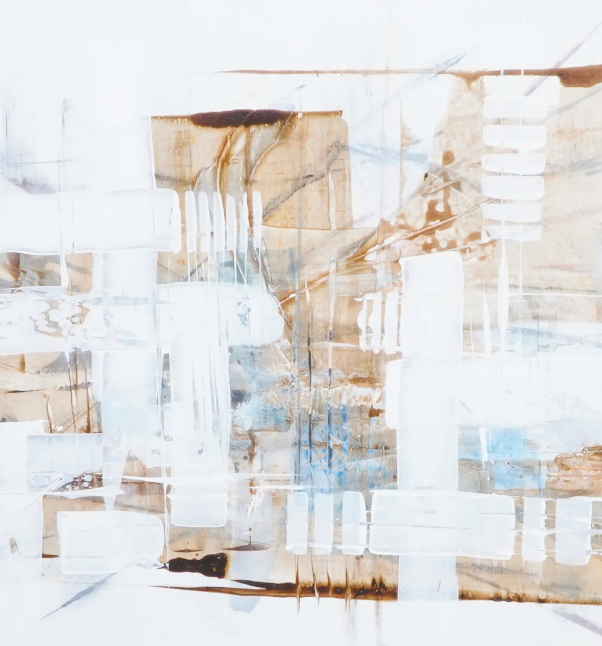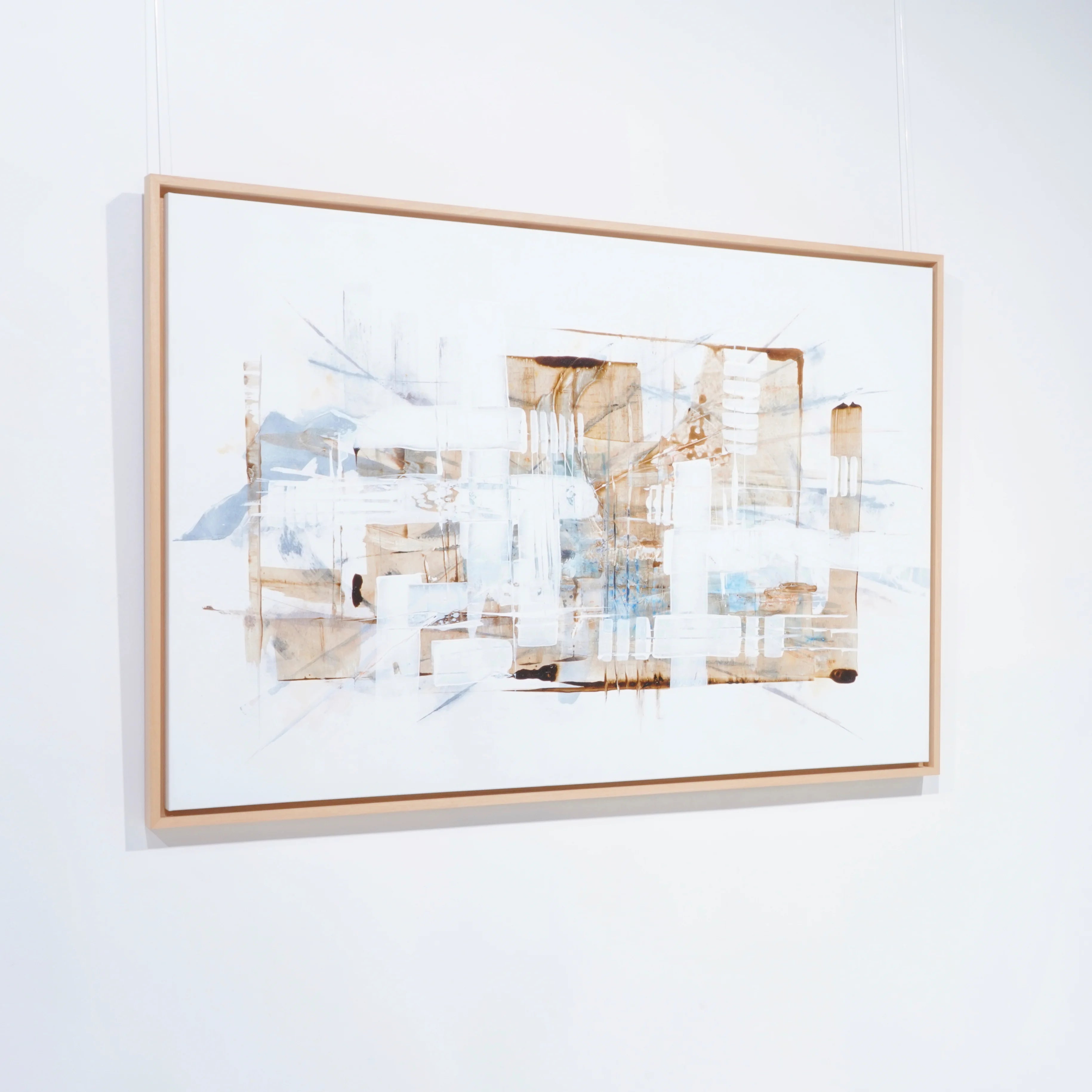 L’œuvre se distingue par une construction subtile mêlant lignes architecturales, transparences et superpositions. Les teintes douces de blanc, de beige et de brun se fondent avec des touches plus fraîches et aériennes, créant une sensation de profondeur et de légèreté. L’ensemble évoque un paysage urbain déconstruit ou une architecture imaginaire, où chaque élément semble flotter dans un équilibre délicat.