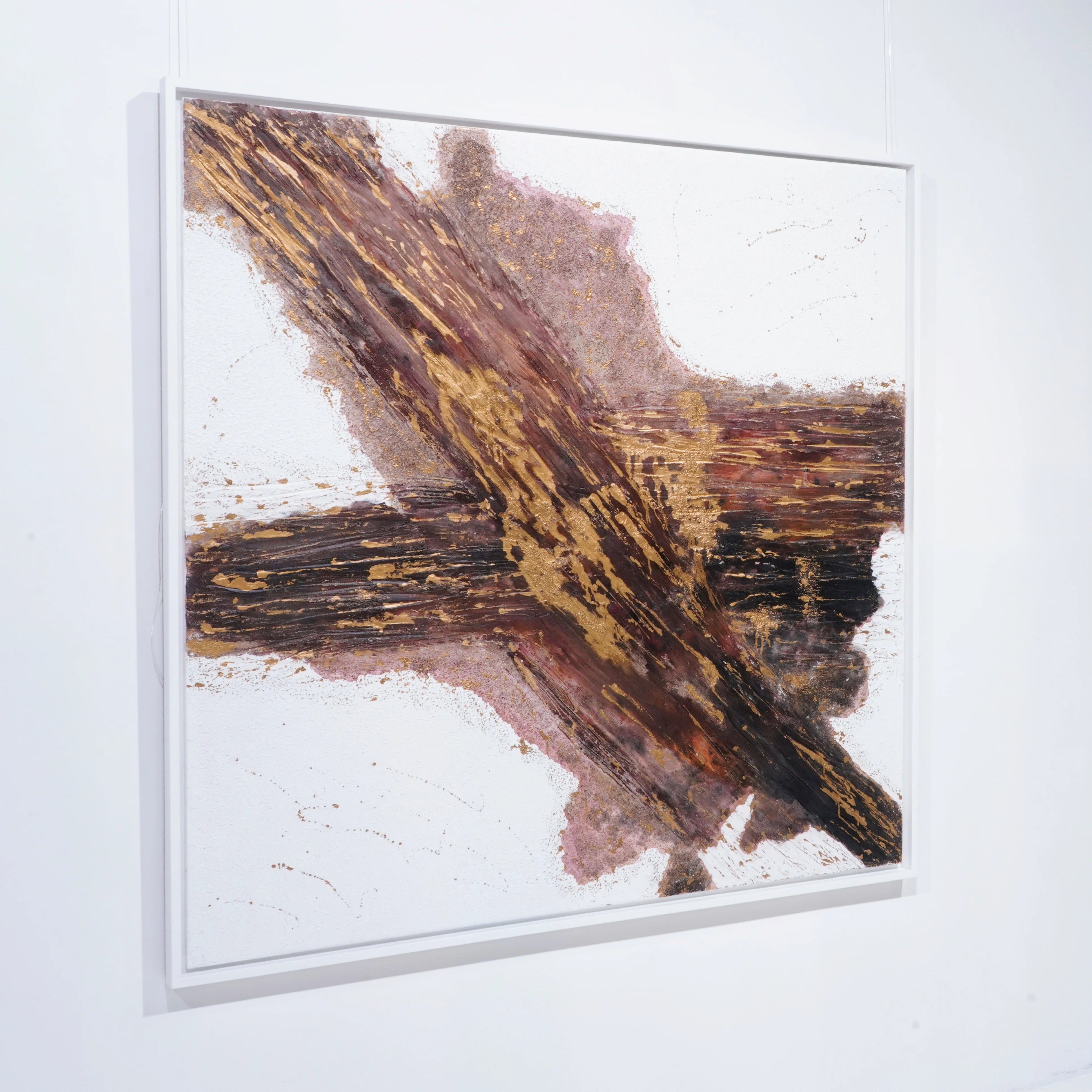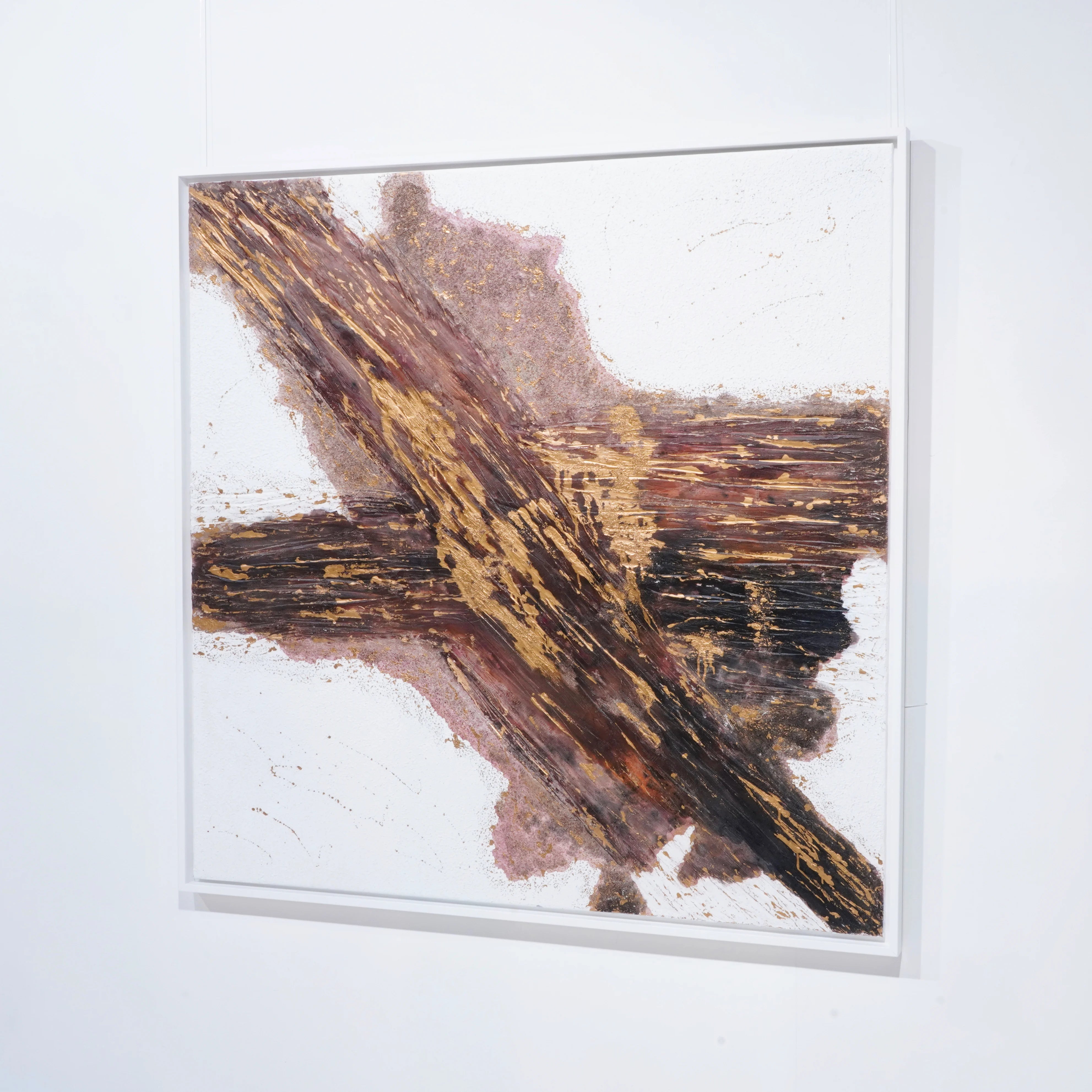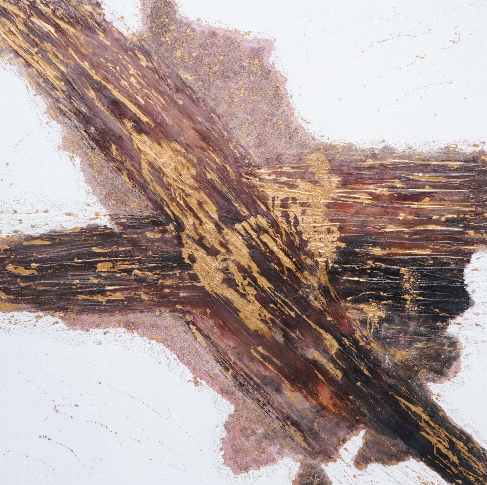 La composition s’organise autour d’un croisement central, comme un axe de lumière et de matière en expansion. Les reliefs donnent à l’œuvre une présence sculpturale, tandis que les éclats de feuille d’or captent la lumière avec finesse et renforcent sa dimension précieuse. Entre puissance du mouvement, équilibre des masses et vibration de la surface, Estrella Mágica 1 déploie une esthétique à la fois contemporaine, minérale et profondément expressive. Grâce à son intensité formelle et à son raffinement visuel, l’œuvre s’impose comme un tableau contemporain haut de gamme, idéal pour sublimer un intérieur élégant, un espace de réception ou une collection privée.