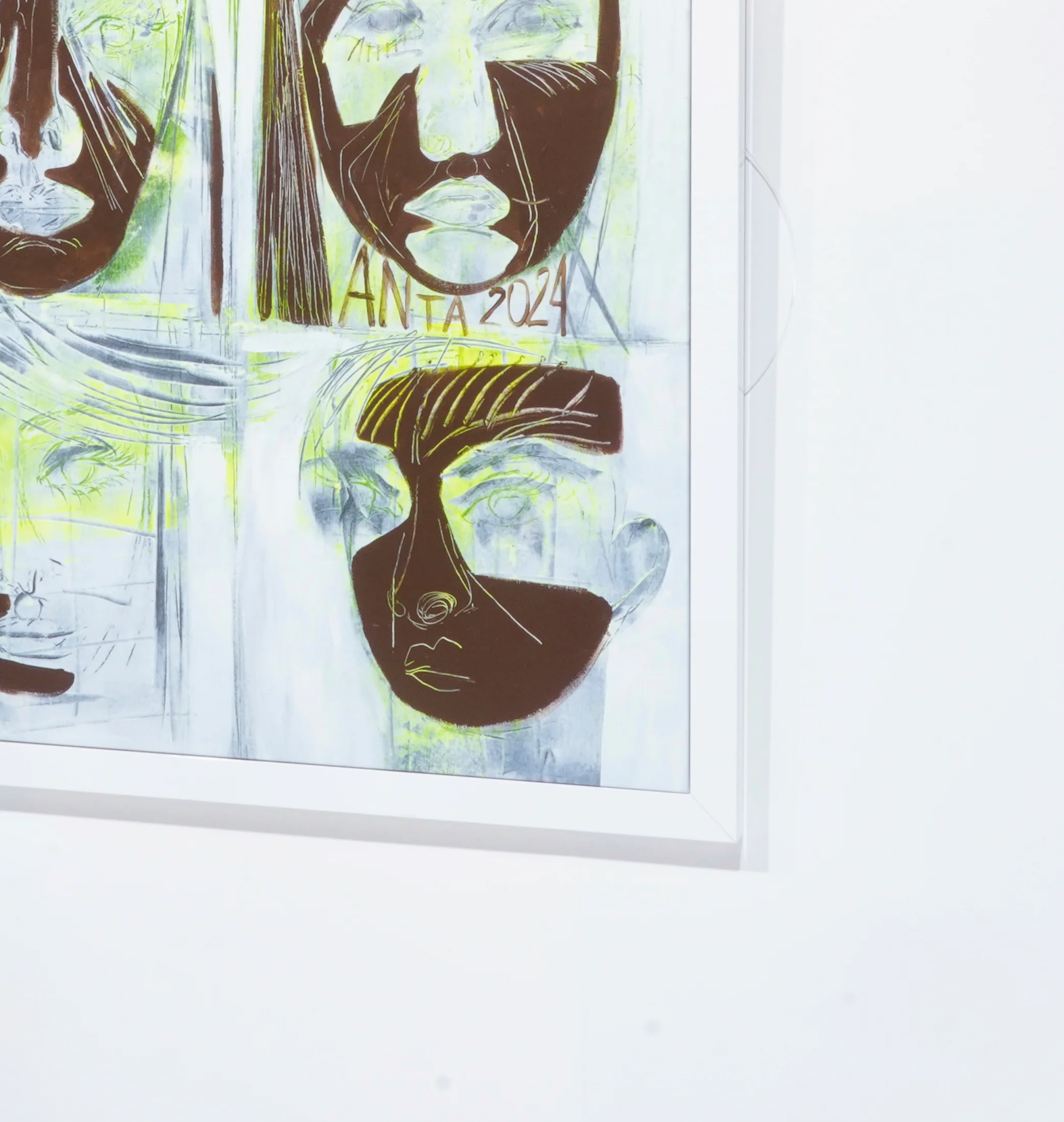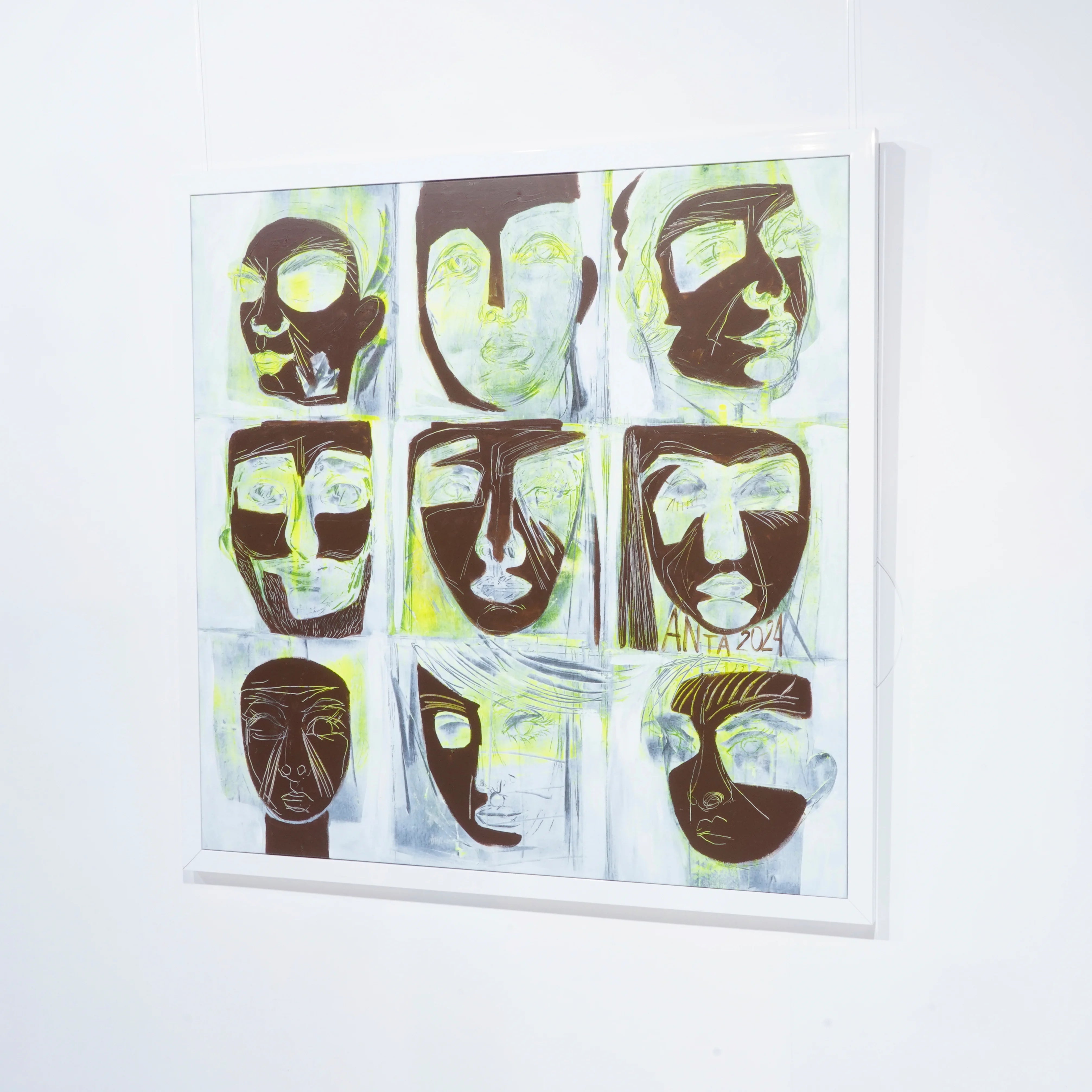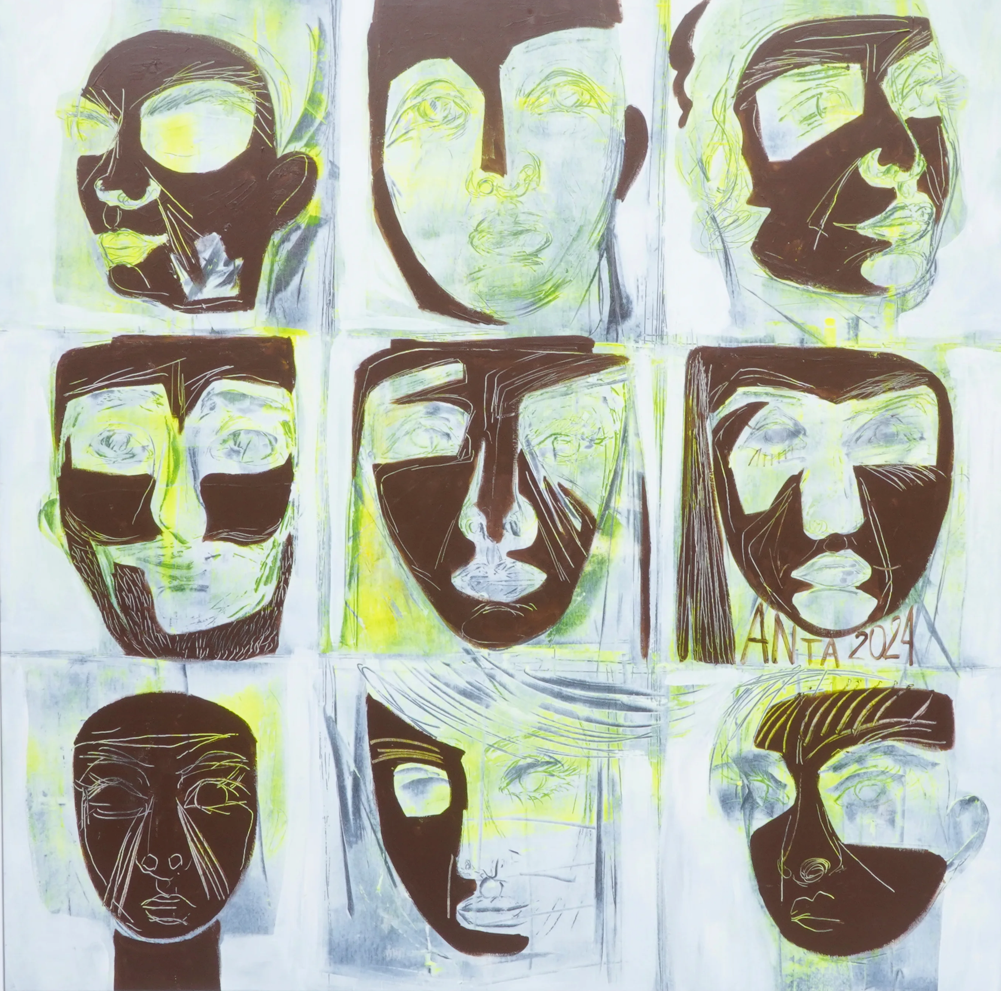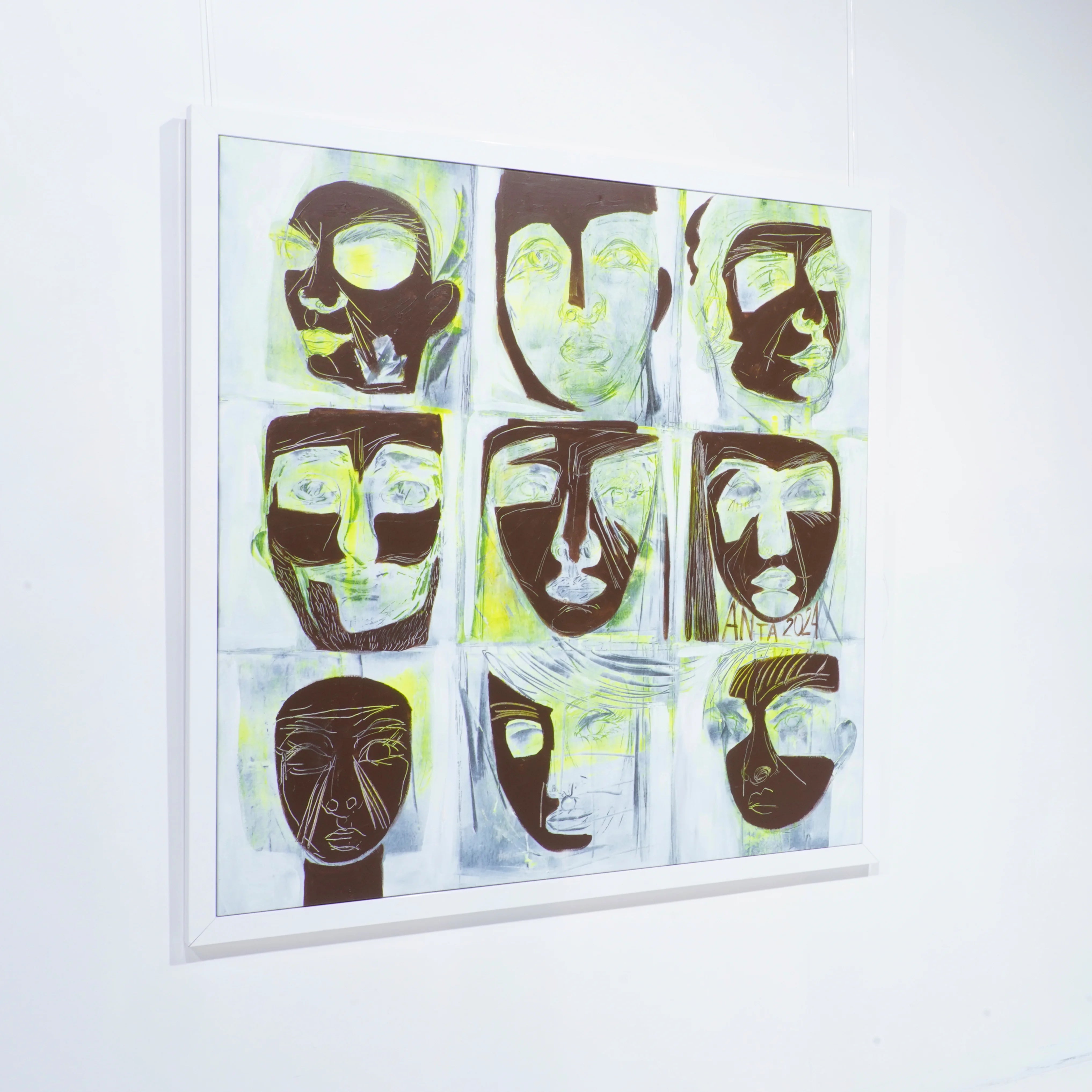 L’œuvre met en scène une série de visages féminins, fragmentés et réinterprétés à travers un langage artistique expressif. Chaque portrait dévoile une émotion, une identité ou une attitude différente, créant un dialogue entre les figures. Le contraste entre les zones sombres et les touches lumineuses, relevées par des accents de jaune vibrant, donne à l’ensemble une énergie singulière et contemporaine.