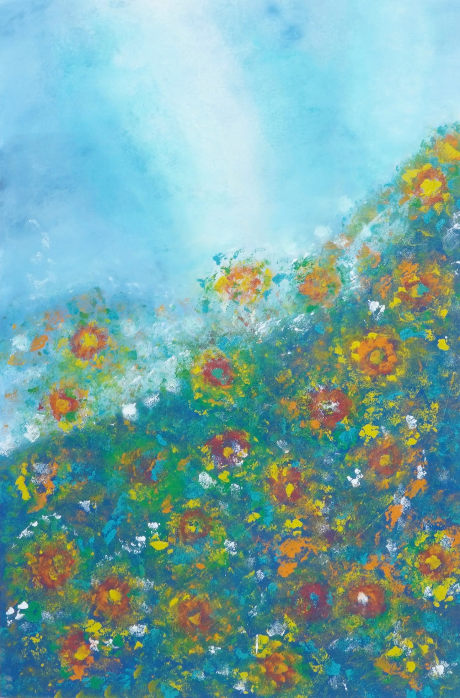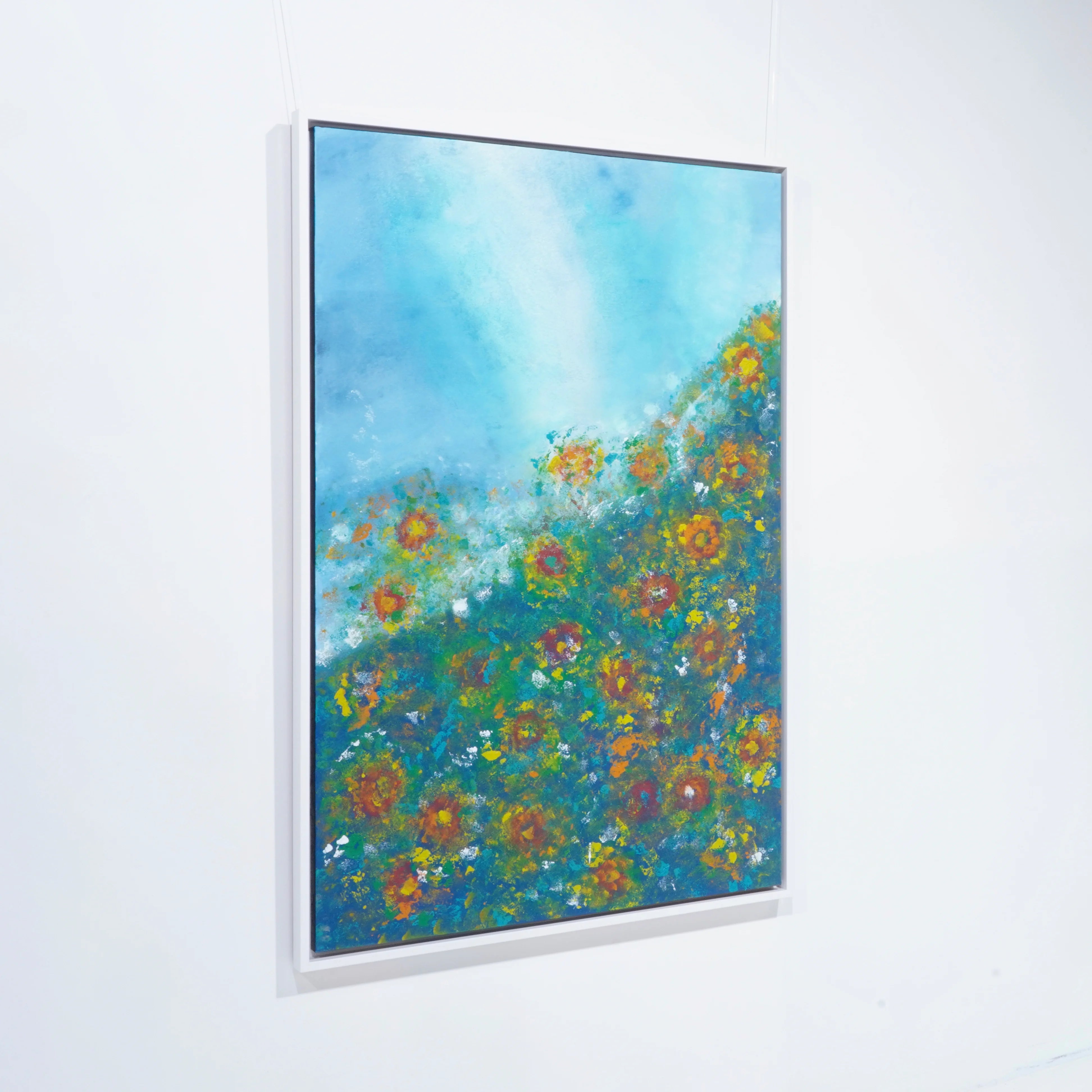 La composition s’organise comme une montée de fleurs et de lumière, dans un mouvement fluide qui conduit le regard vers un ciel clair et apaisé. Les touches colorées, diffuses et vivantes, suggèrent un jardin en pleine respiration, entre abstraction poétique et évocation végétale. La matière, subtilement animée, donne à l’ensemble profondeur, texture et vibration, tandis que l’équilibre entre fraîcheur chromatique et chaleur florale confère à l’œuvre une présence délicate mais affirmée. Grâce à son raffinement visuel et à son intensité émotionnelle, Paz interior llena de flores s’impose comme un tableau contemporain haut de gamme, idéal pour sublimer un intérieur élégant, un espace de réception ou une collection privée.