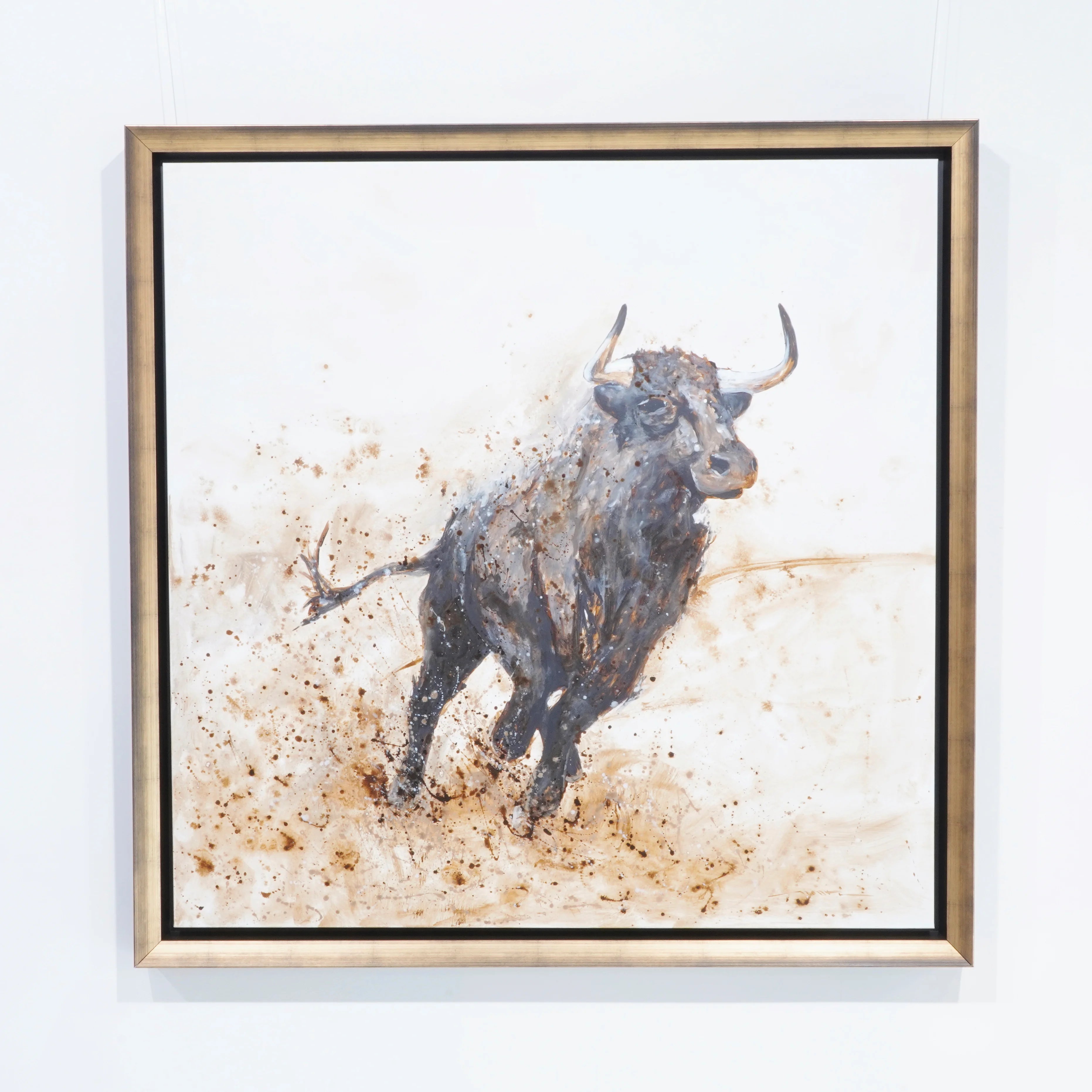 The Bull 2026 est une œuvre contemporaine signée Monti, artiste espagnol de la région d’Alicante, réalisée en acrylique sur toile au format 132 x 132 cm. Cette composition magistrale met en scène un taureau au galop, saisi dans toute la puissance de son élan, entre tension, noblesse et énergie brute. L’ensemble est sublimé par un encadrement de luxe en bois massif noir et or, dont la présence renforce immédiatement le caractère prestigieux et affirmé de l’œuvre.