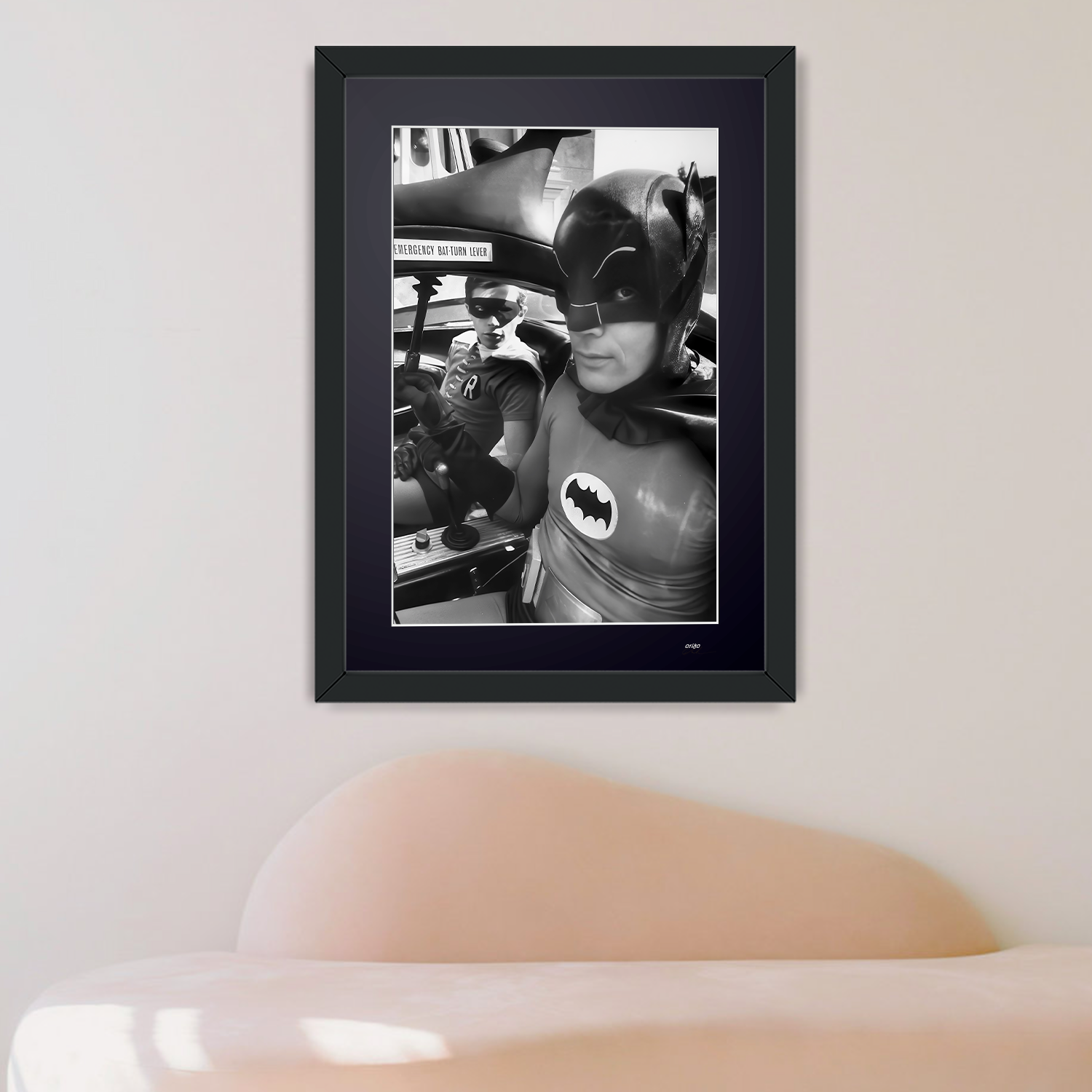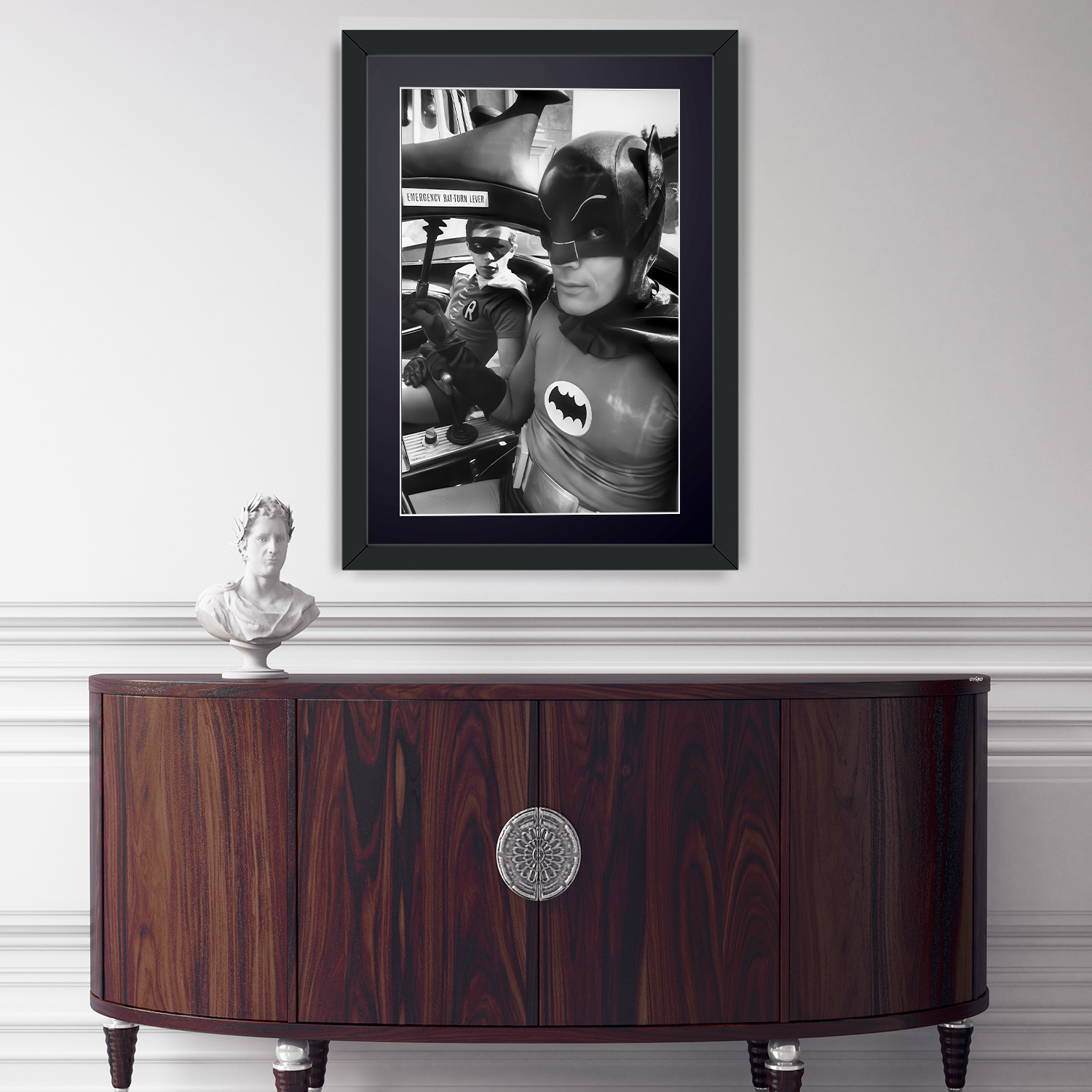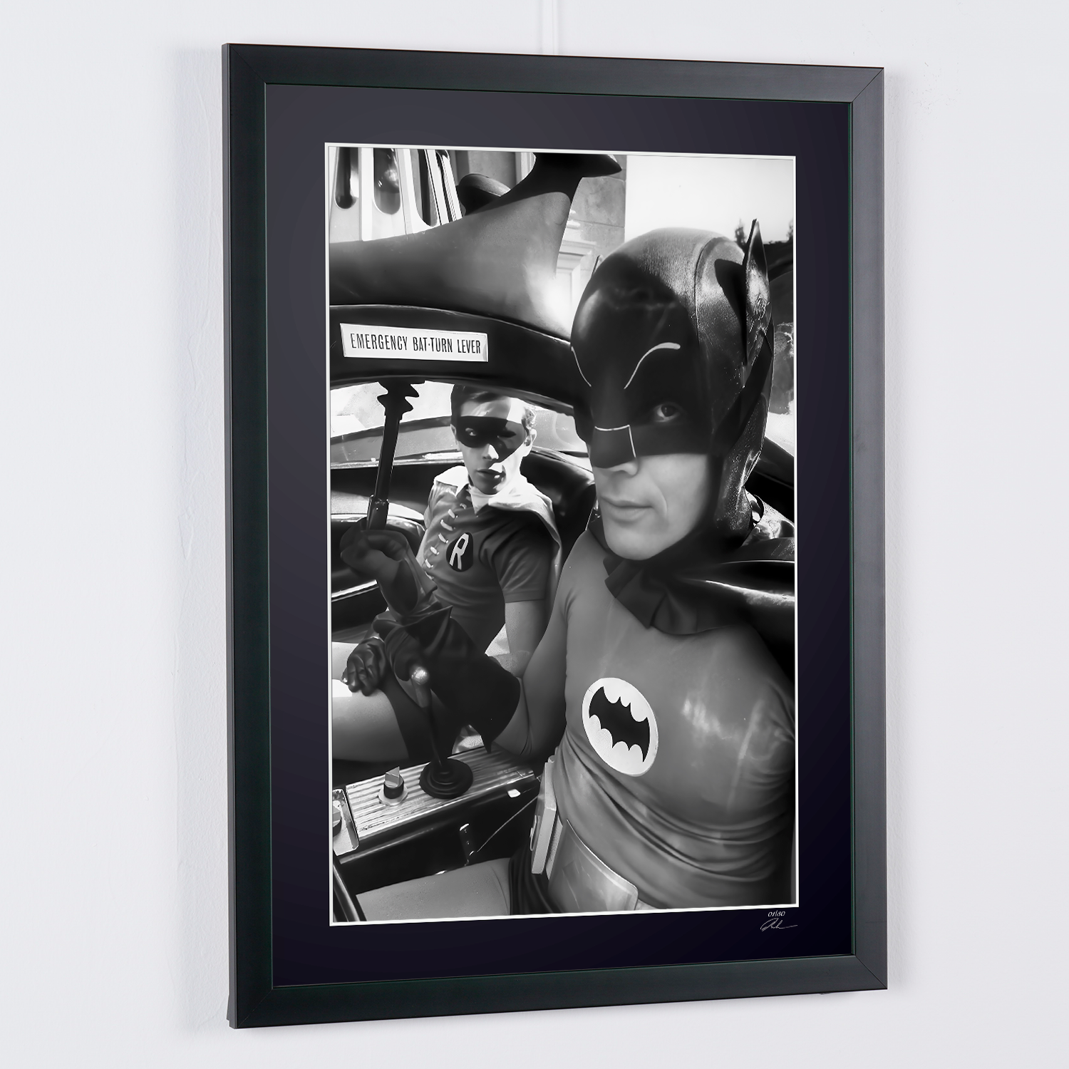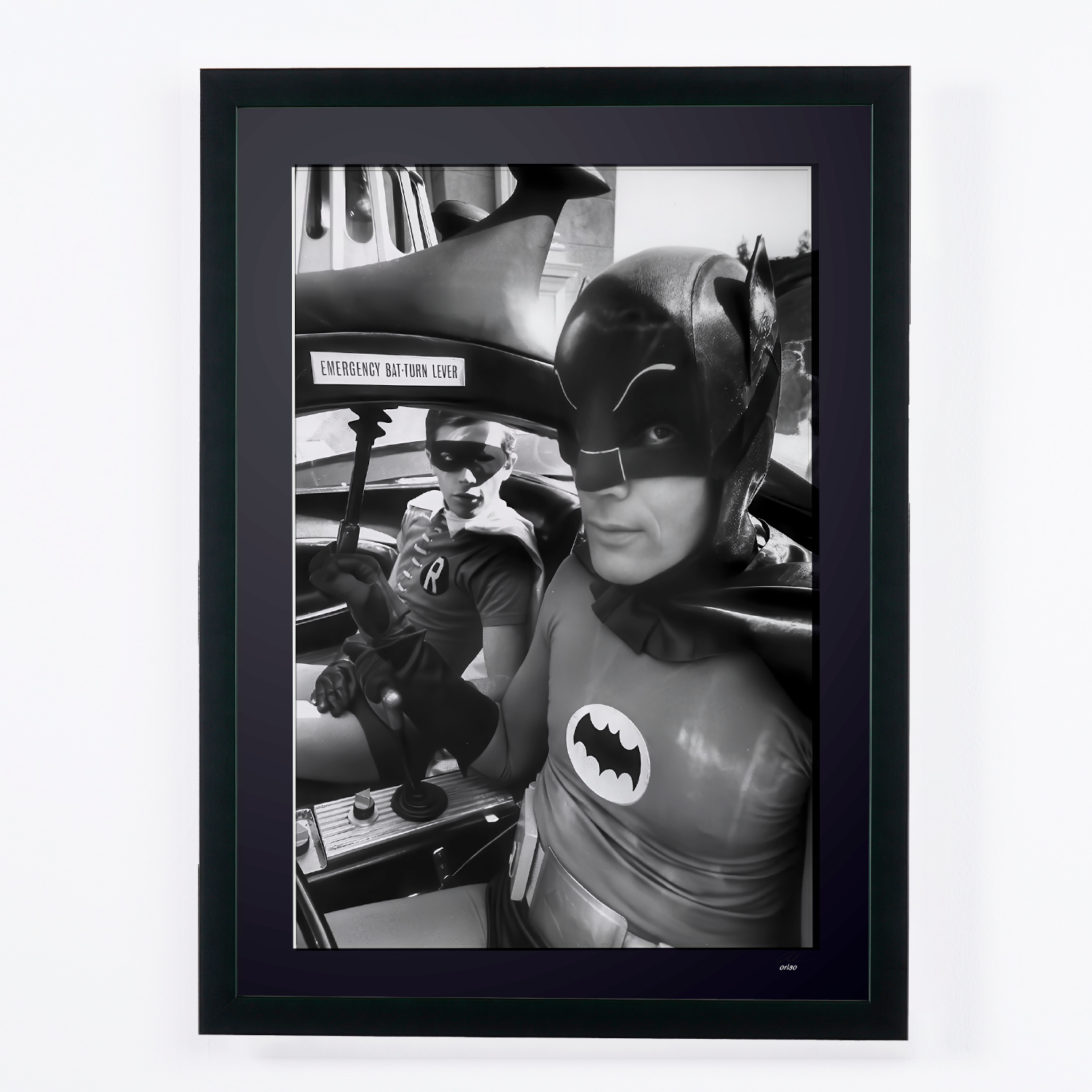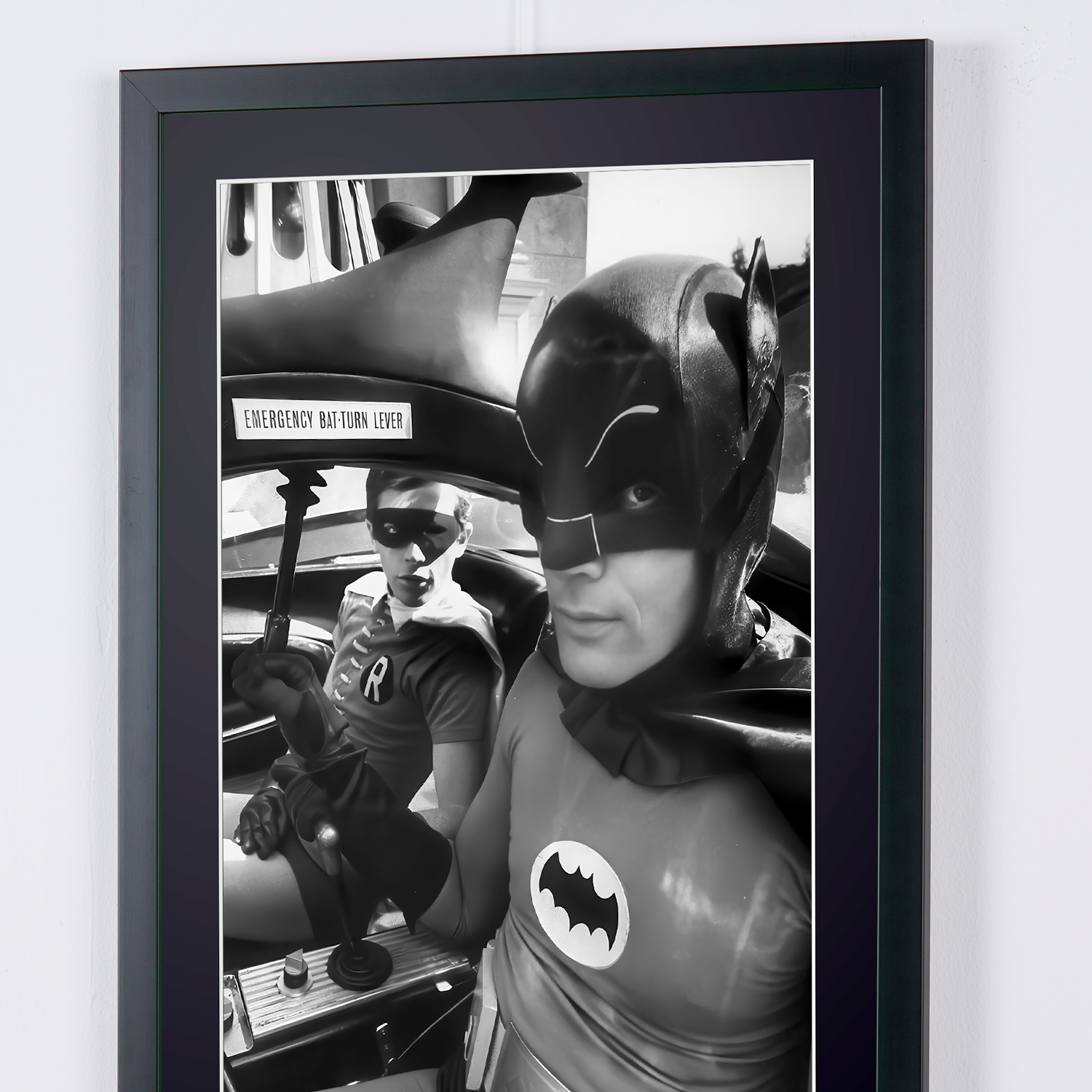 Photo encadrée de "Batman The Movie (1966) - Adam West with Burt Ward in the Batmobile" — Tirage d'art noir et blanc sur papier Fine Art 70x50 cm
