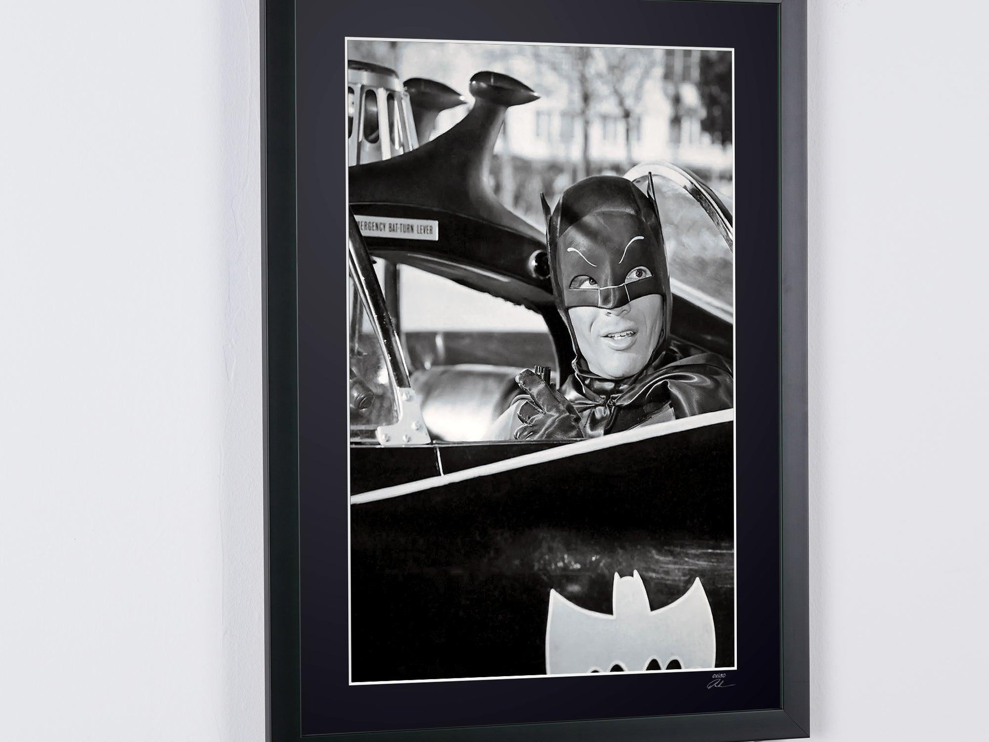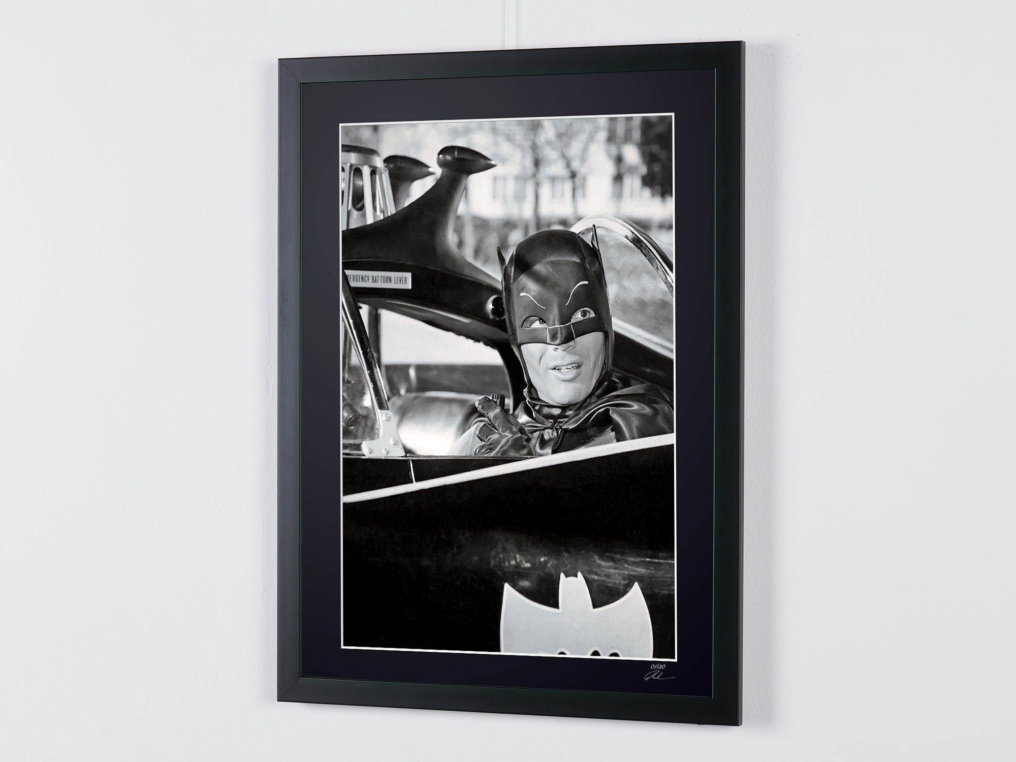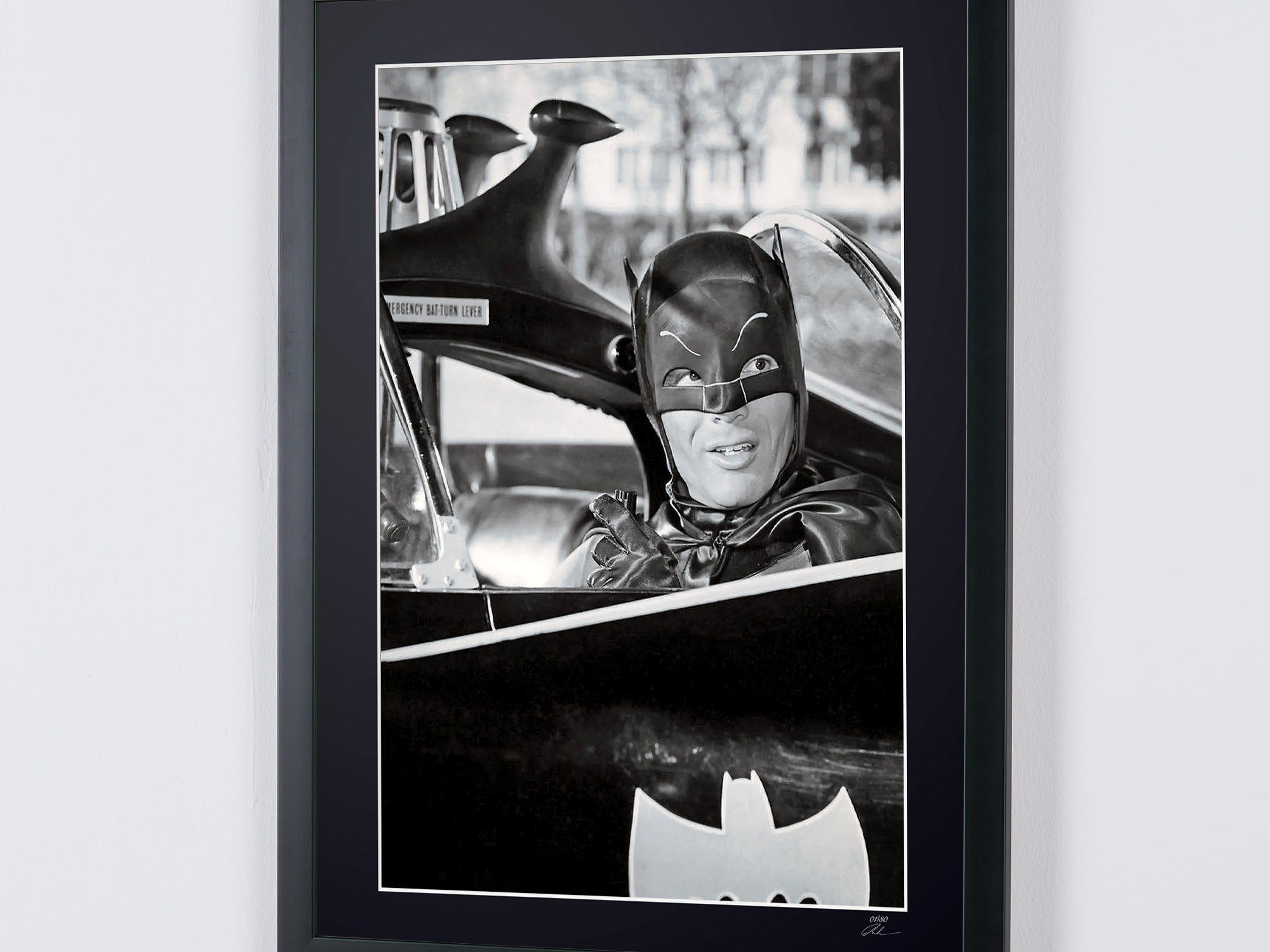 Gerahmtes Foto von „Batman – Classic TV 1966 – Adam West hinter den Kulissen“ — Schwarz-Weiß-Kunstdruck auf Fine-Art-Papier 70 x 50 cm