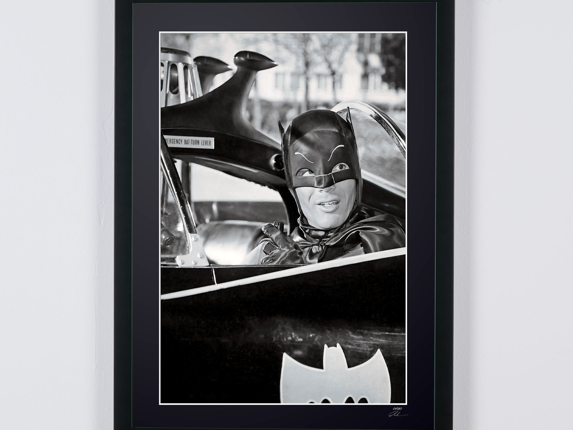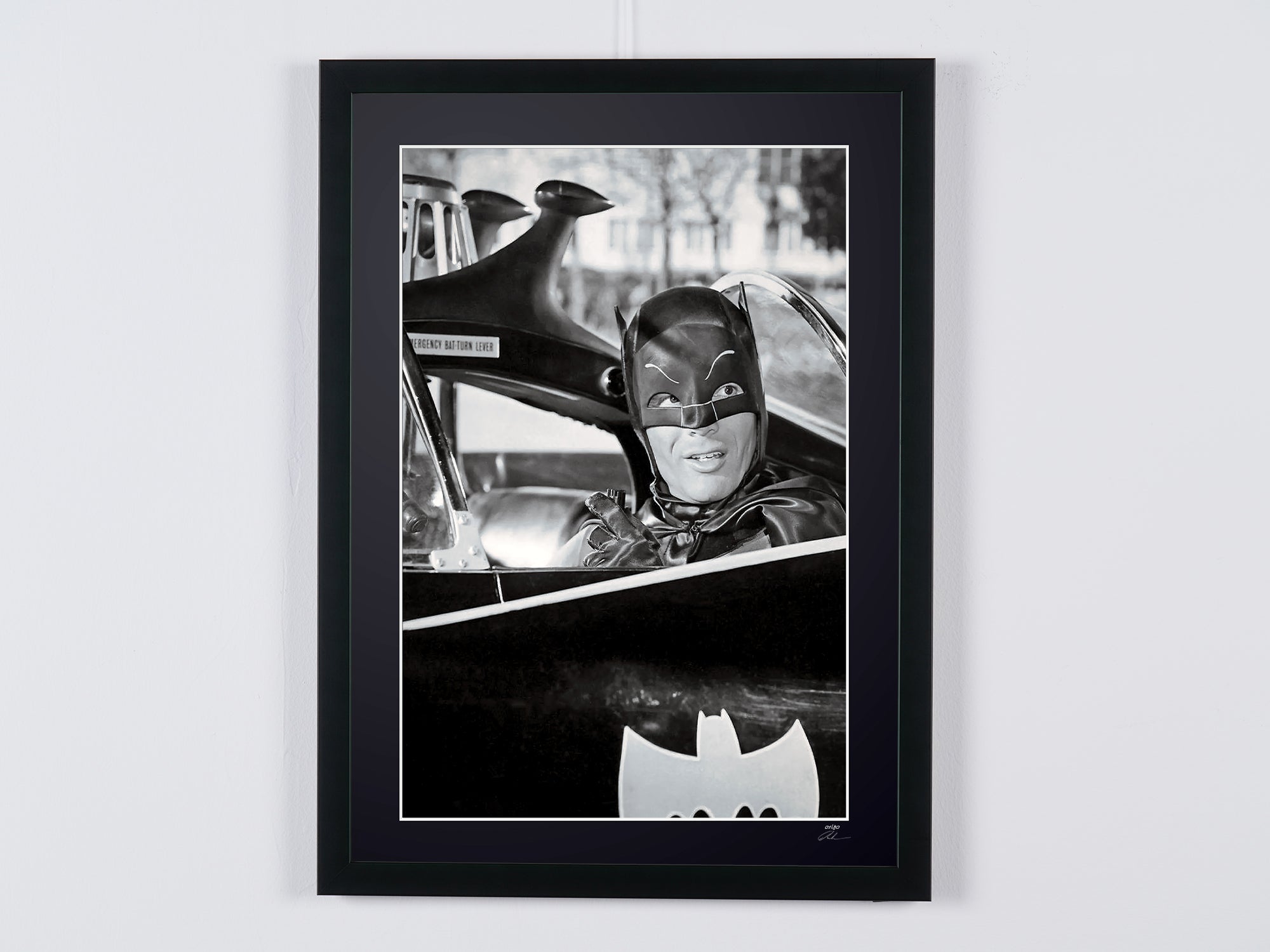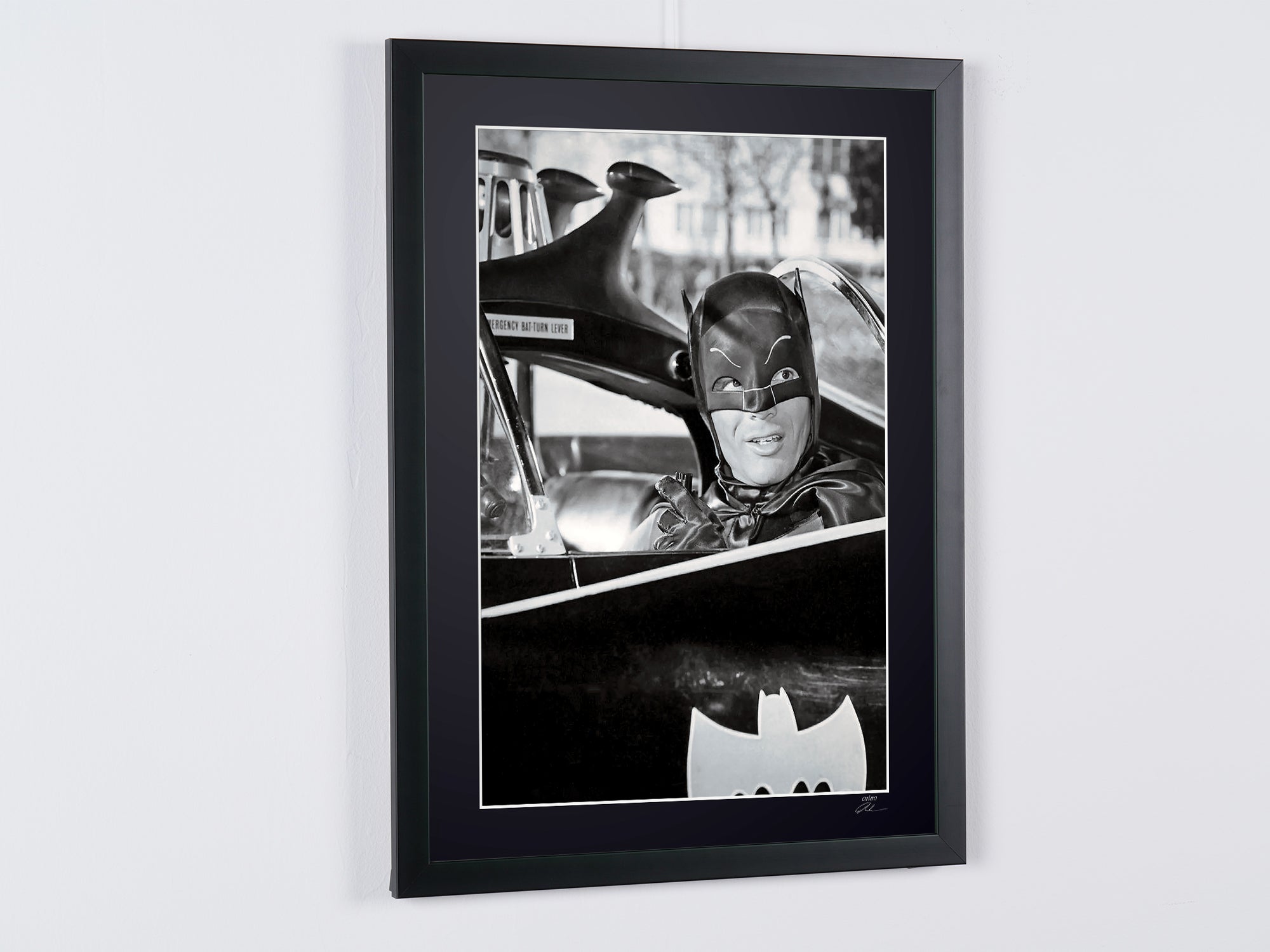 Gerahmtes Foto von „Batman – Classic TV 1966 – Adam West hinter den Kulissen“ — Schwarz-Weiß-Kunstdruck auf Fine-Art-Papier 70 x 50 cm