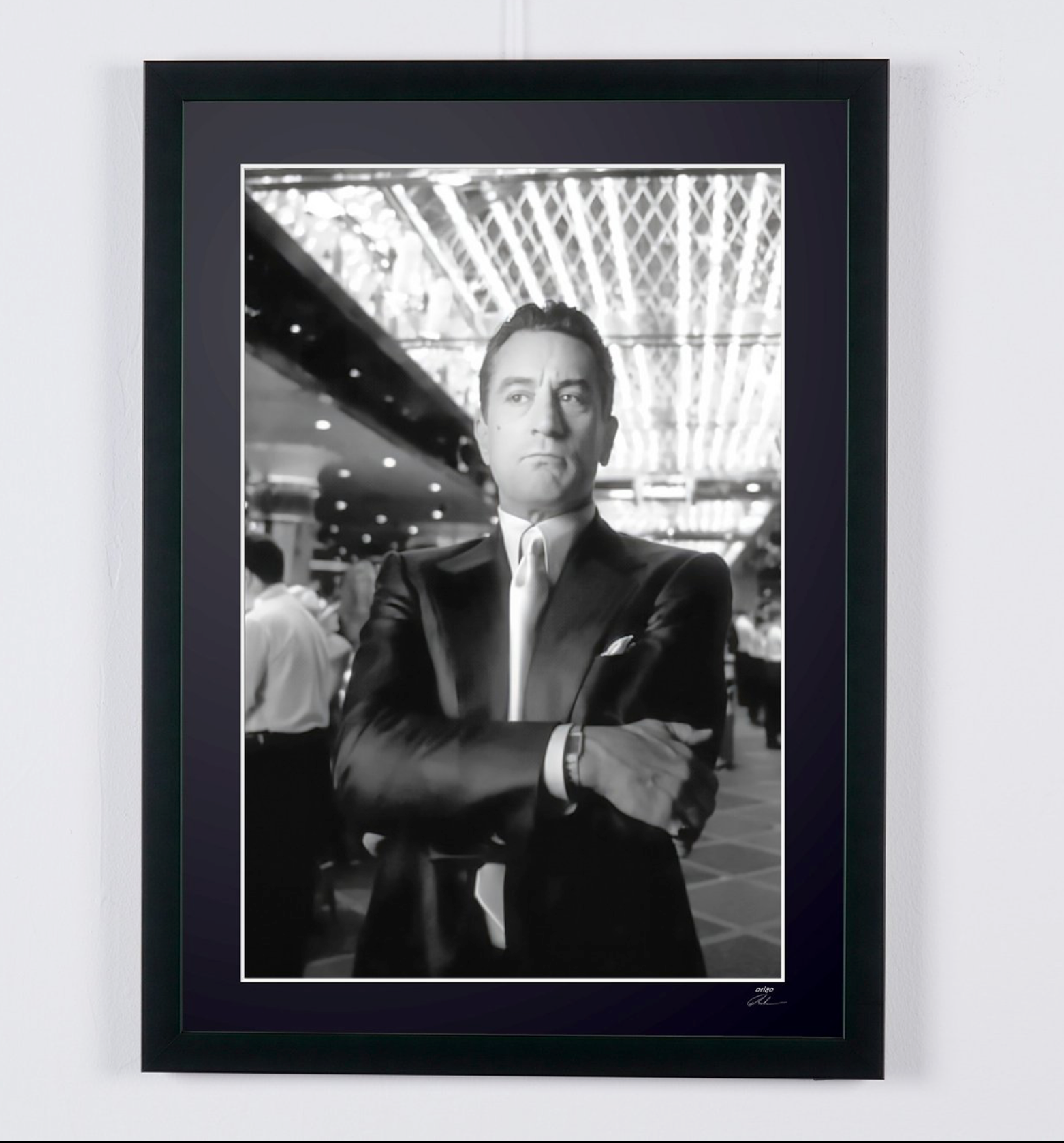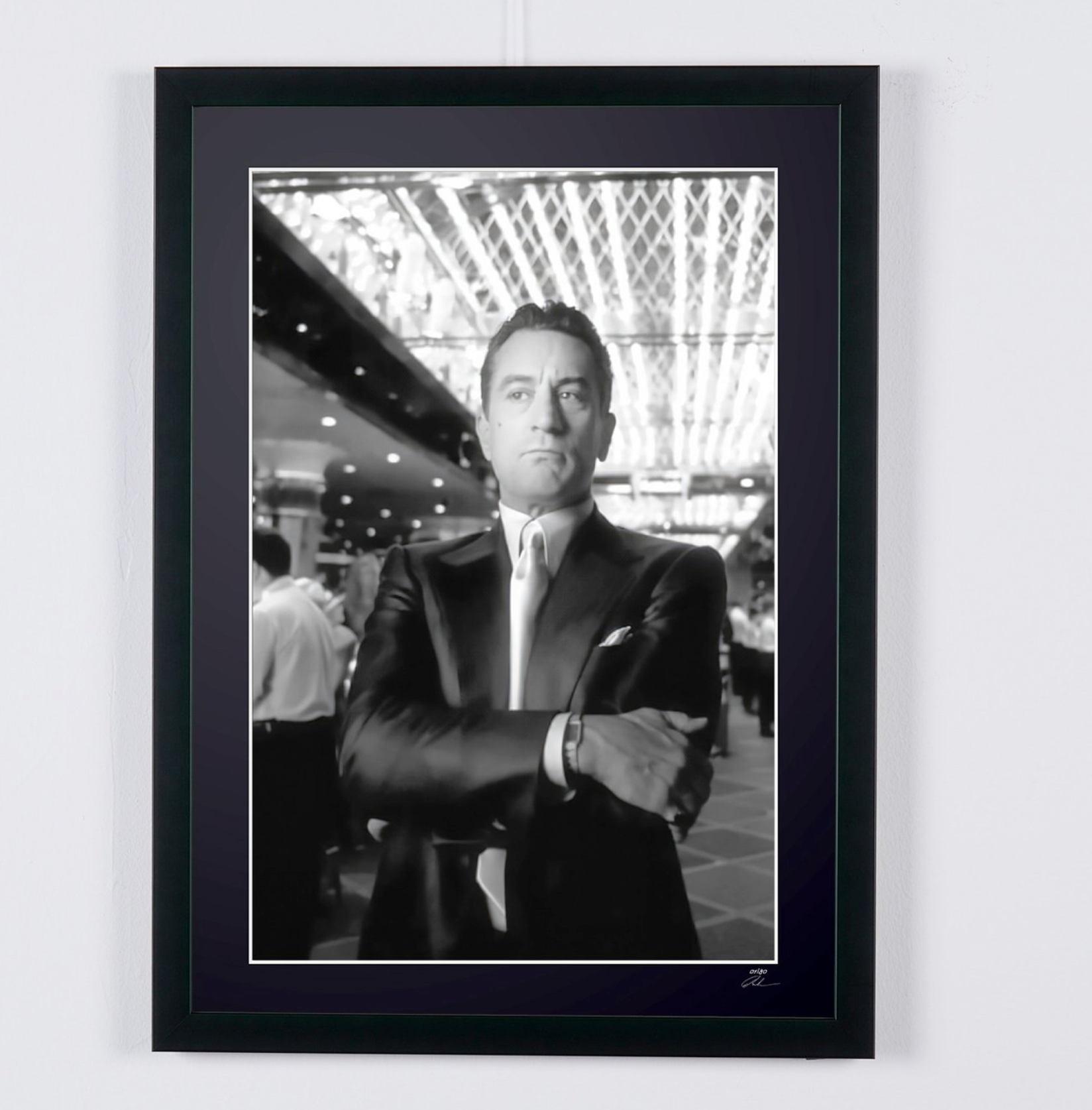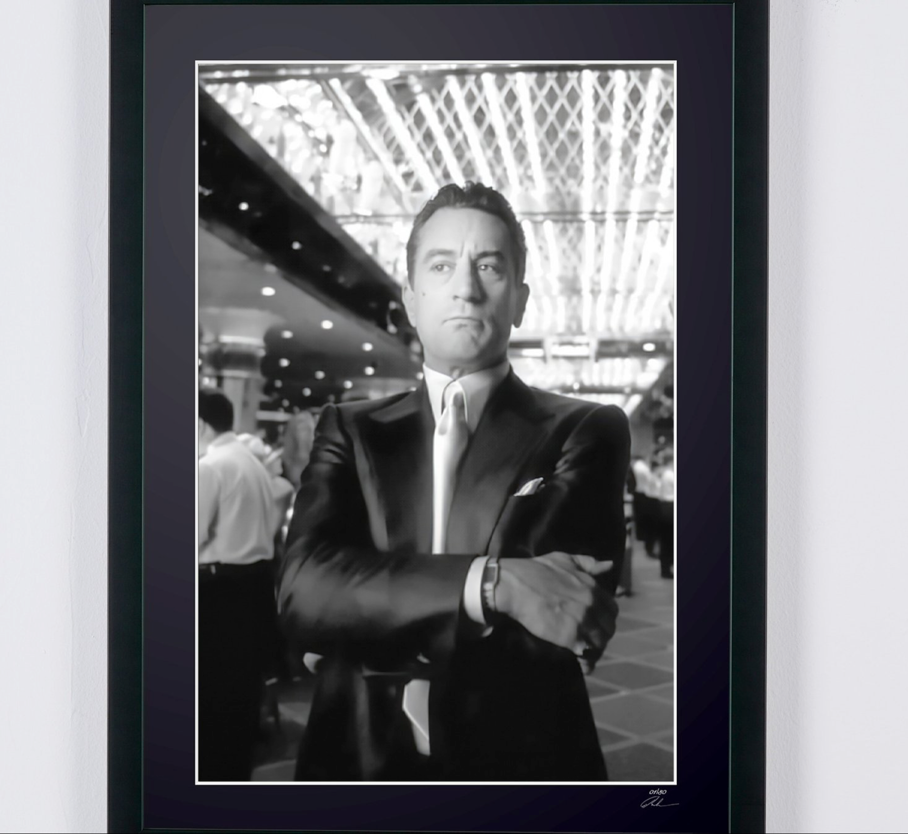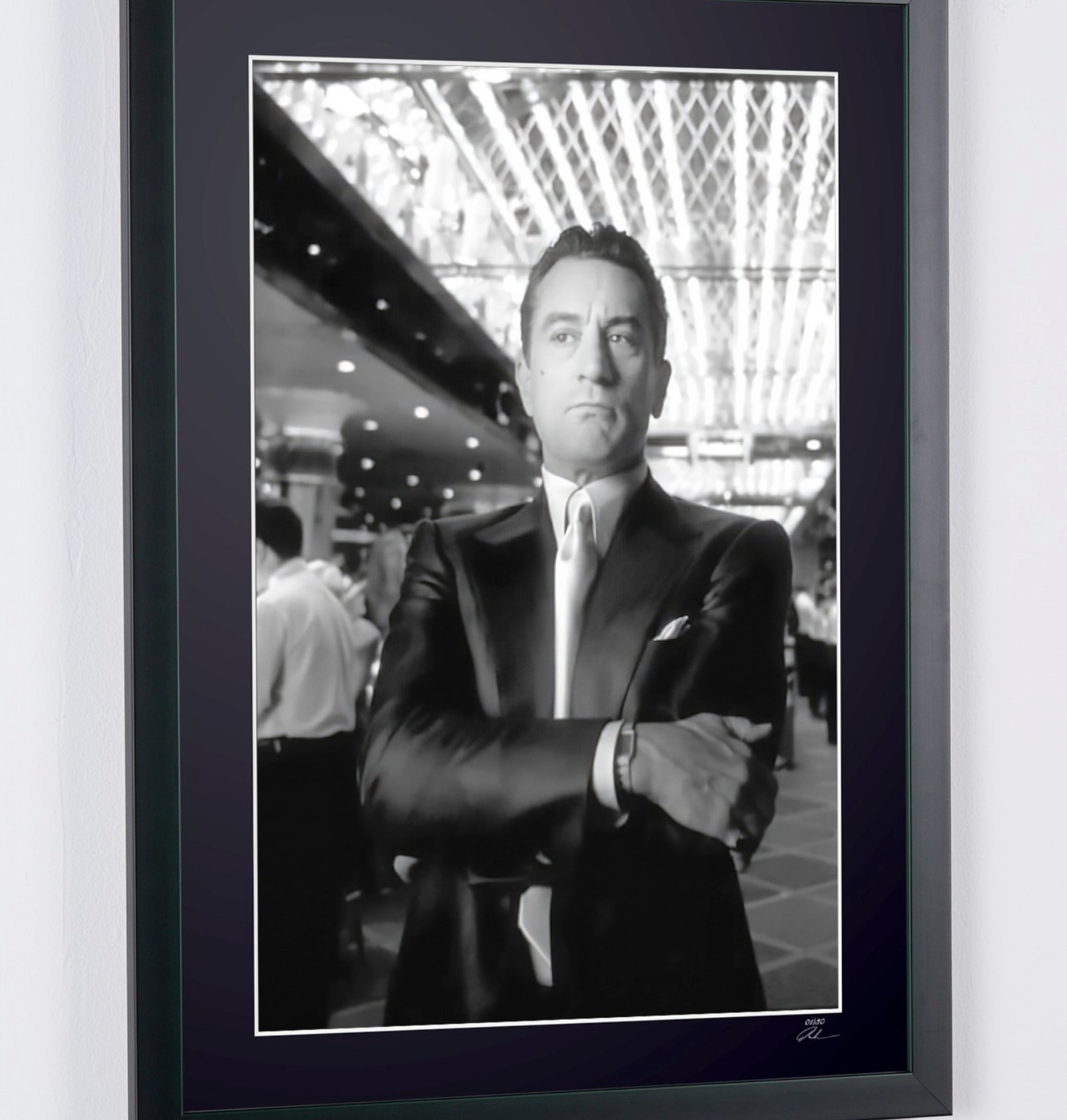 Cette photographie immortalise Robert De Niro dans son rôle mythique de Sam "Ace" Rothstein, directeur du casino Tangiers dans le chef-d'œuvre de Martin Scorsese. Tourné principalement au Riviera Hotel & Casino de Las Vegas, Casino révèle la méticulosité légendaire de Robert De Niro qui a étudié pendant des mois les gestes et manières de Frank Rosenthal, le véritable patron de casino ayant inspiré son personnage.