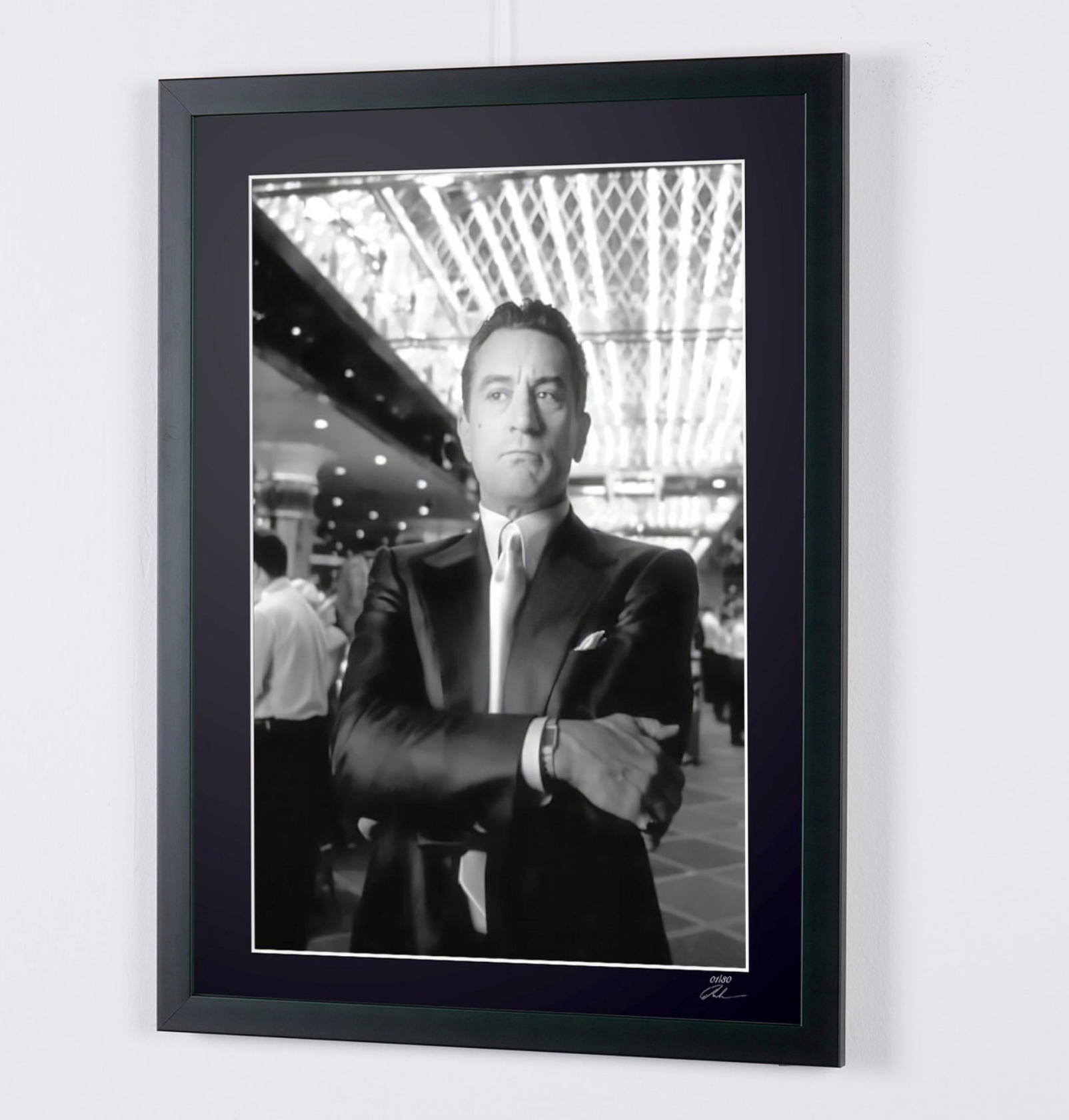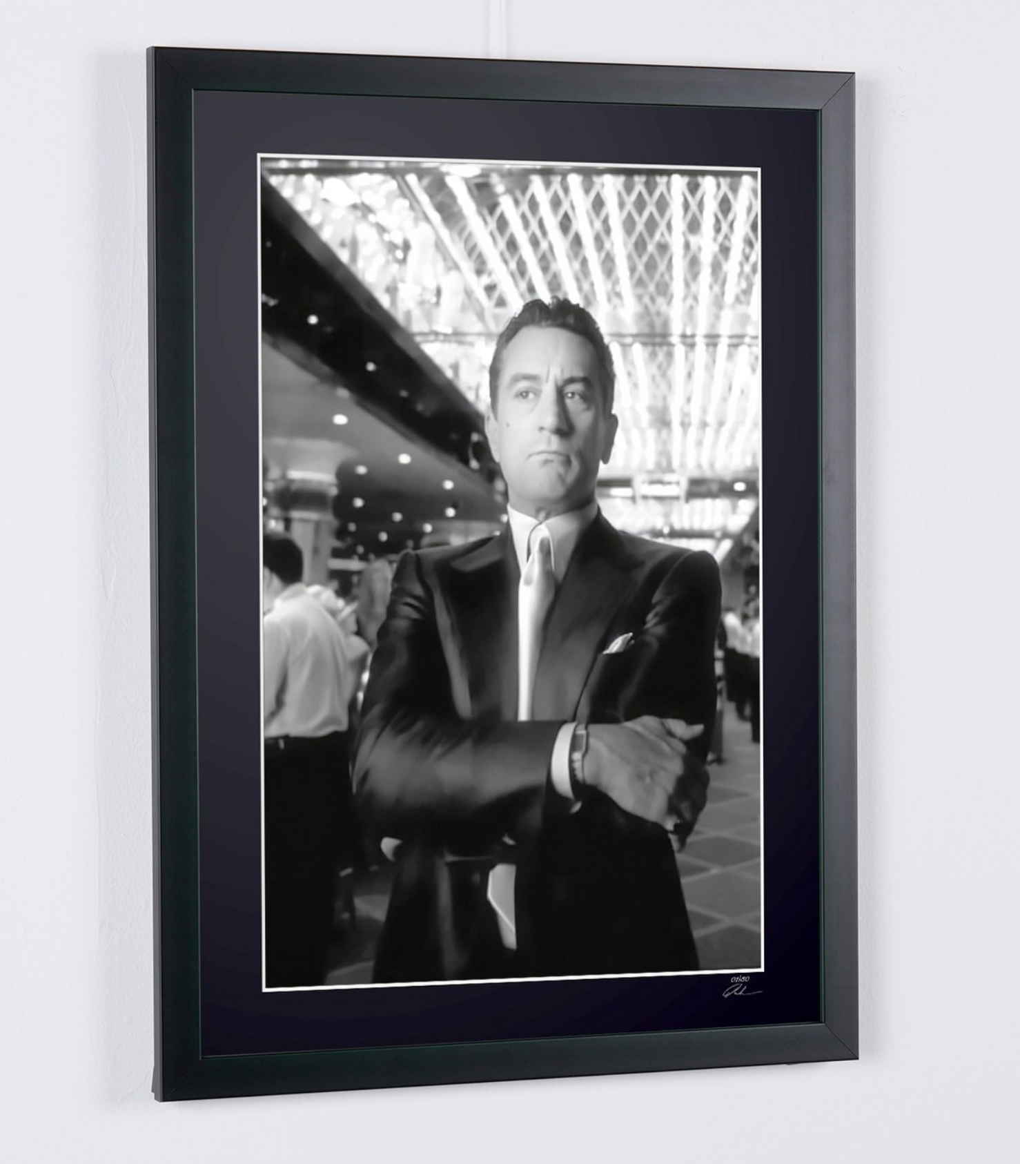Gerahmtes Foto „Casino 1995 – Robert De Niro – Porträt“ — Schwarz-Weiß-Kunstdruck auf Fine-Art-Papier 70 x 50 cm
