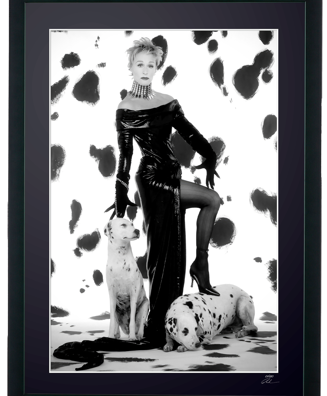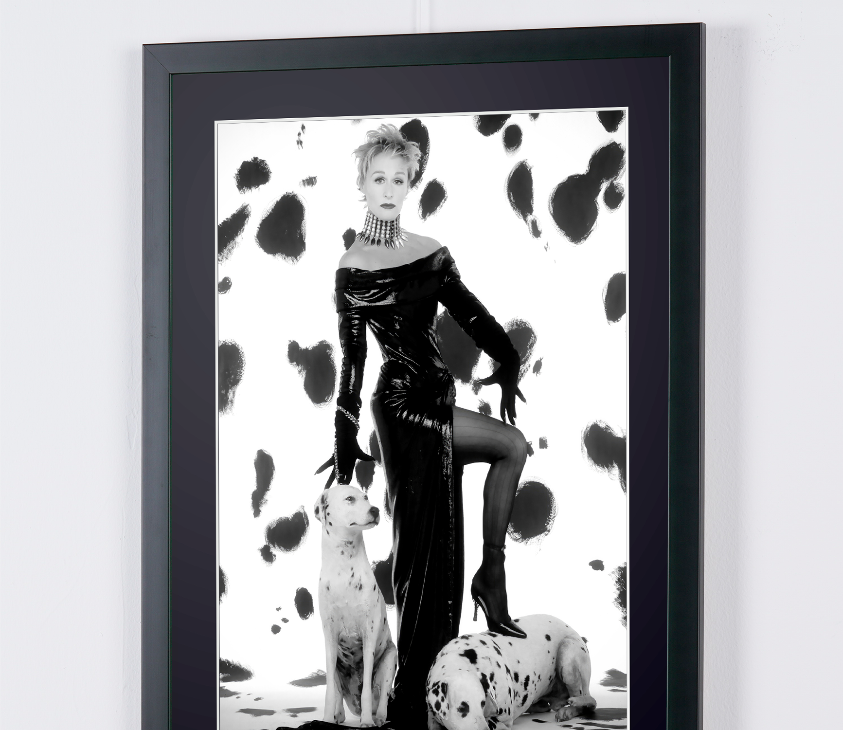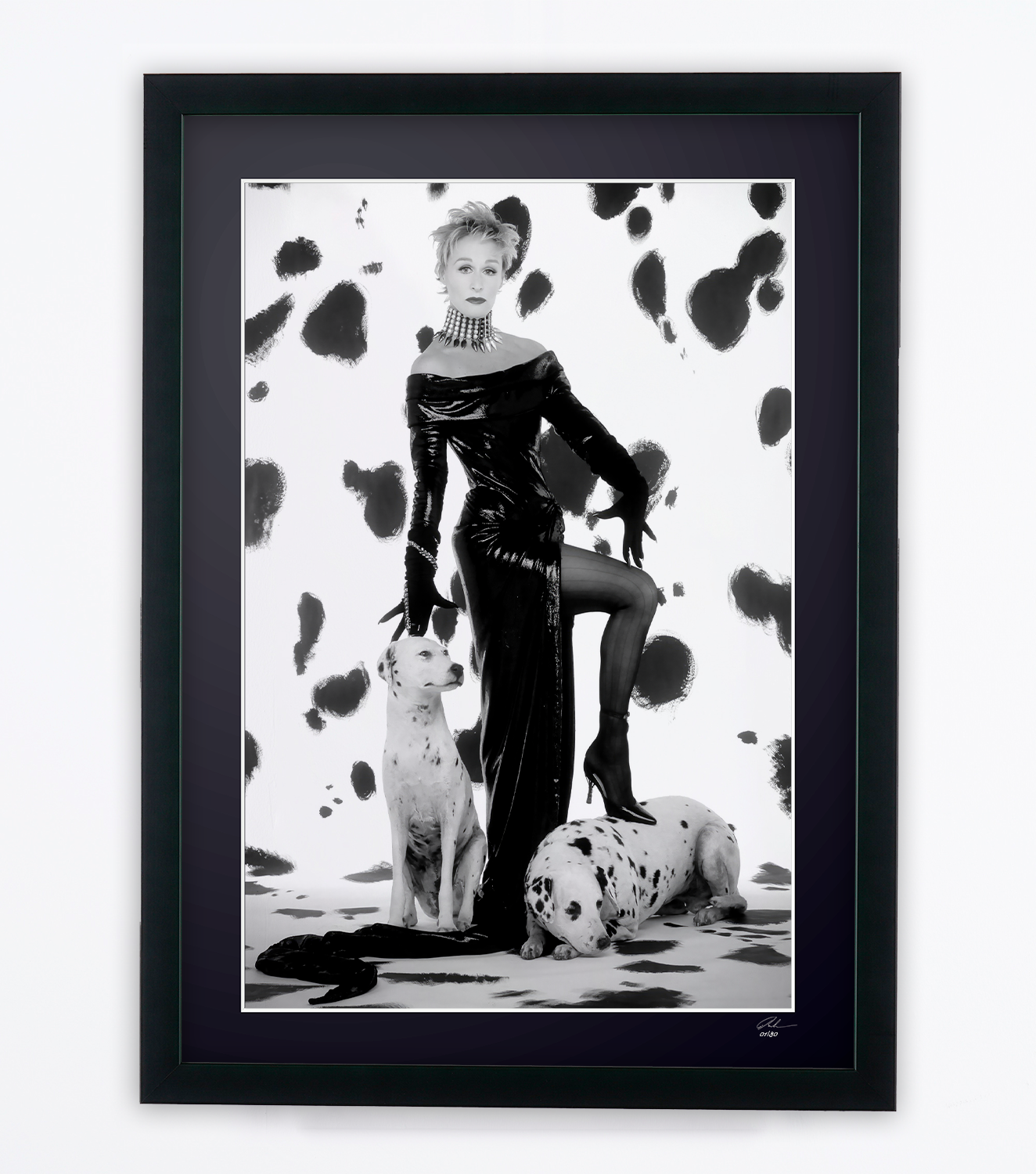 Gerahmtes Foto von „Glenn Close als Cruella DeVil – 101 Dalmatiner“ — Schwarz-Weiß-Kunstdruck auf Fine-Art-Papier 70 x 50 cm