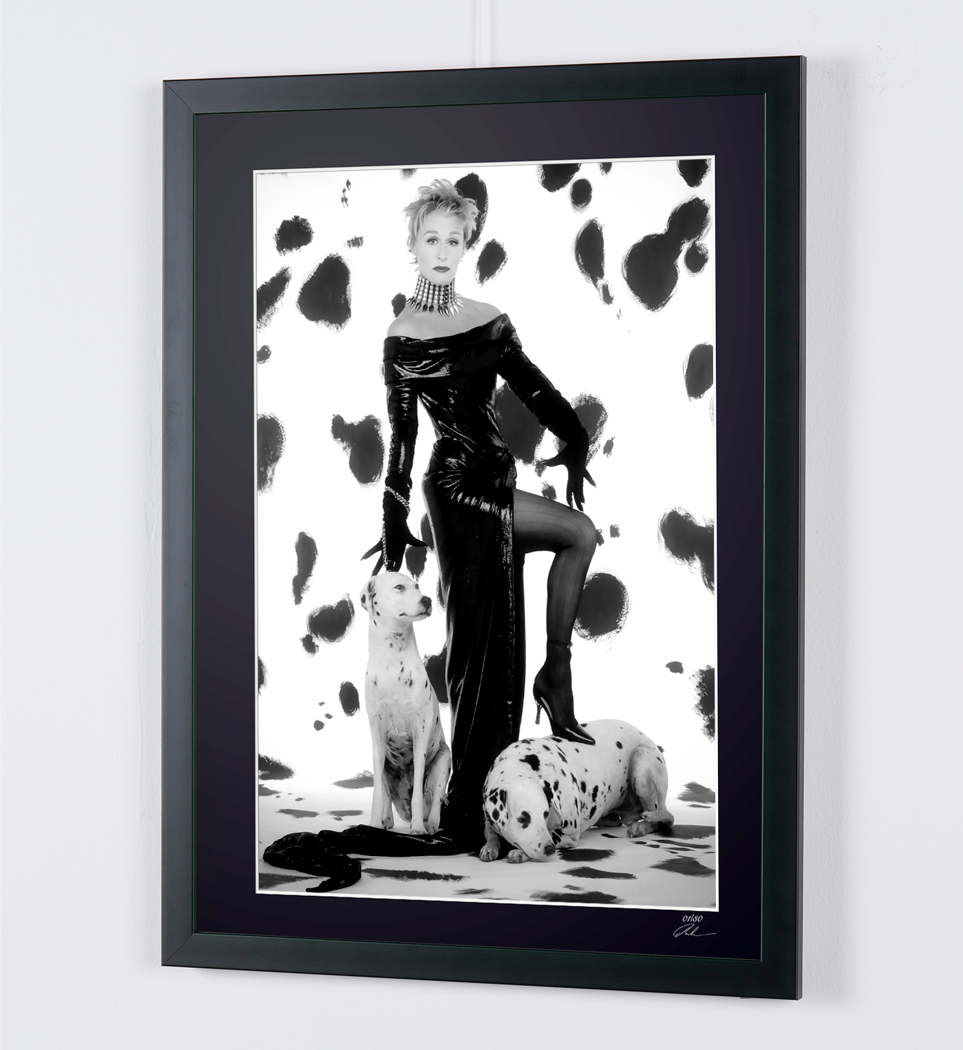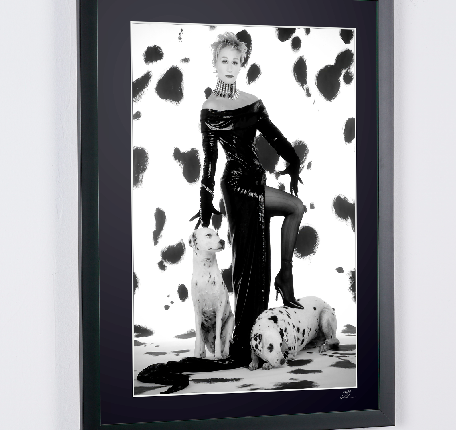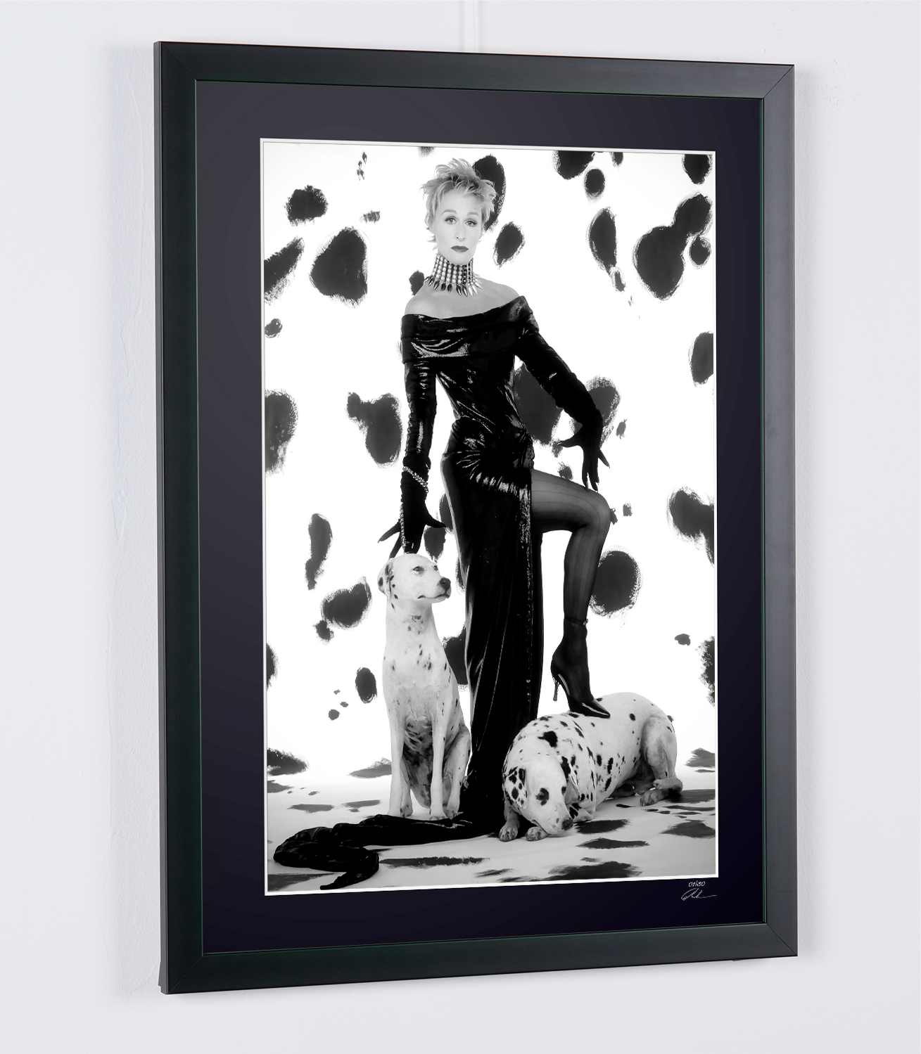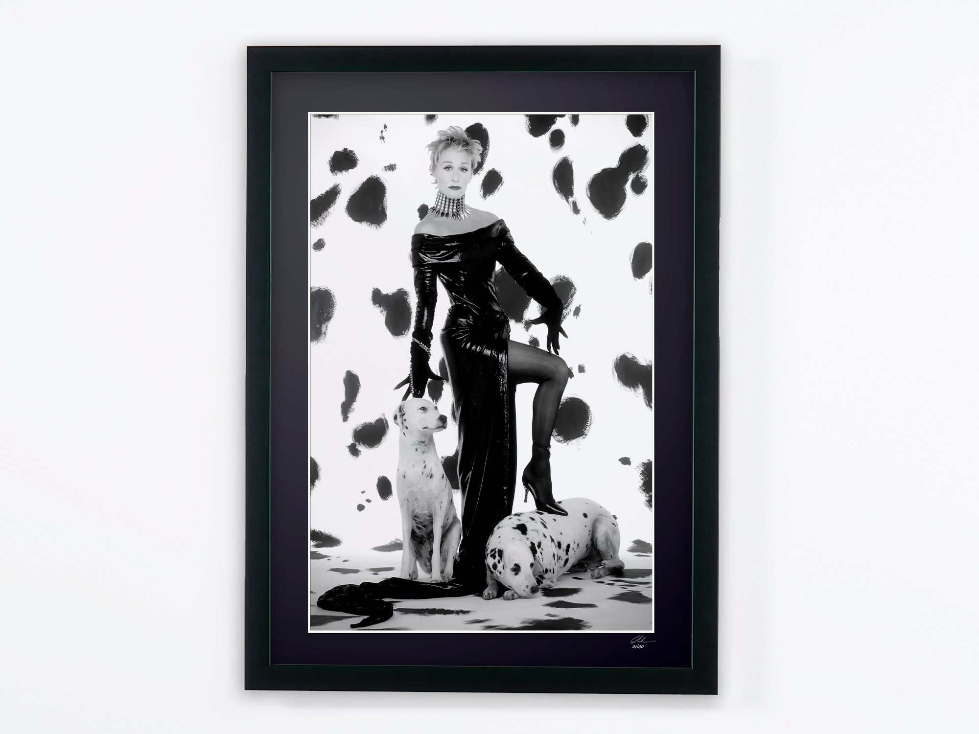 Gerahmtes Foto von „Glenn Close als Cruella DeVil – 101 Dalmatiner“ — Schwarz-Weiß-Kunstdruck auf Fine-Art-Papier 70 x 50 cm
