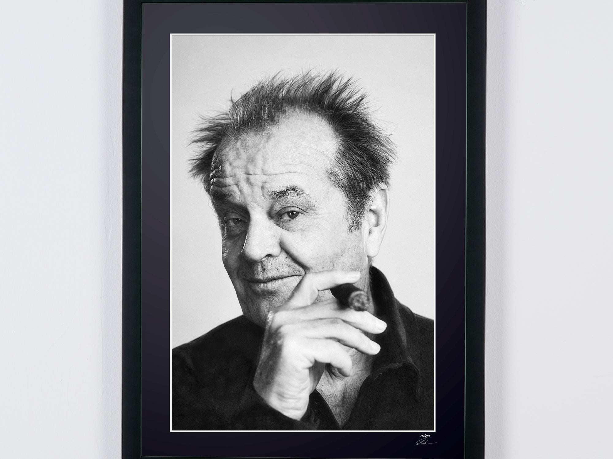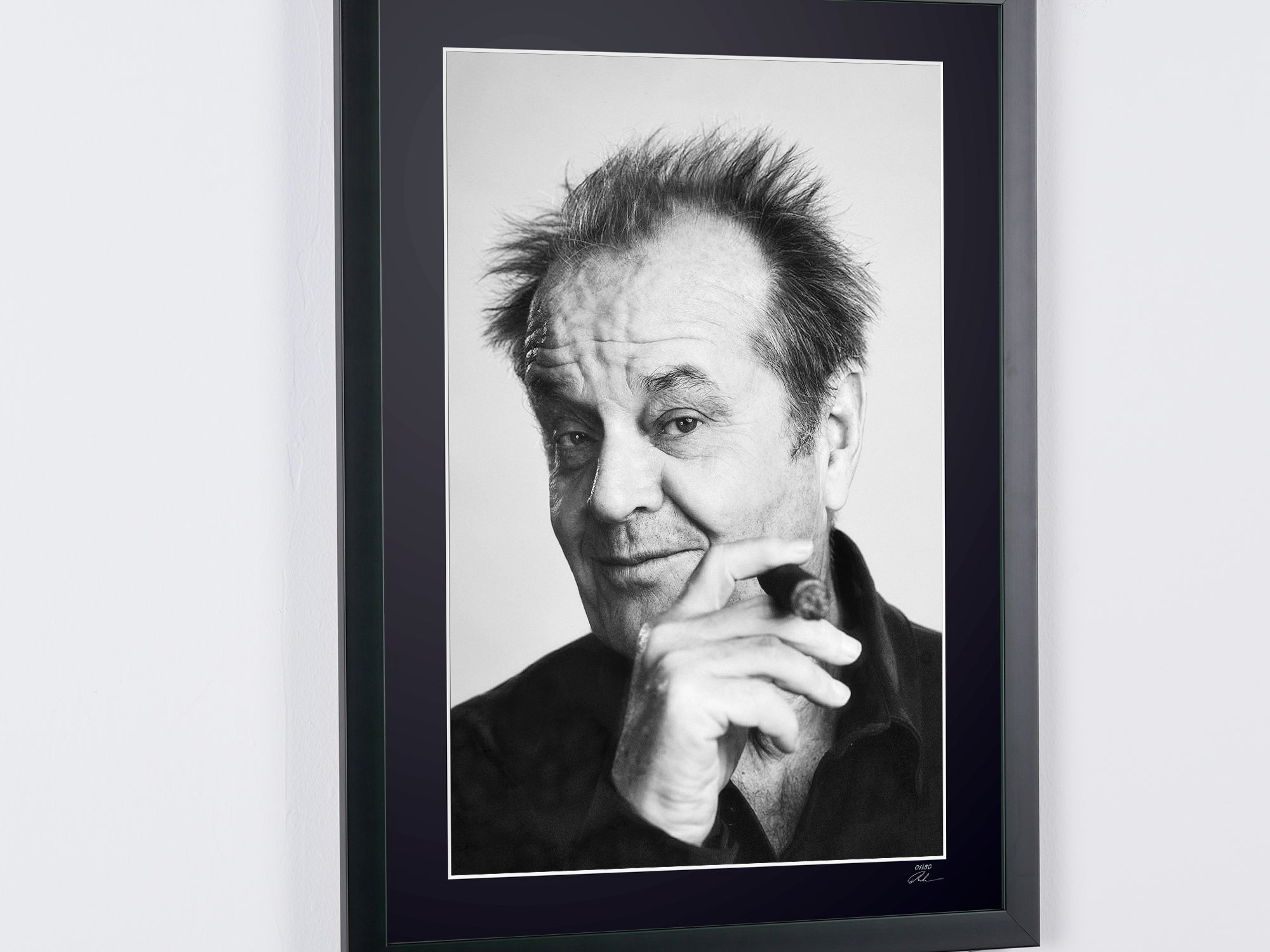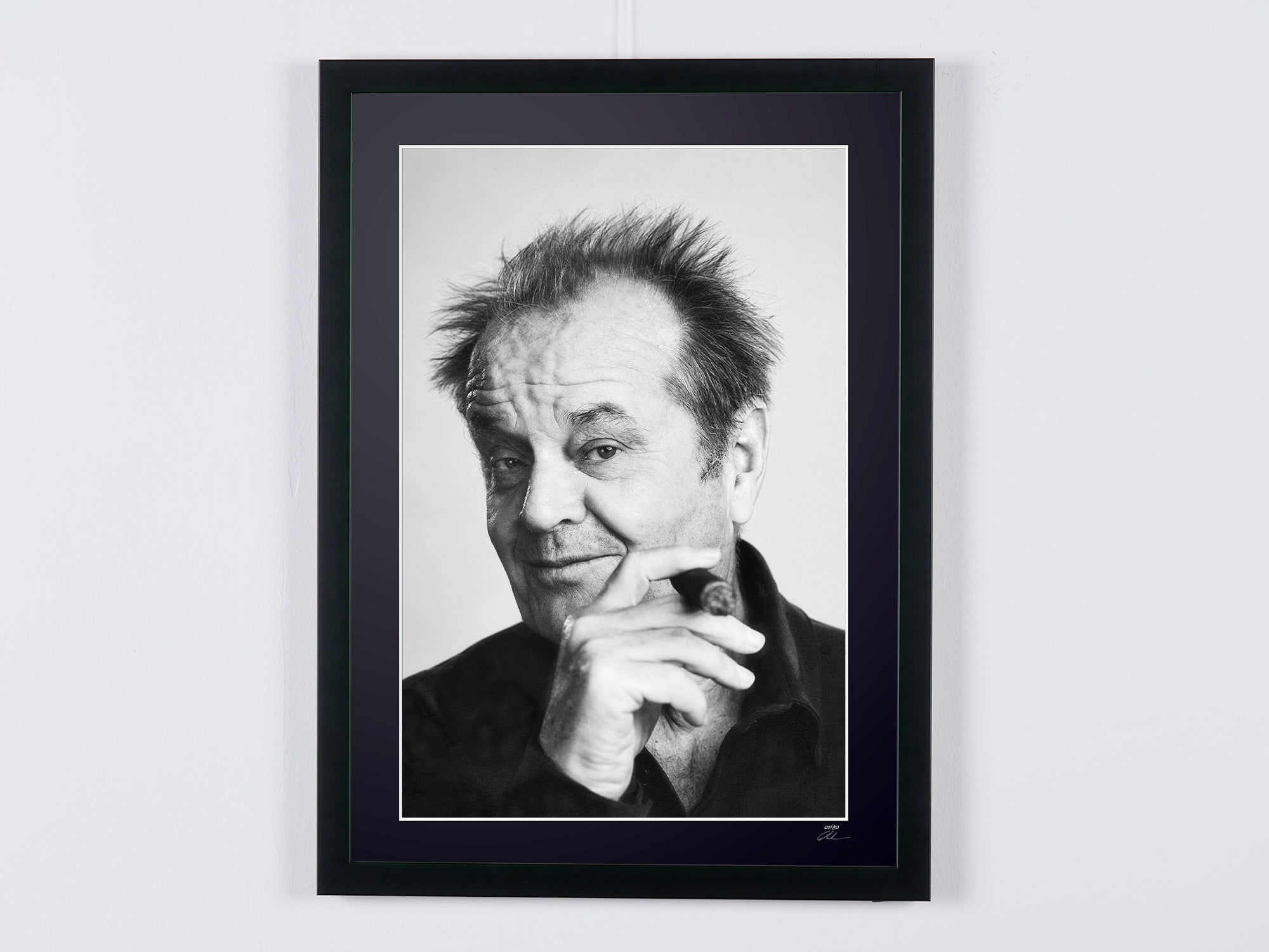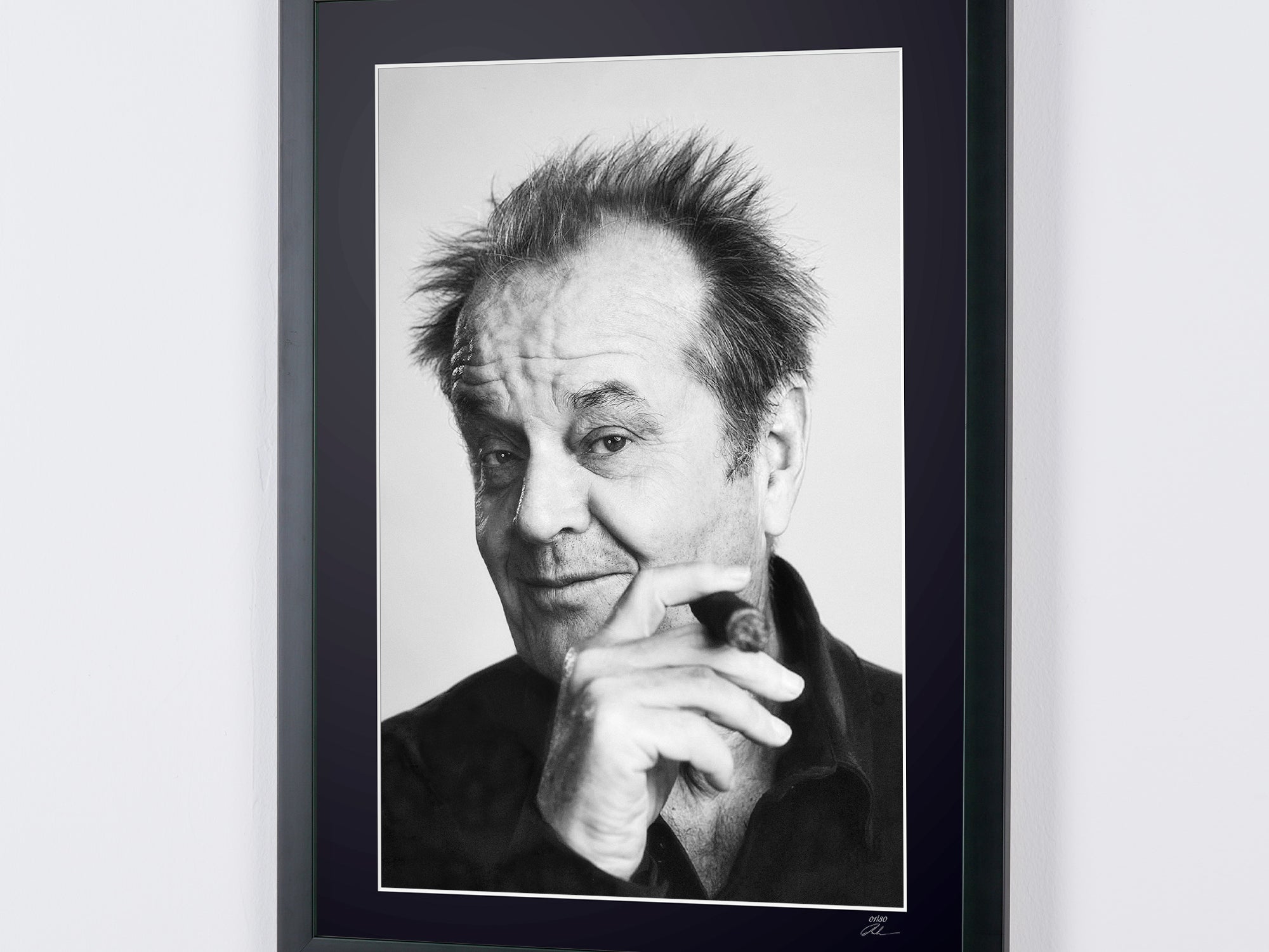 Photo encadrée de "Jack Nicholson Portrait (with cigar)" — Tirage d'art noir et blanc sur papier Fine Art 70x50 cm