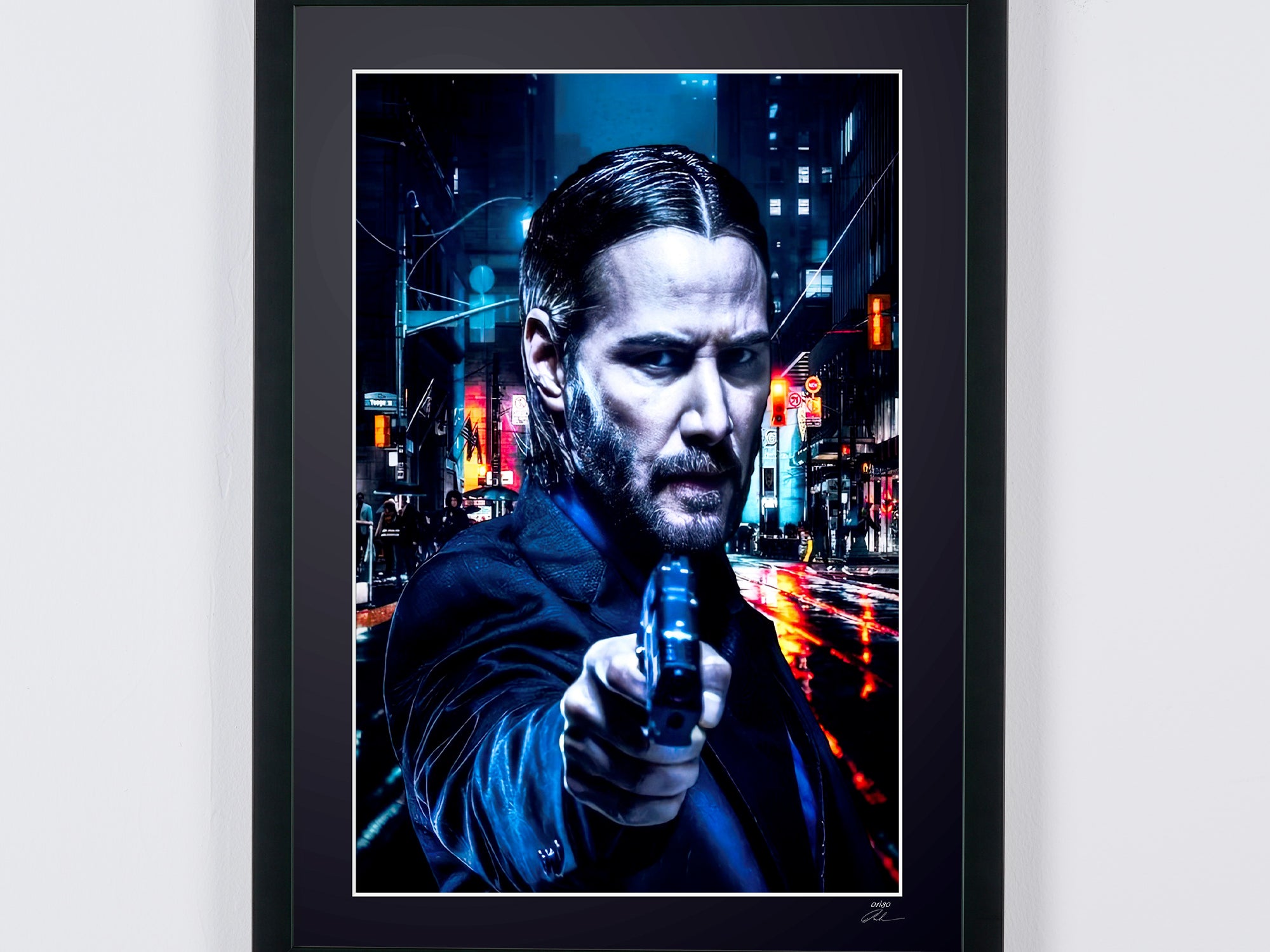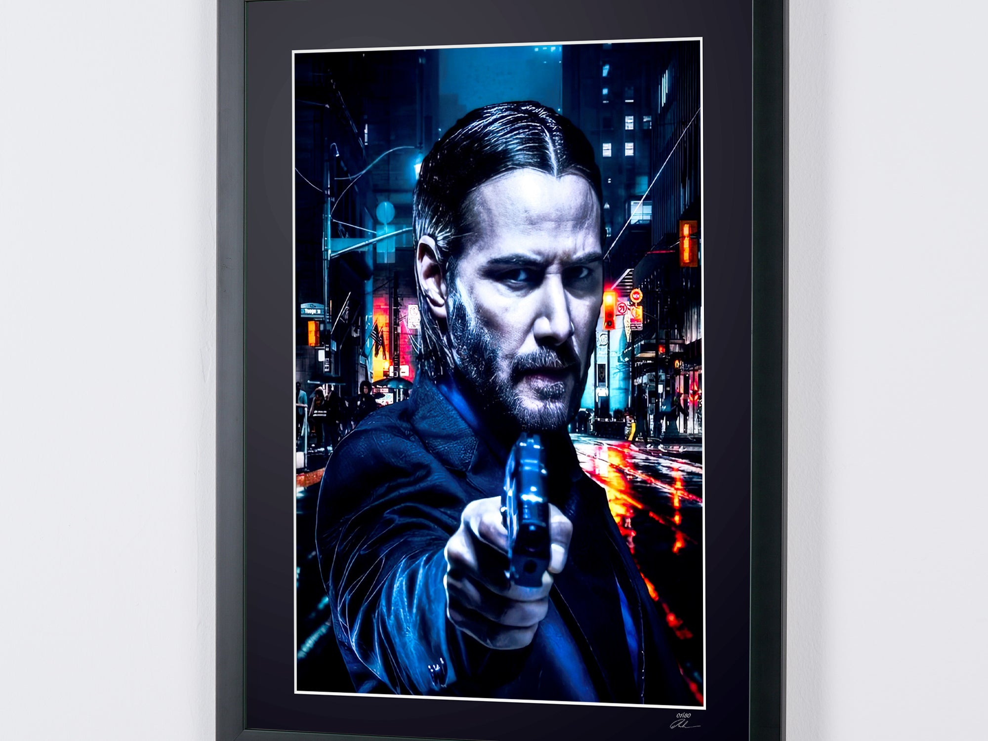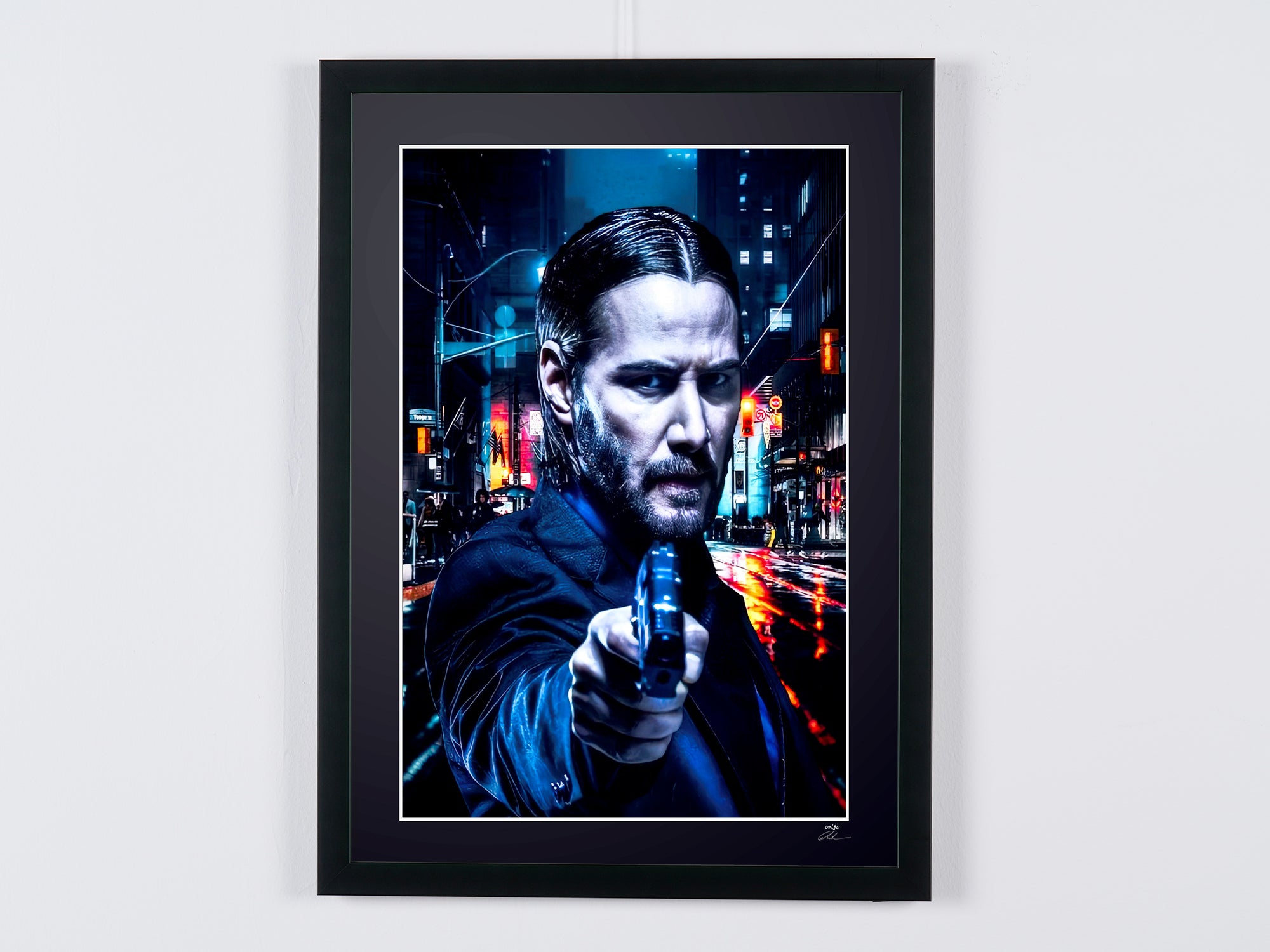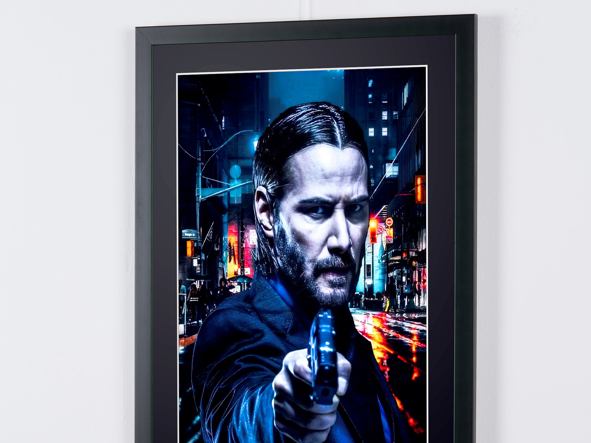 Gerahmtes Foto von „John Wick – Keanu Reeves als John Wick“ — Schwarz-Weiß-Kunstdruck auf Fine-Art-Papier 70 x 50 cm