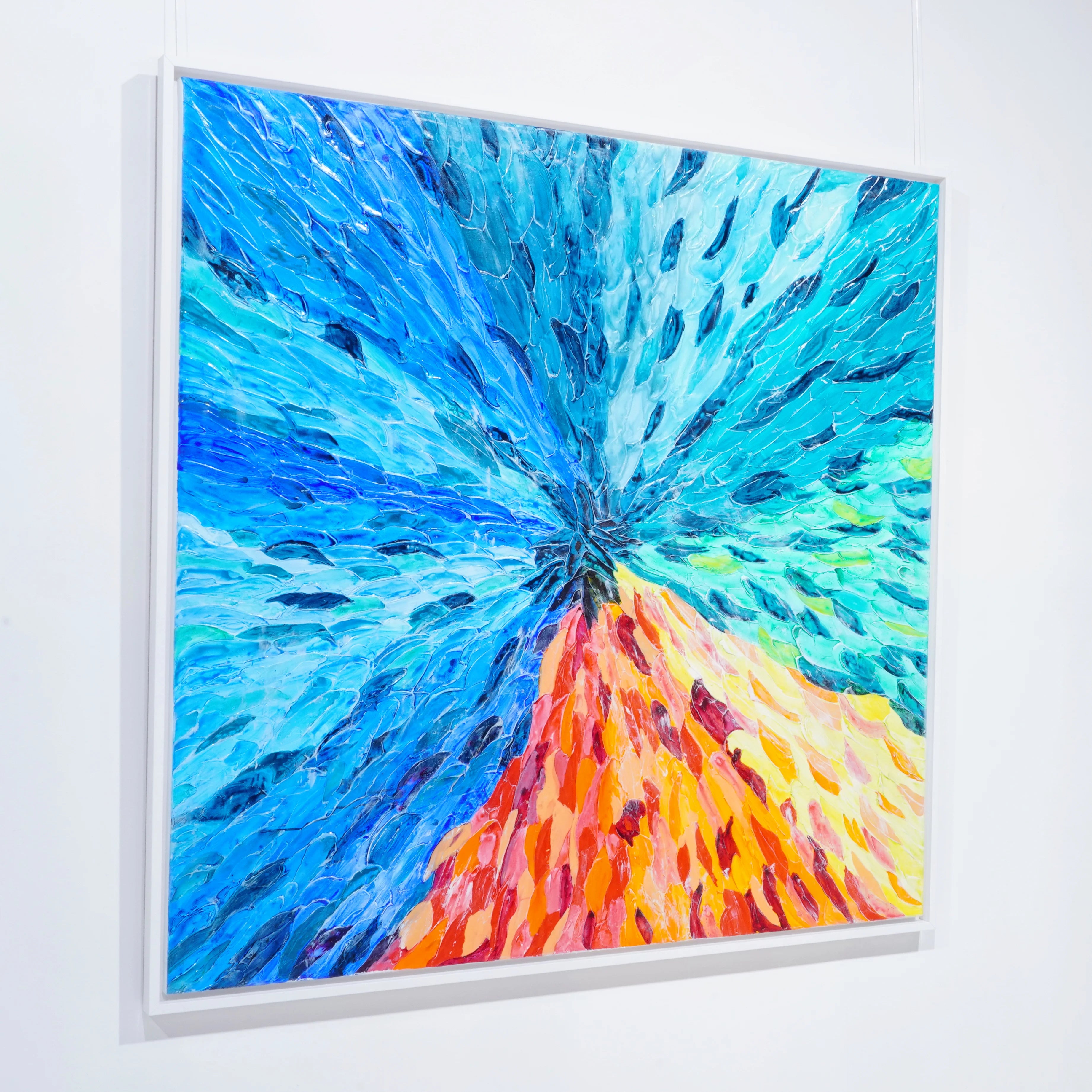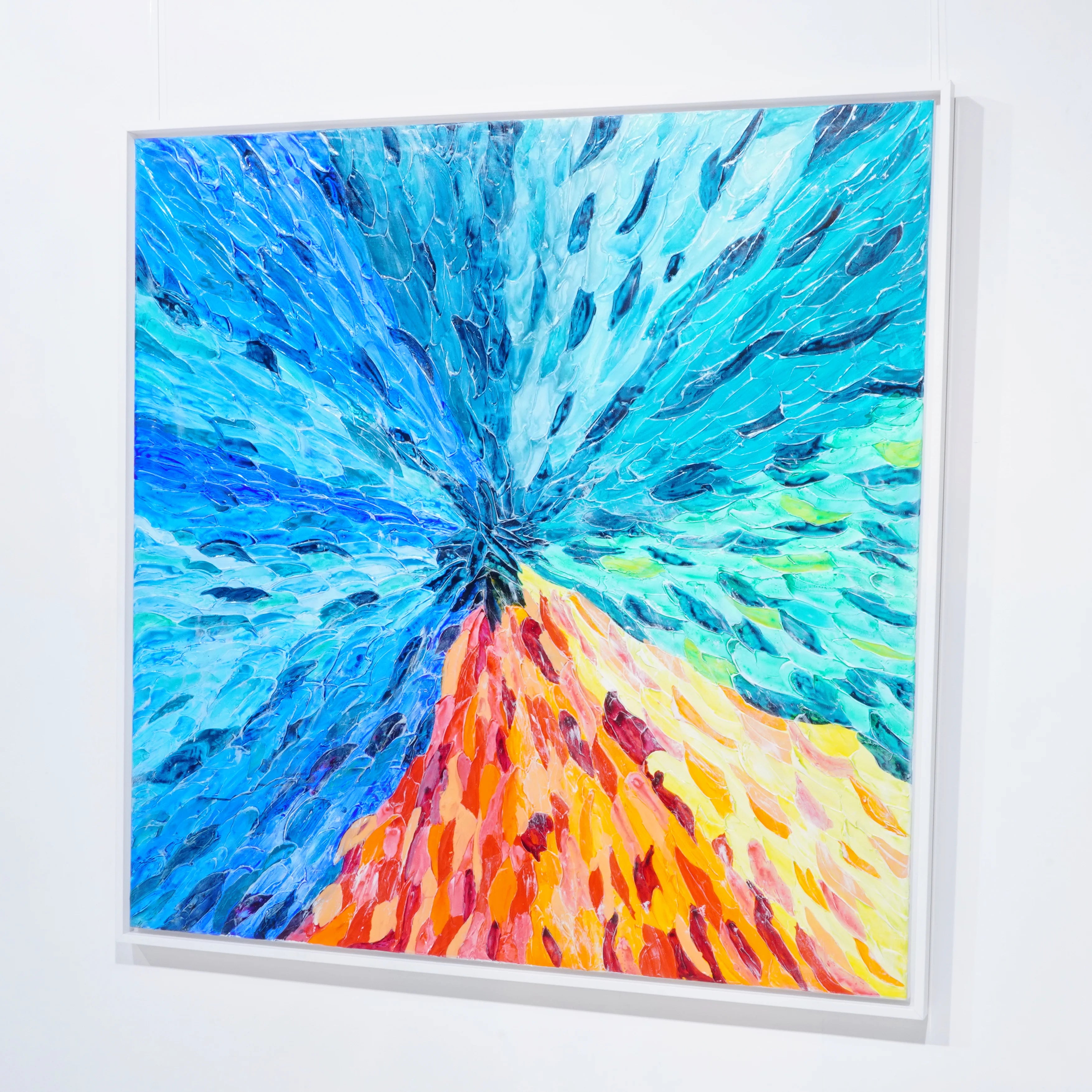 The composition is organized around a central core from which an expansive energy radiates, like a fusion of water, light, and warmth. The dynamic textures and the relief-like surface enhance this sense of momentum, while the color contrasts lend the piece depth, intensity, and radiance.