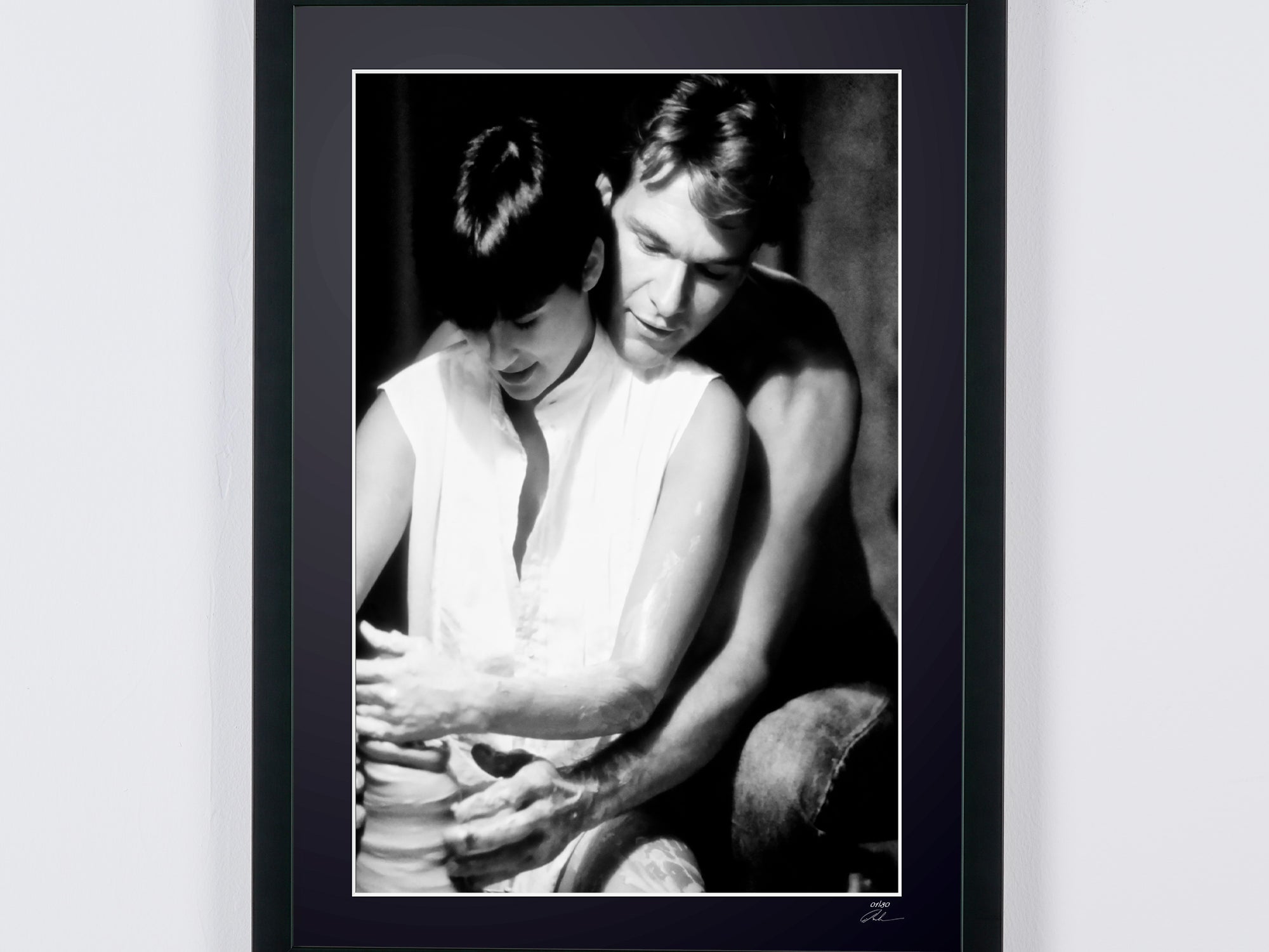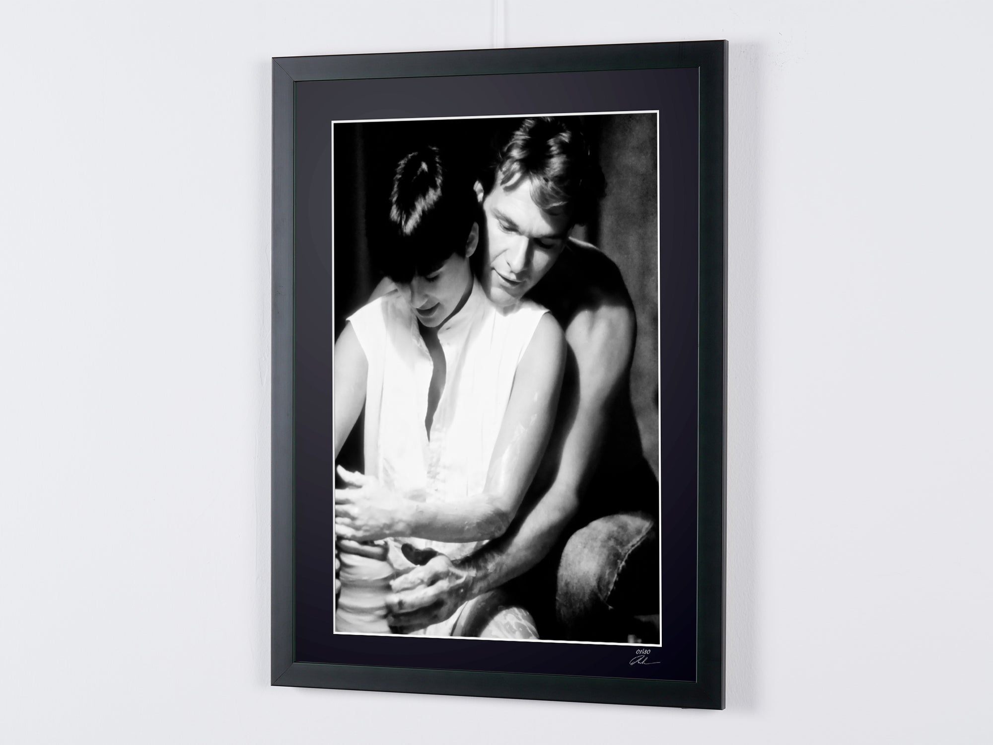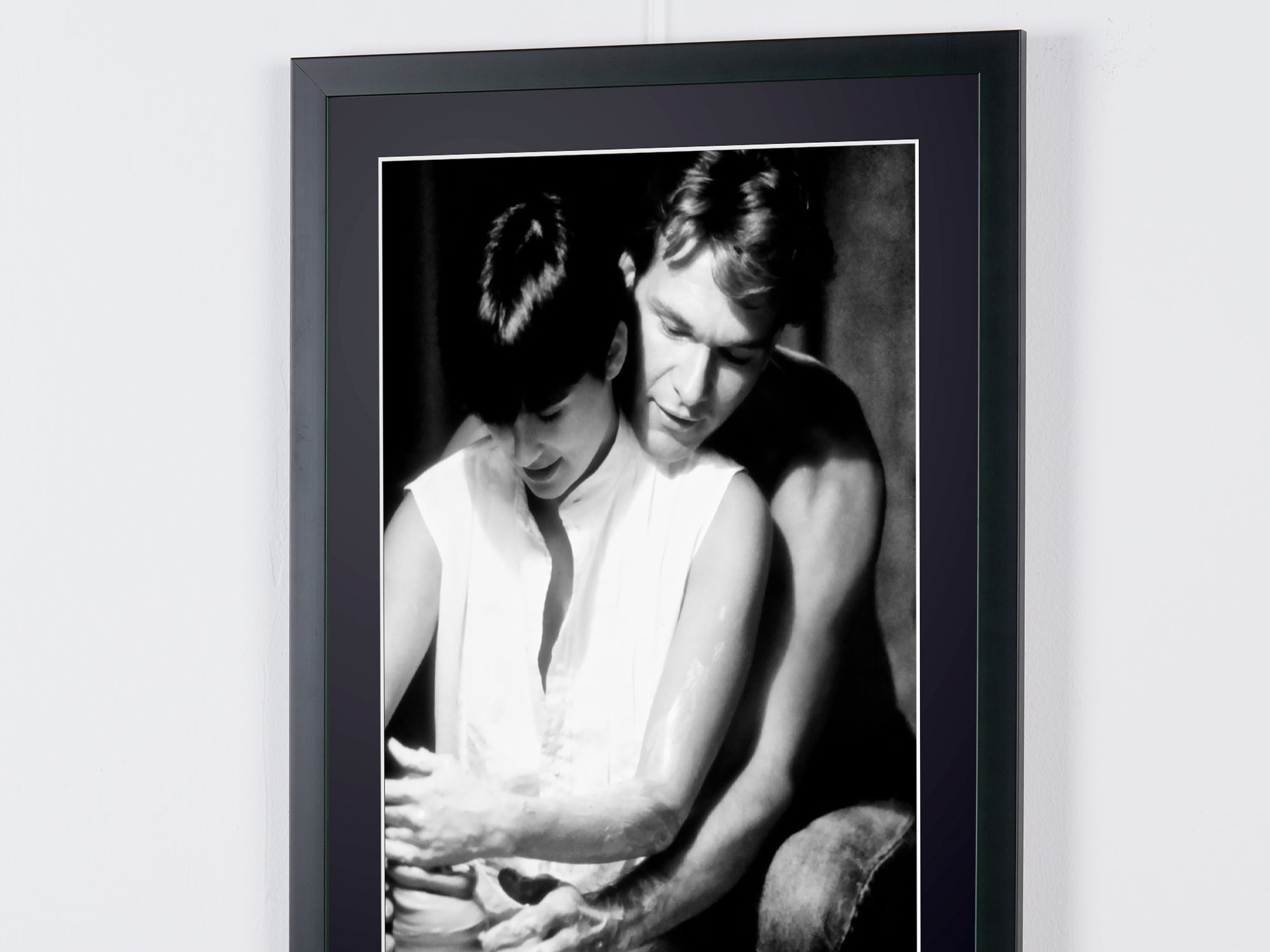 Framed photo from "Ghost (1990) - Patrick Swayze (Sam) & Demi Moore (Molly) - Wooden Frame 70x50 cm - - Original Certificate (COA), Hologram Logo, and QR Code" — Black-and-white fine art print on fine art paper 70x50 cm