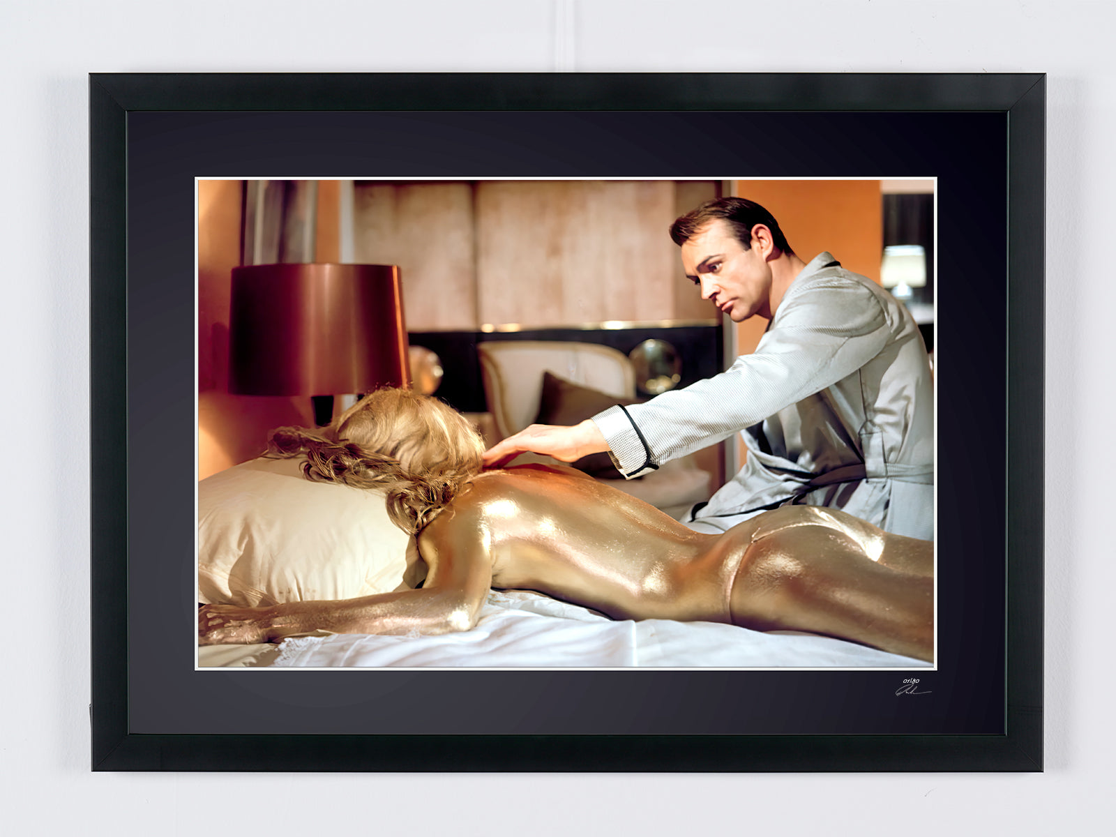 Framed photo of "James Bond 007: Goldfinger - Sean Connery & Shirley Eaton on Set - Starck Exclusive Edition" — Black-and-white fine art print on fine art paper 70x50 cm