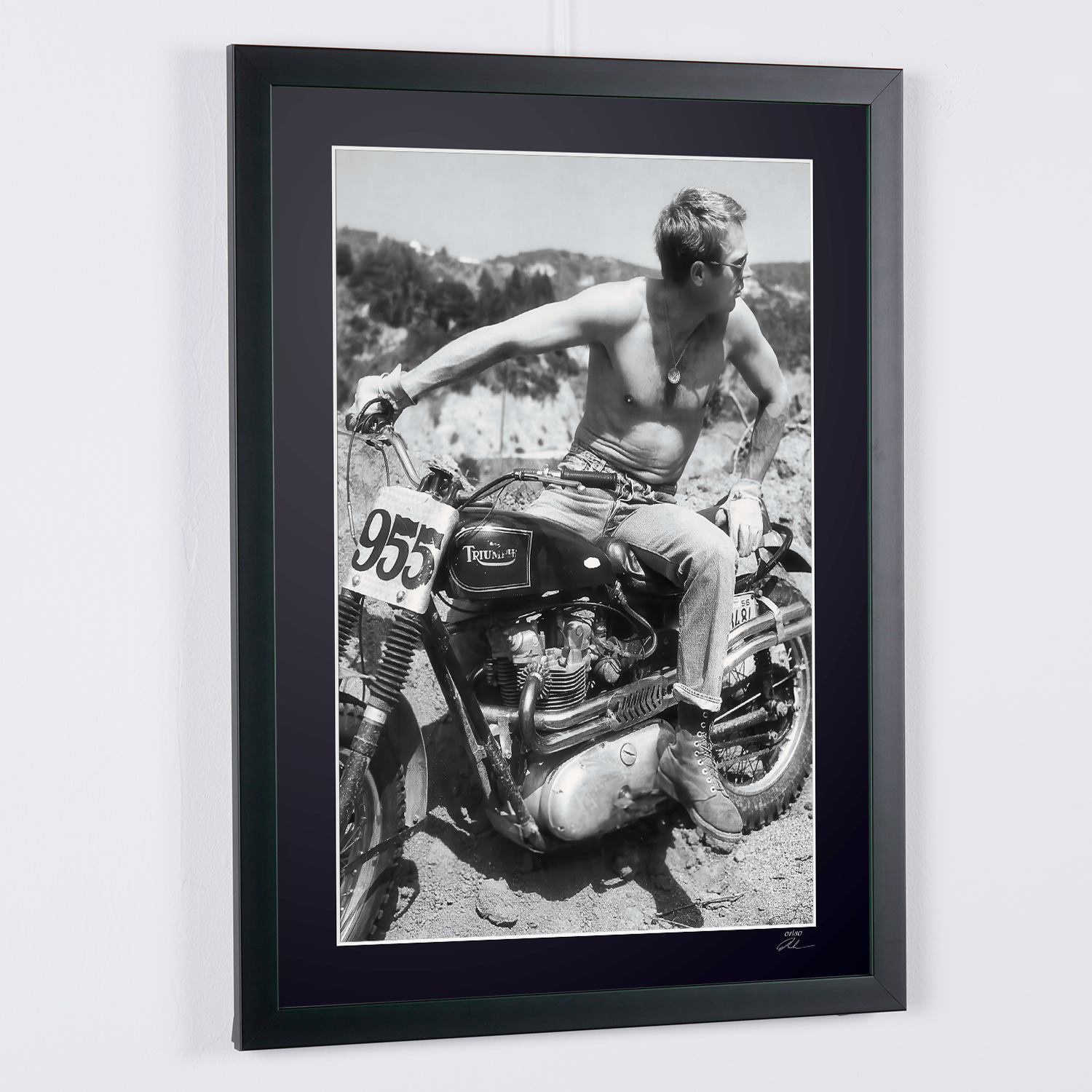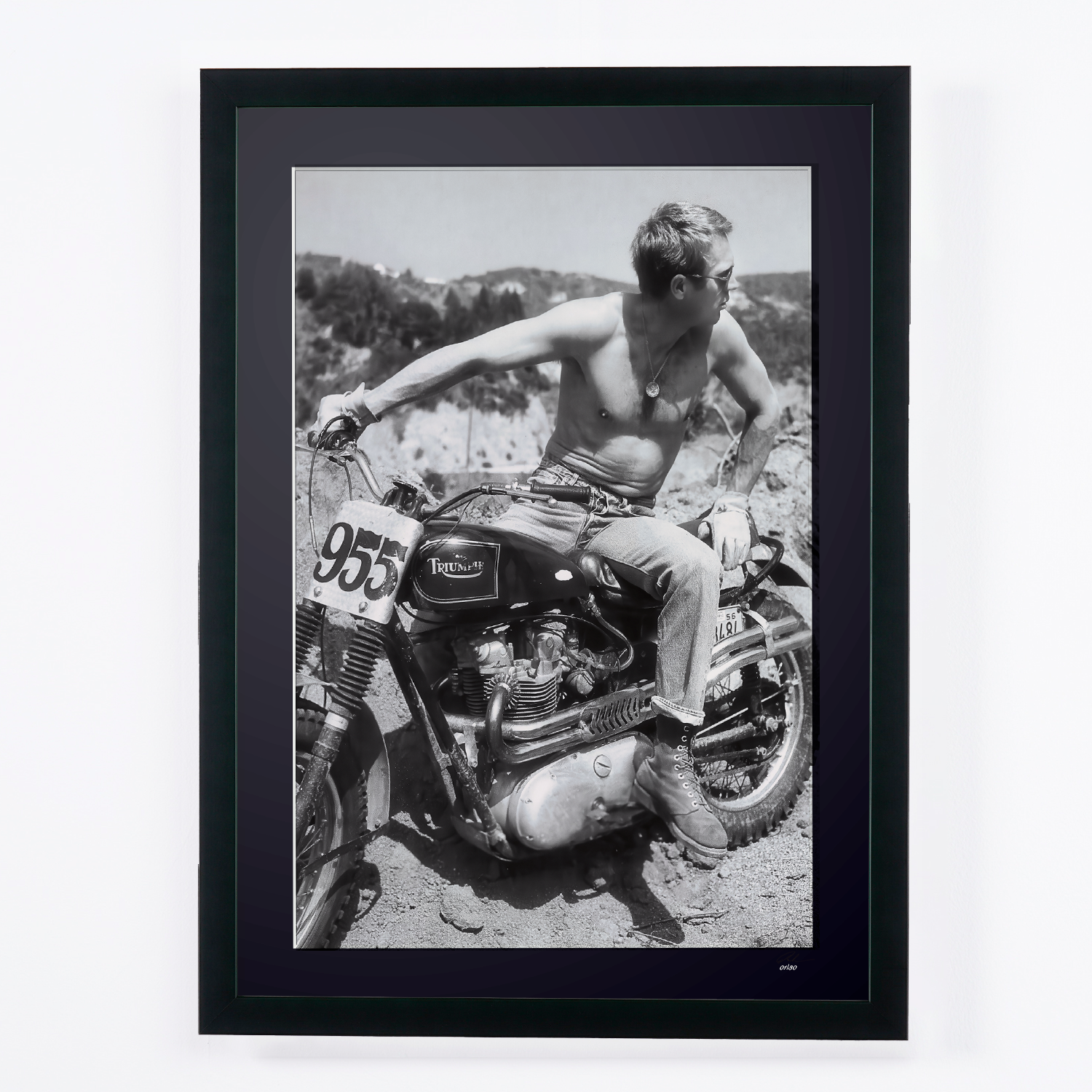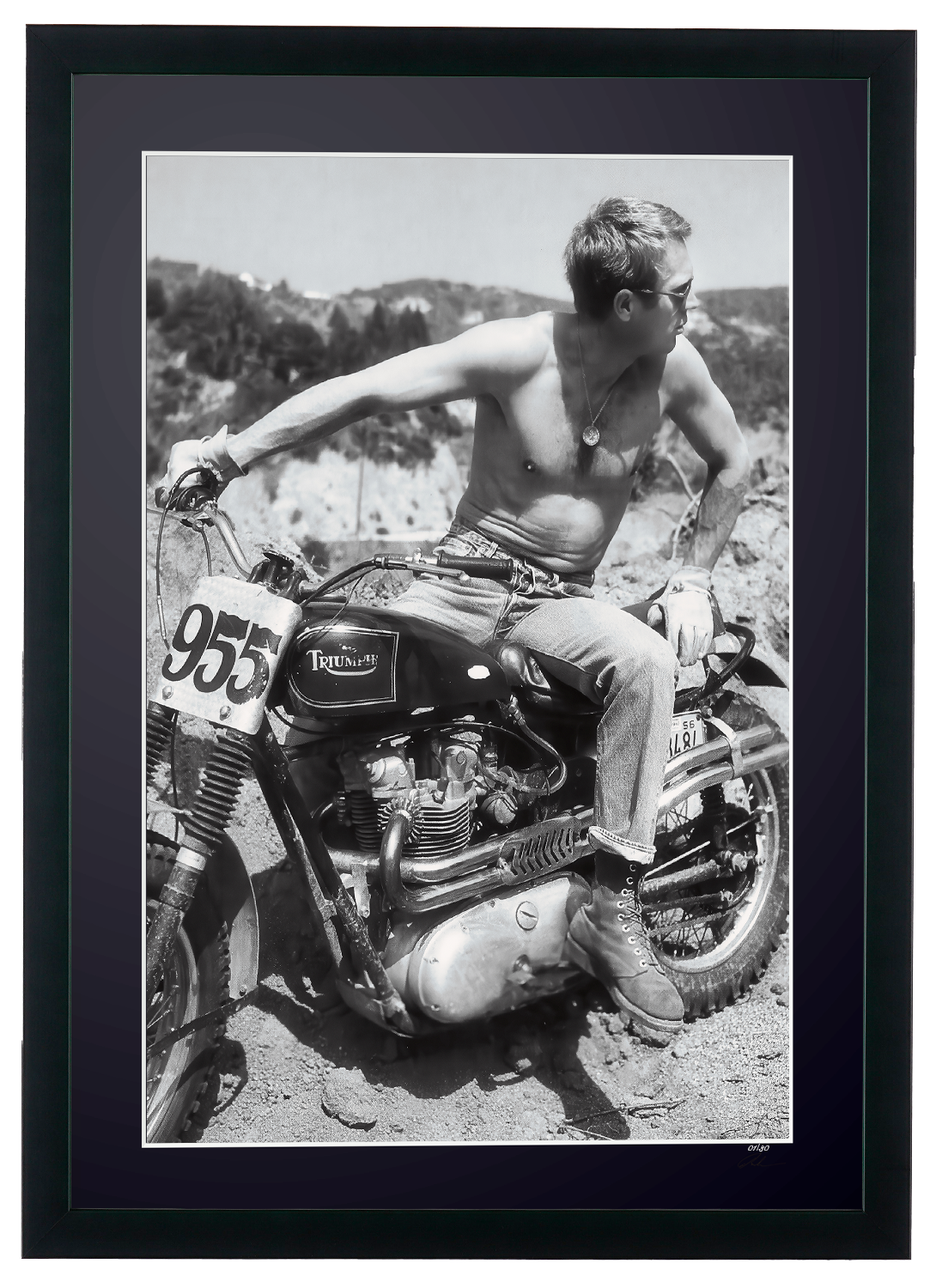 Framed photo of "Steve McQueen’s Desert & 1961 Triumph TR6 - The Great Escape 1963" — Black-and-white fine art print on fine art paper 70x50 cm