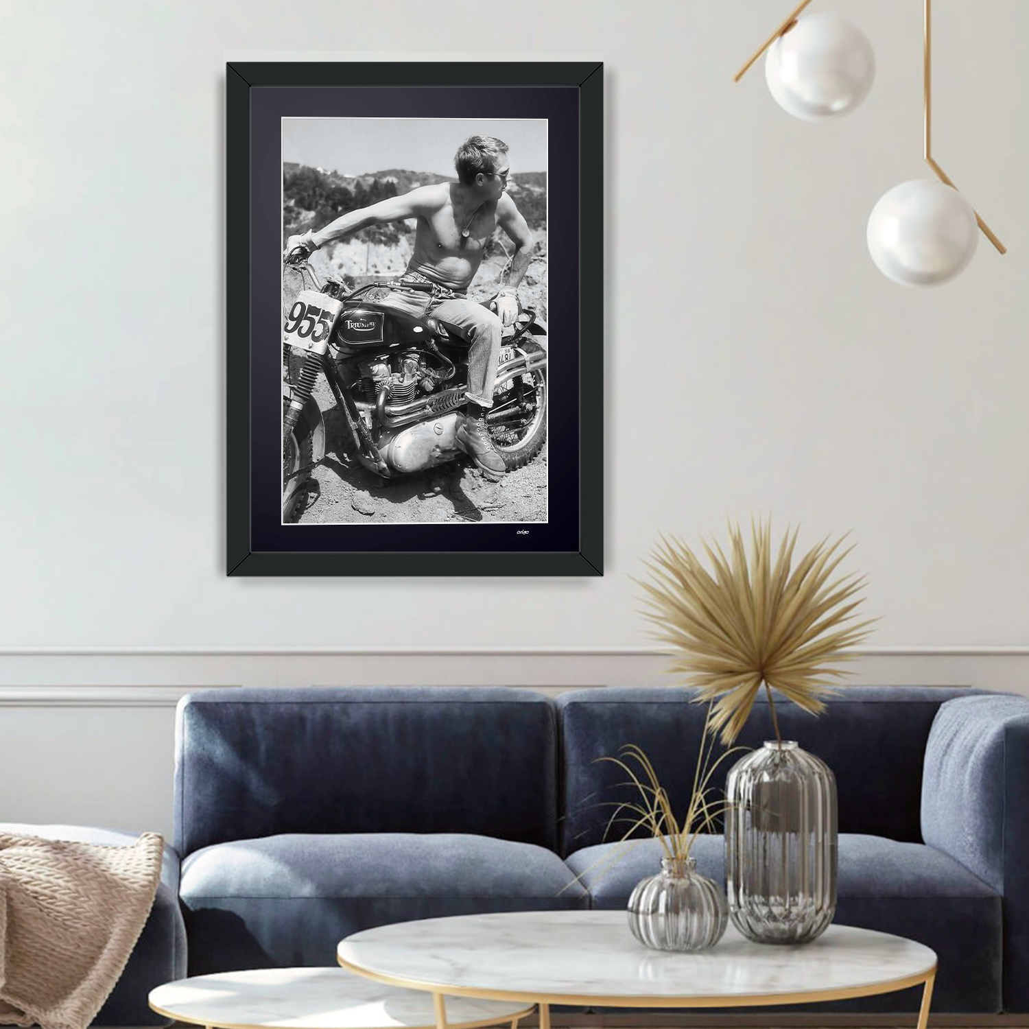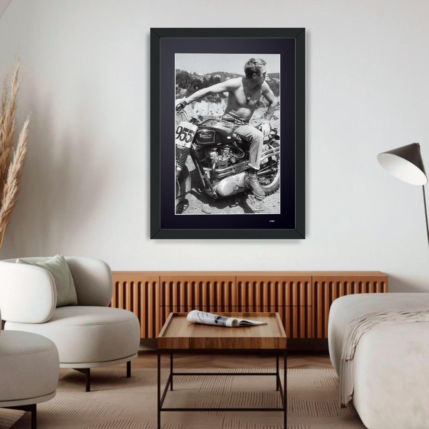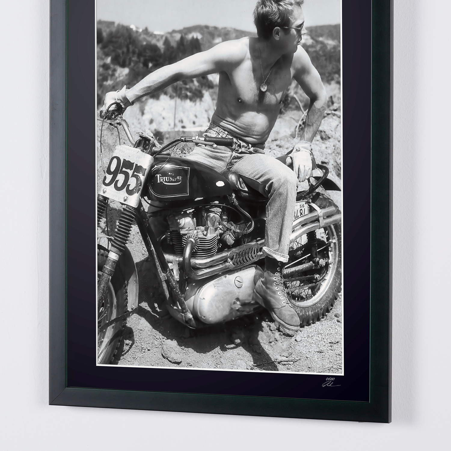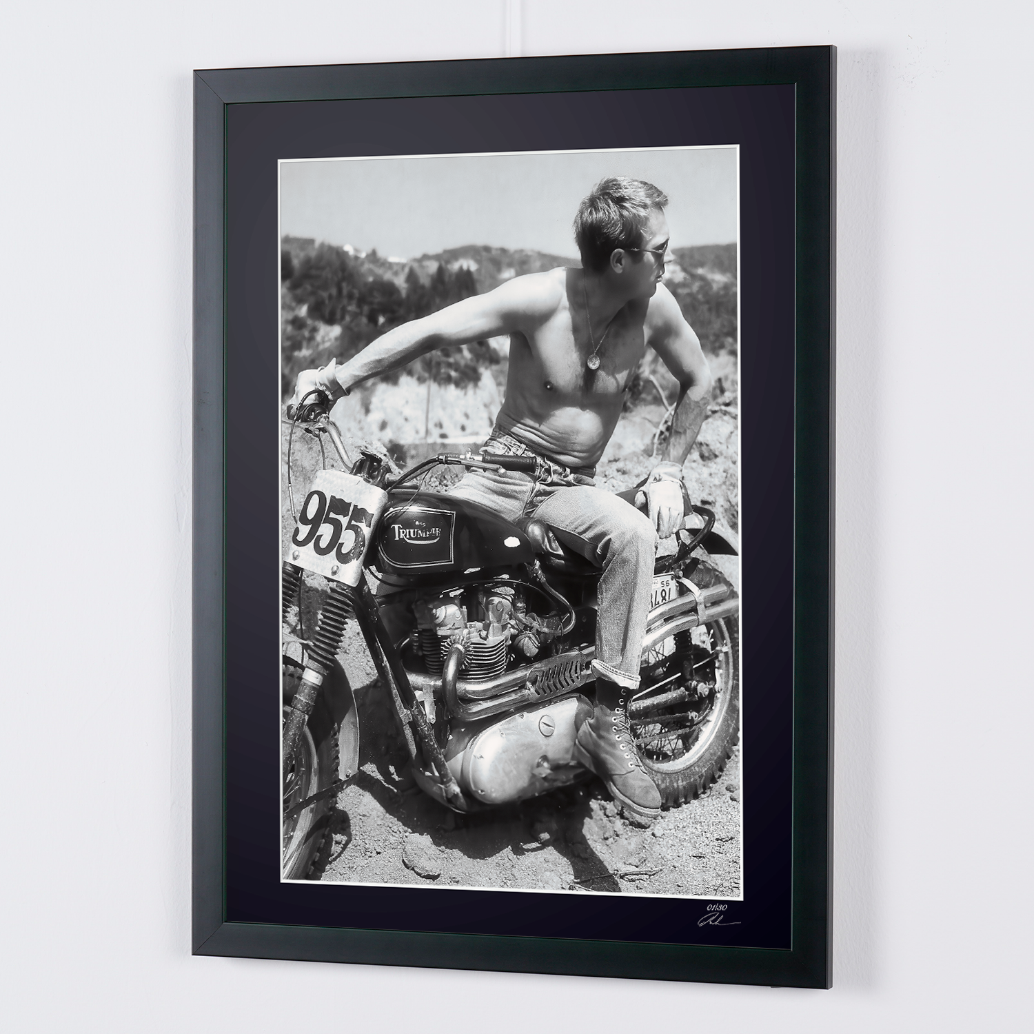 Framed photo of "Steve McQueen’s Desert & 1961 Triumph TR6 - The Great Escape 1963" — Black-and-white fine art print on fine art paper 70x50 cm