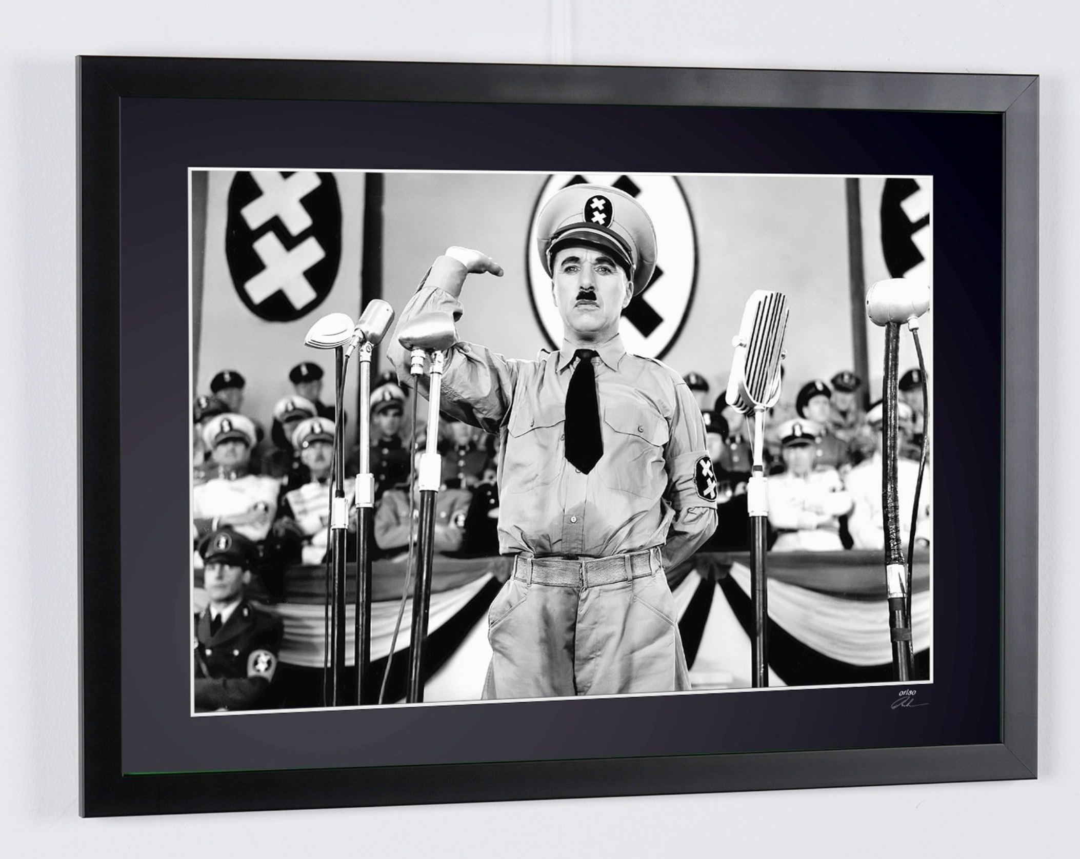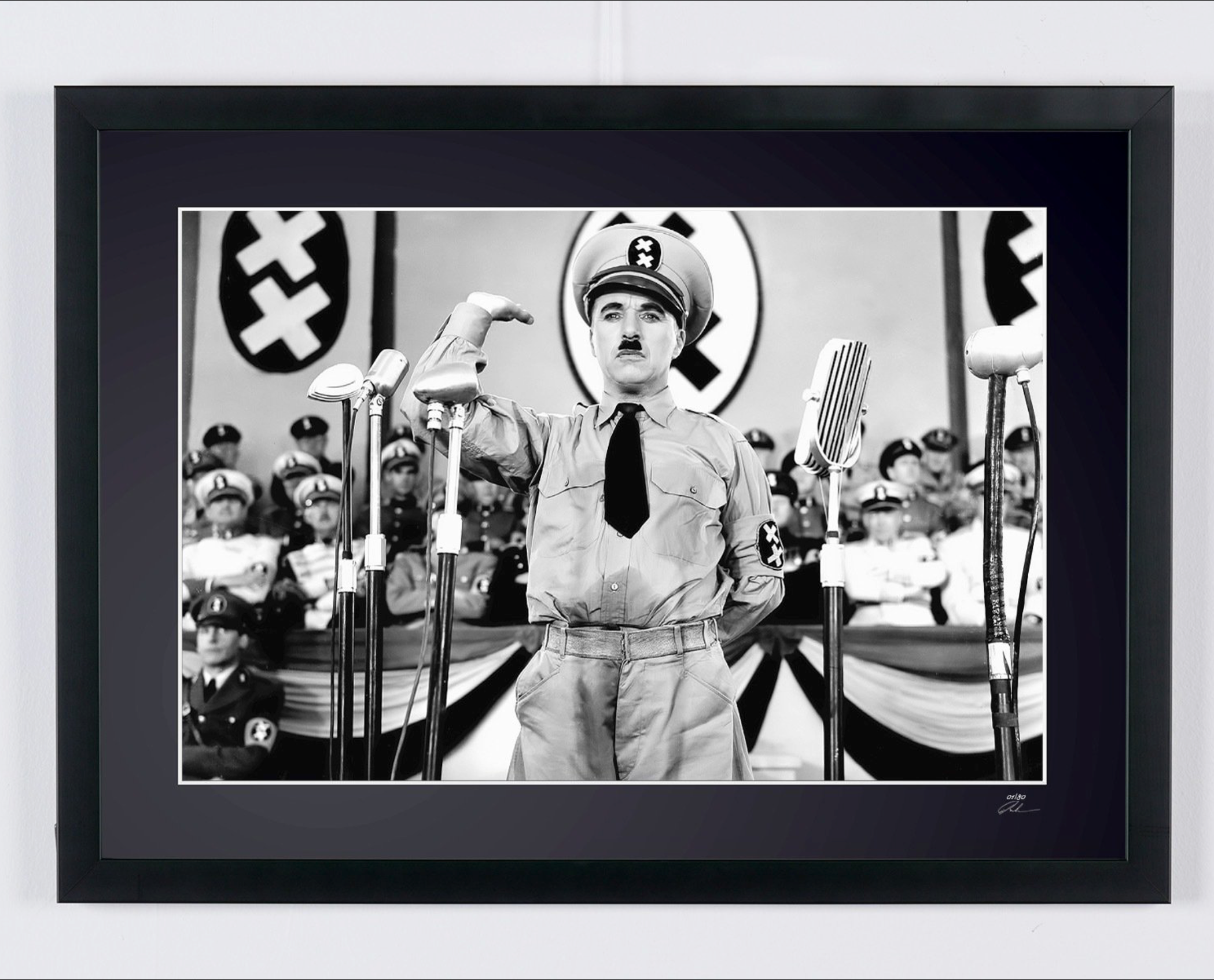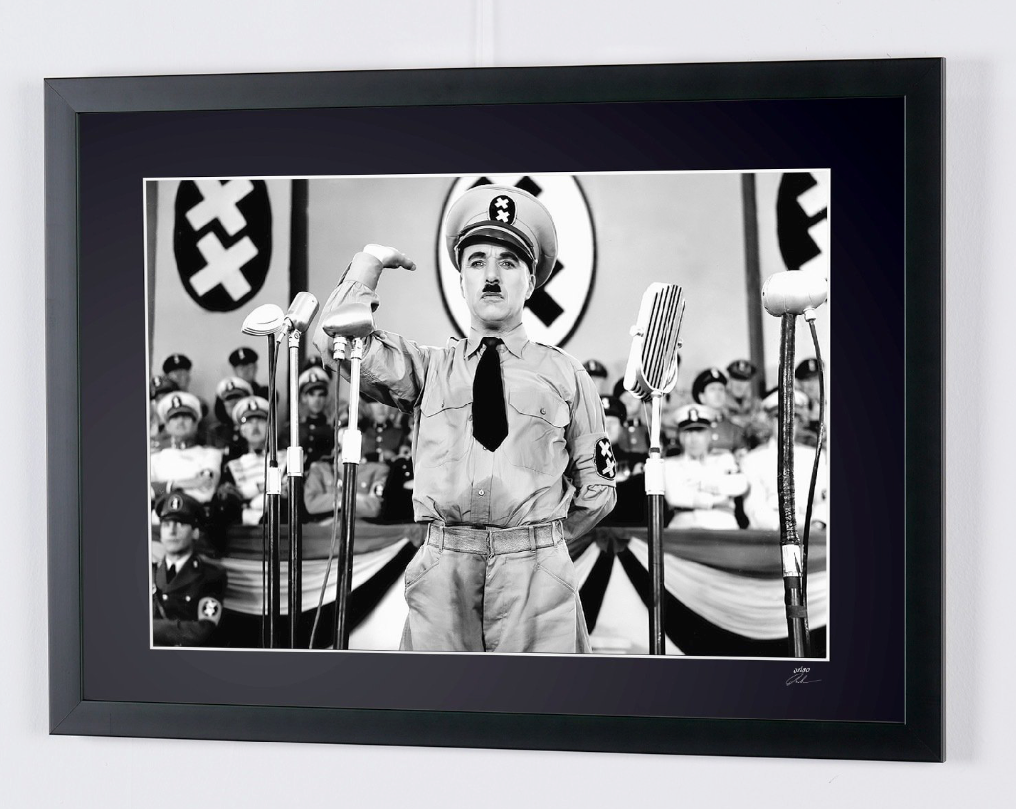 Framed photo of "The Great Dictator (1940) - Charles Chaplin as the Dictator of Tomania" — Black-and-white fine art print on fine art paper 70x50 cm