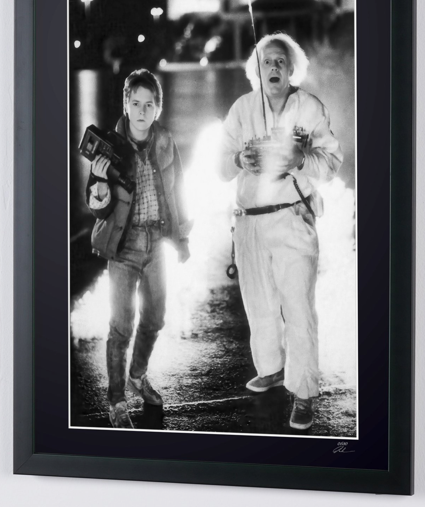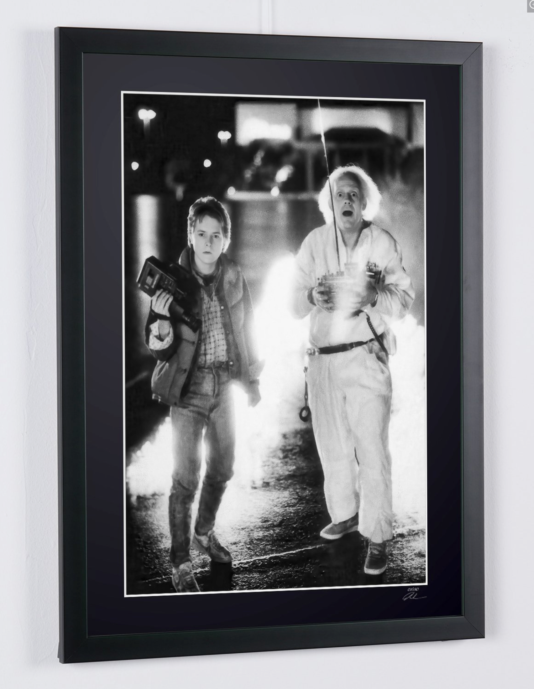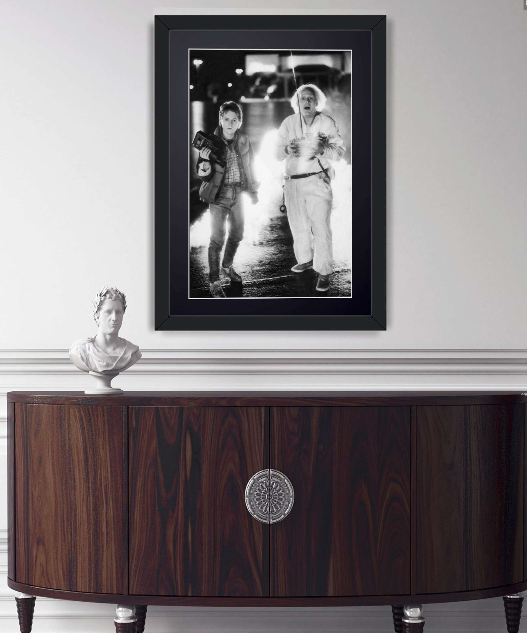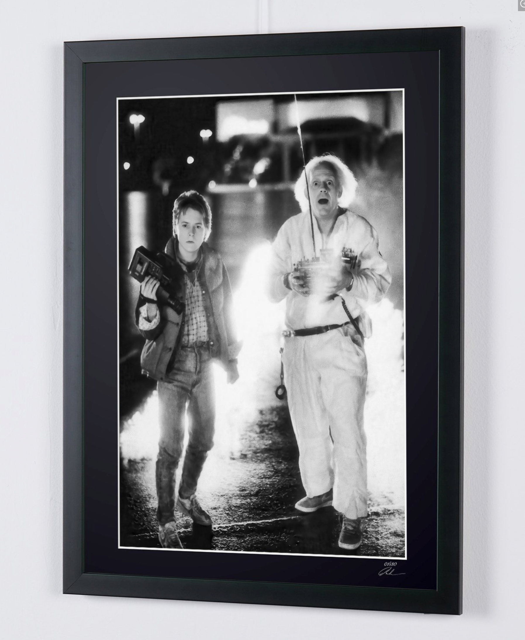 Fotografía enmarcada de «Regreso al futuro, 1985: Michael J. Fox como Marty McFly y Christopher Lloyd como el Dr. Emmett Brown» — Impresión artística en blanco y negro sobre papel Fine Art 70 x 50 cm