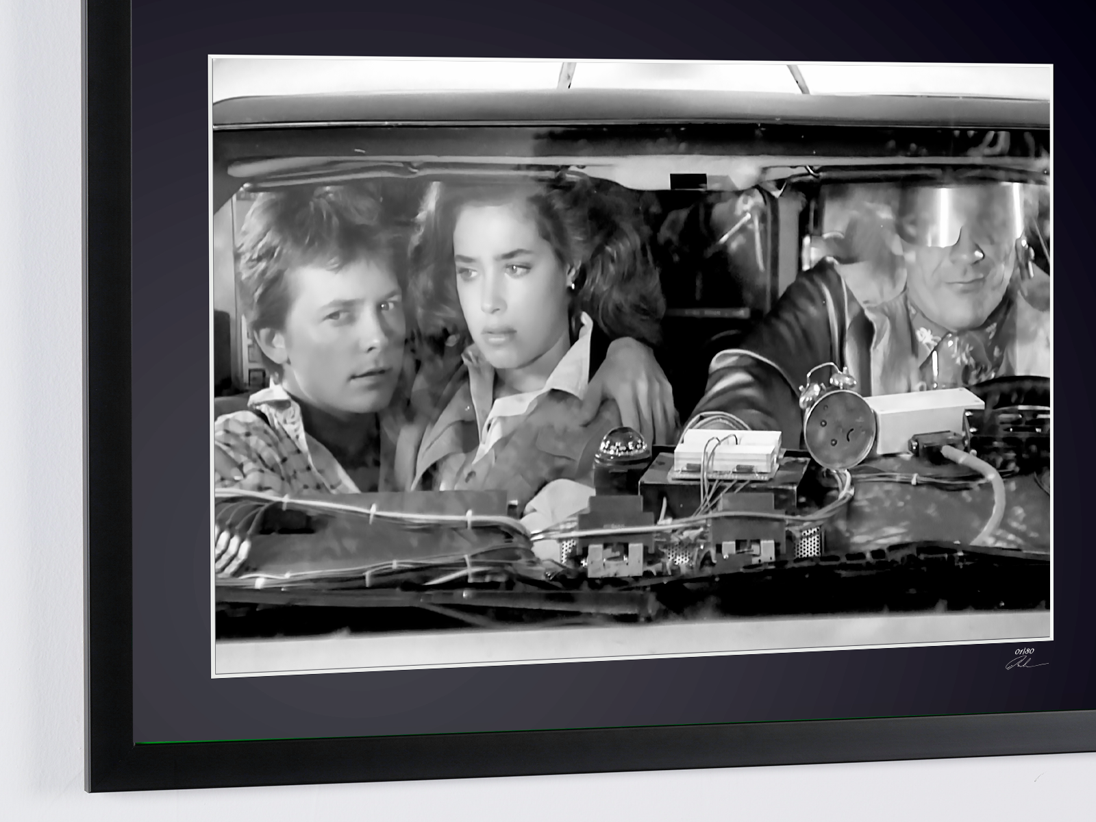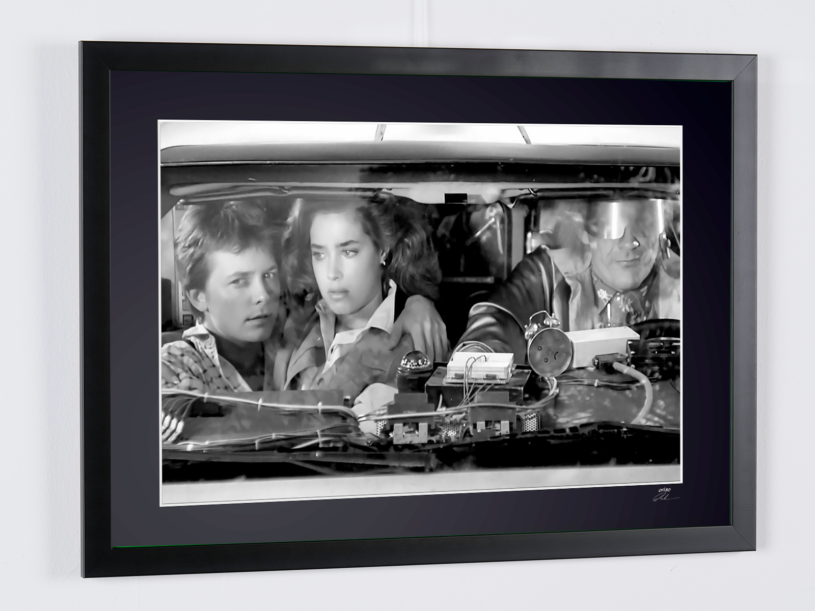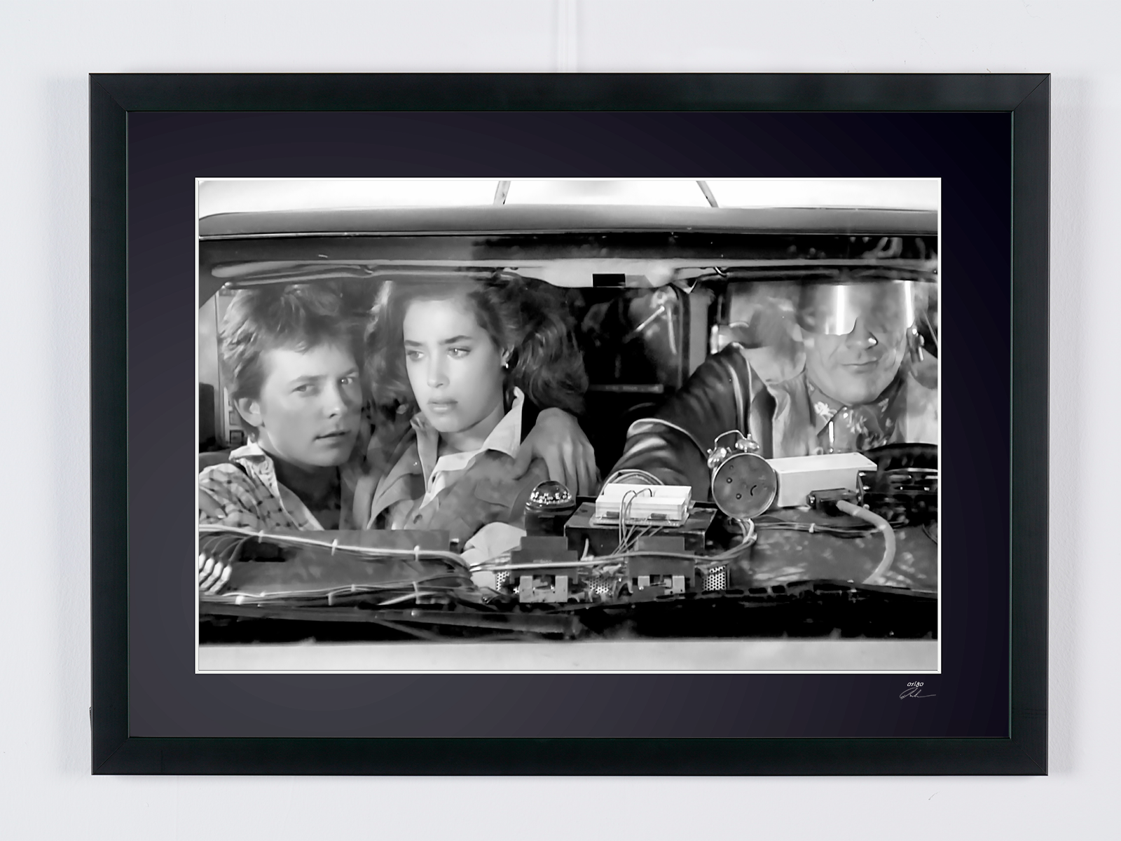 Fotografía enmarcada de «Regreso al futuro: Michael J. Fox, Christopher Lloyd y Elizabeth Shue» — Impresión artística en blanco y negro sobre papel Fine Art 70 x 50 cm