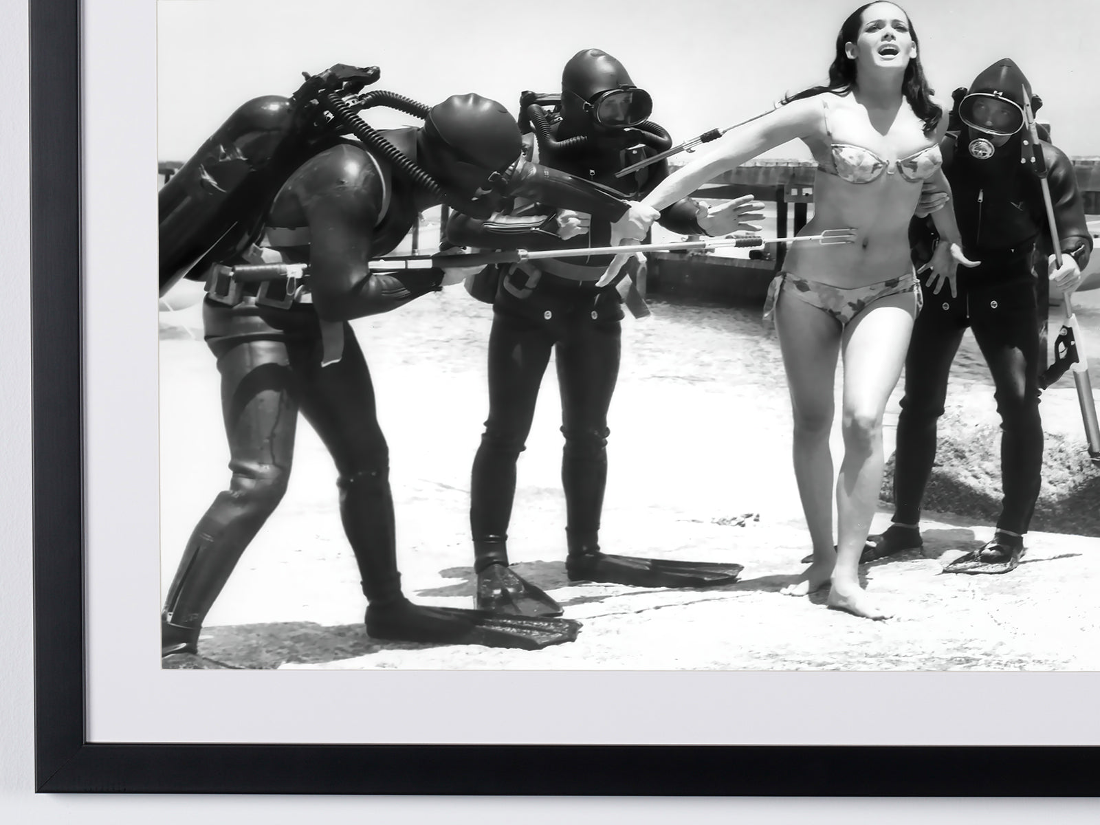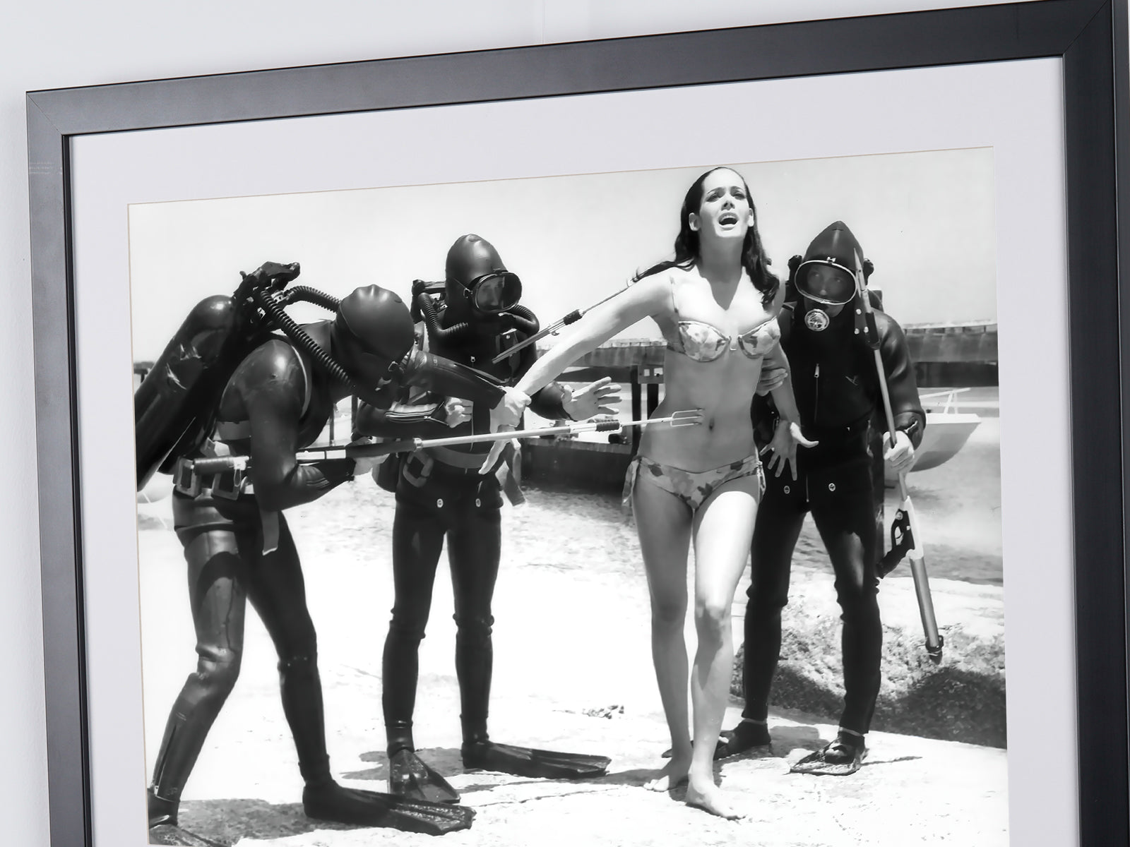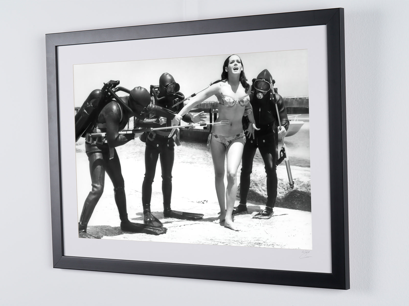 Fotografía enmarcada de James Bond : Operación Trueno - Martine Beswick en el plató, 1965» — Impresión artística en blanco y negro sobre papel Fine Art 70x50 cm