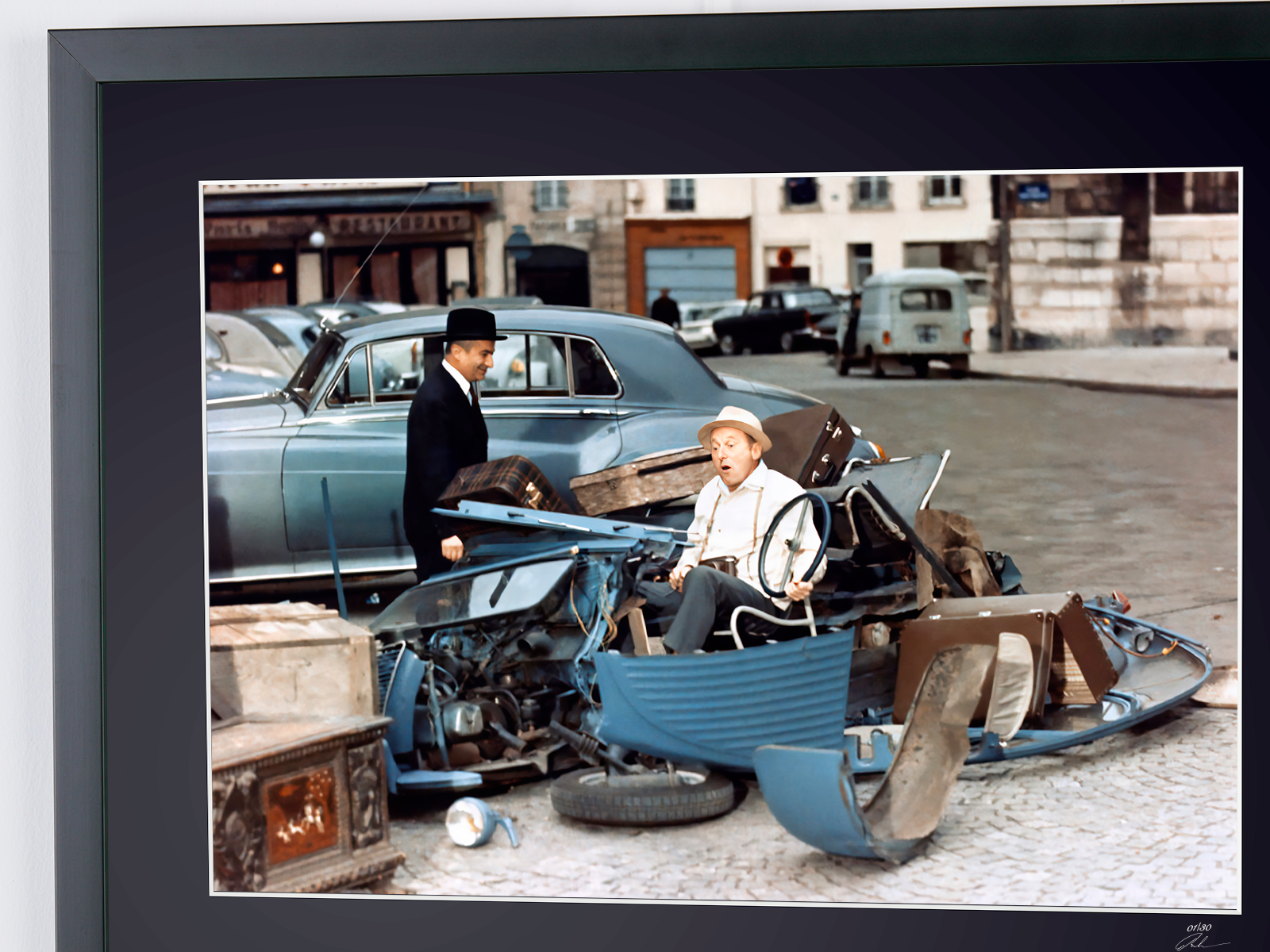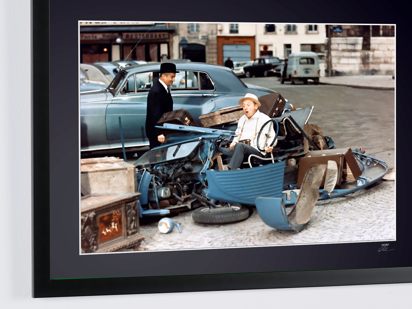 Cette scène mythique du Corniaud capture le duo explosif Louis de Funès et Bourvil dans leur roadtrip rocambolesque. Réalisé par Gérard Oury, ce chef-d'œuvre de la comédie française fut tourné en grande partie sur la route Napoléon, transformant une simple 2CV Citroën en véritable star du cinéma hexagonal.