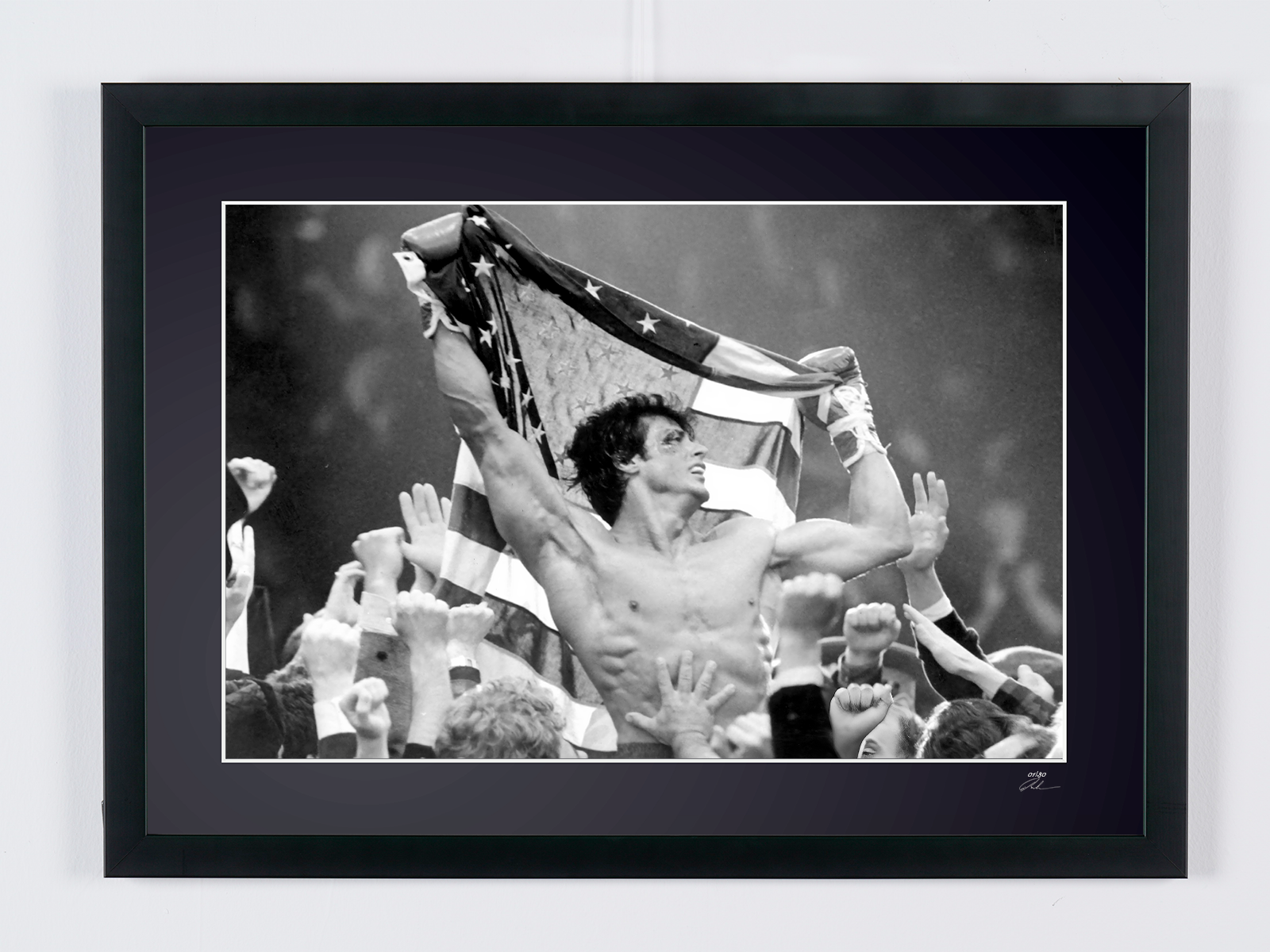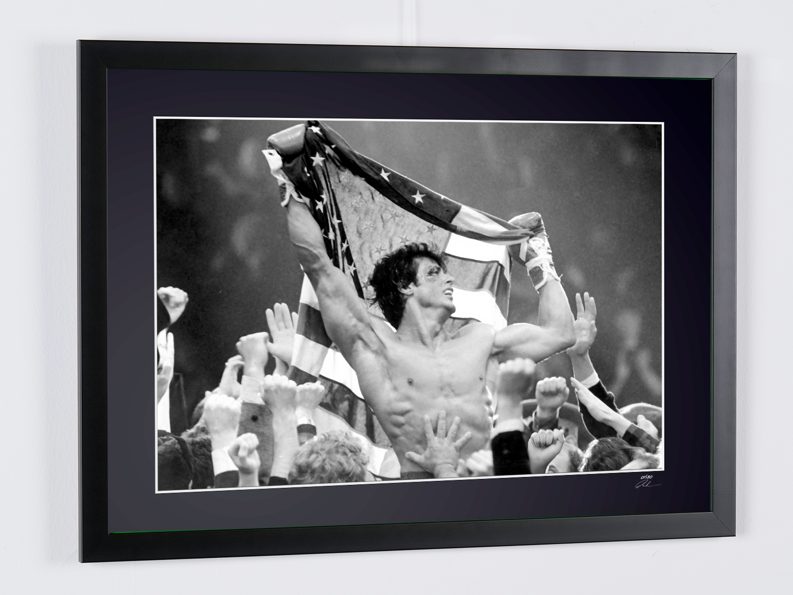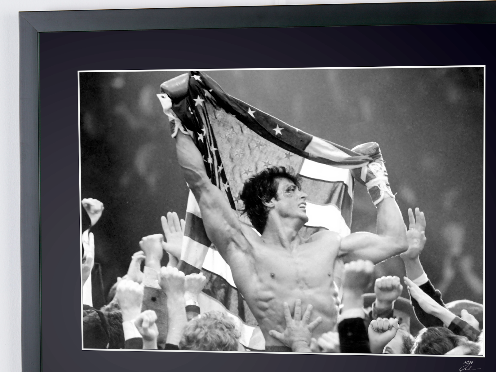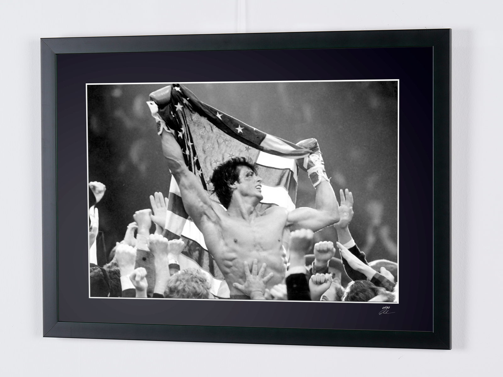 Esta fotografía inmortaliza una de las escenas más emblemáticas de Rocky , rodada en los estudios MGM de Culver City bajo la dirección del Sylvester Stallone . El cara a cara entre Rocky y su mentor Mickey pone de manifiesto toda la complicidad entre Sylvester Stallone y el veterano Burgess Meredith, en la que sería una de las últimas apariciones del legendario entrenador antes de su fallecimiento en la película.