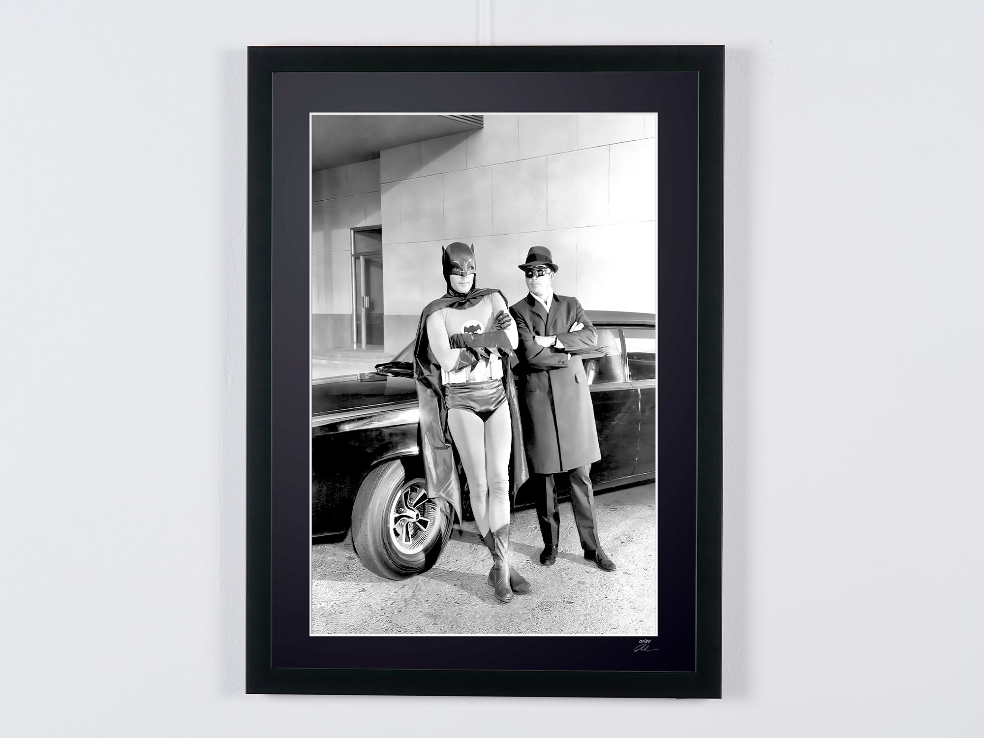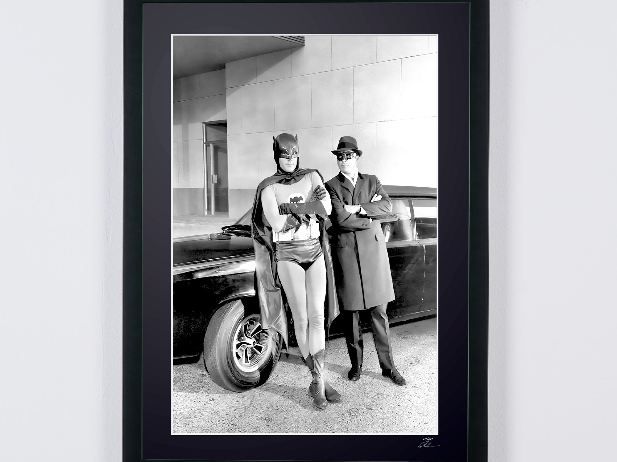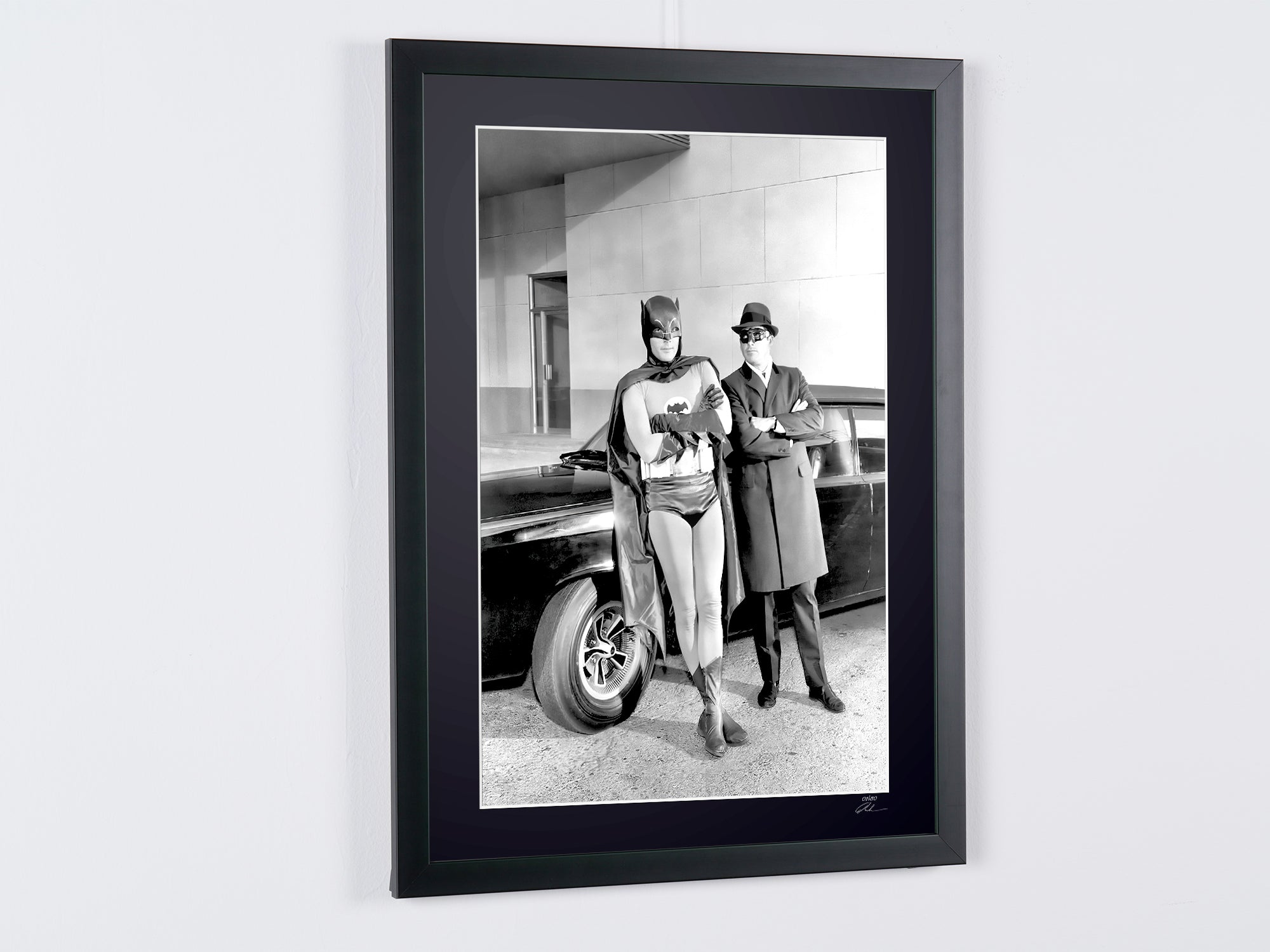 Foto incorniciata di "BATMAN 1966 - Adam West nei panni di Batman e Van Williams nei panni del Calabrone Verde" — Stampa artistica in bianco e nero su carta Fine Art 70x50 cm