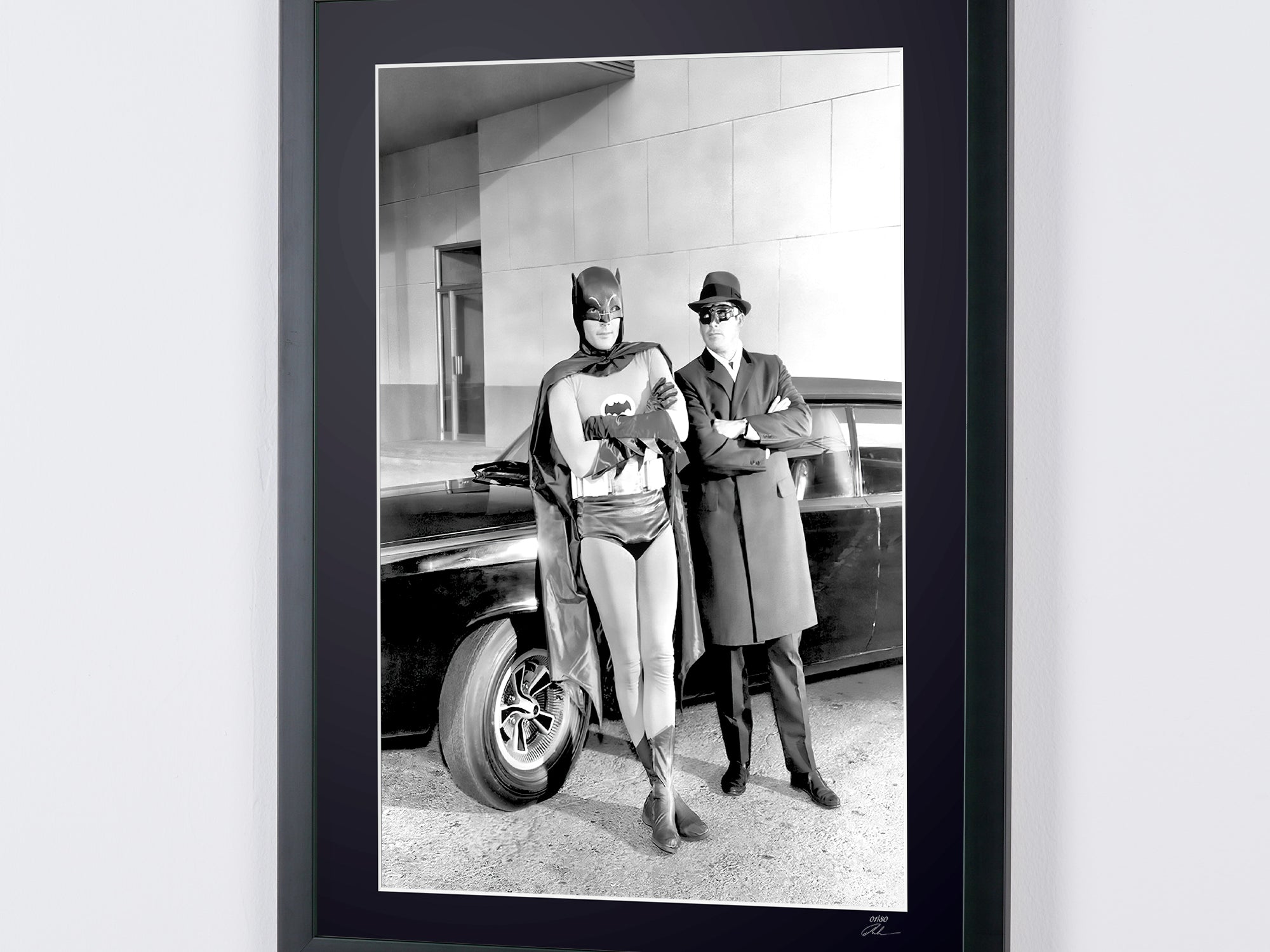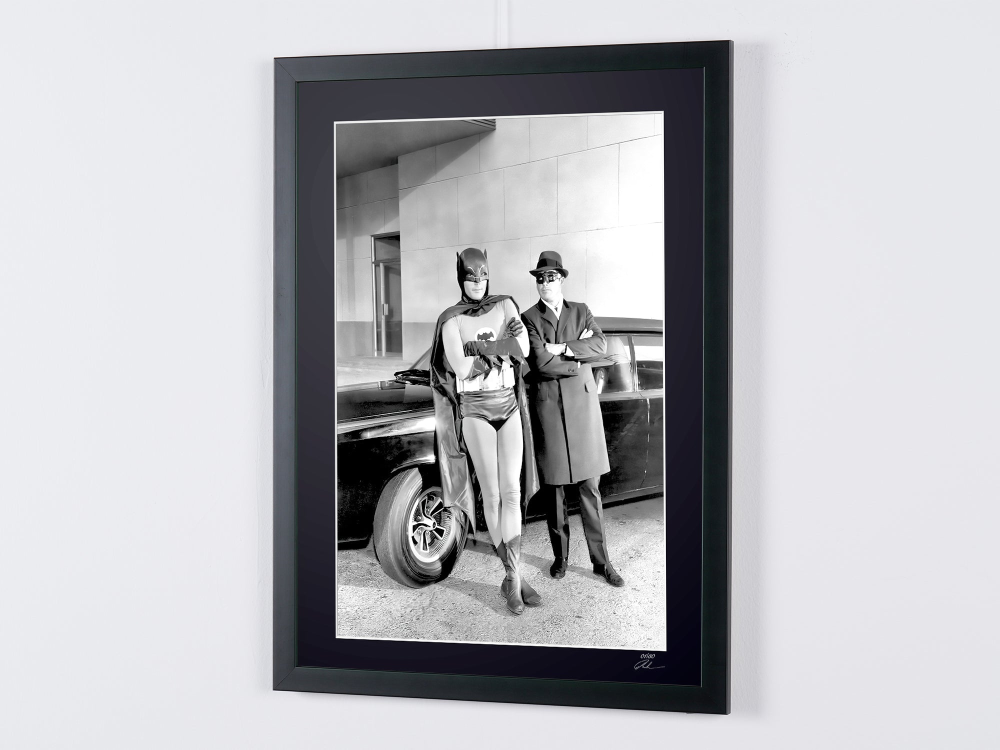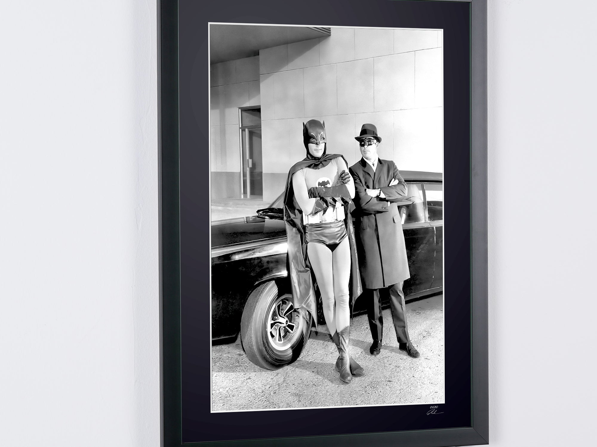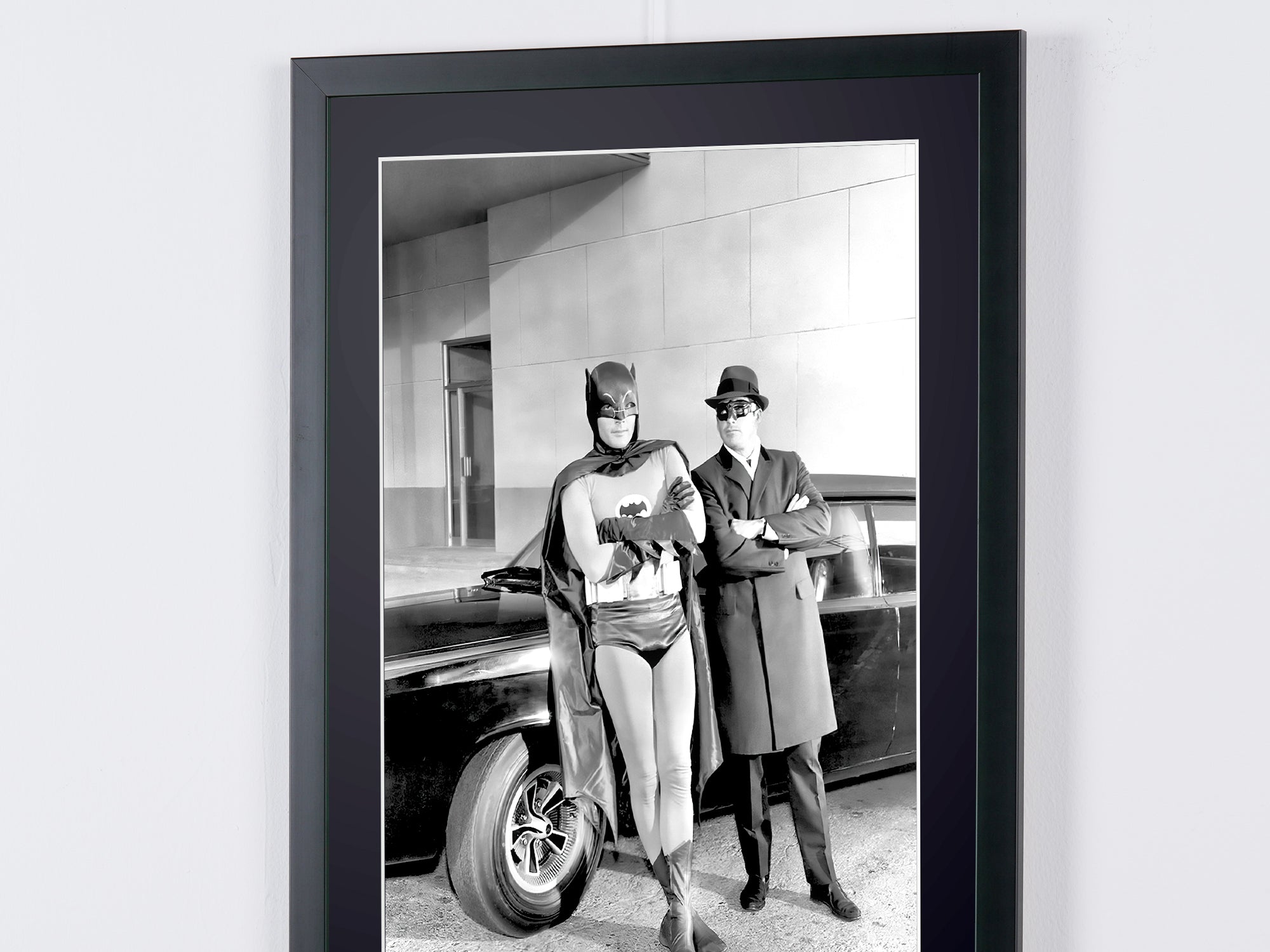 Foto incorniciata di "BATMAN 1966 - Adam West nei panni di Batman e Van Williams nei panni del Calabrone Verde" — Stampa artistica in bianco e nero su carta Fine Art 70x50 cm