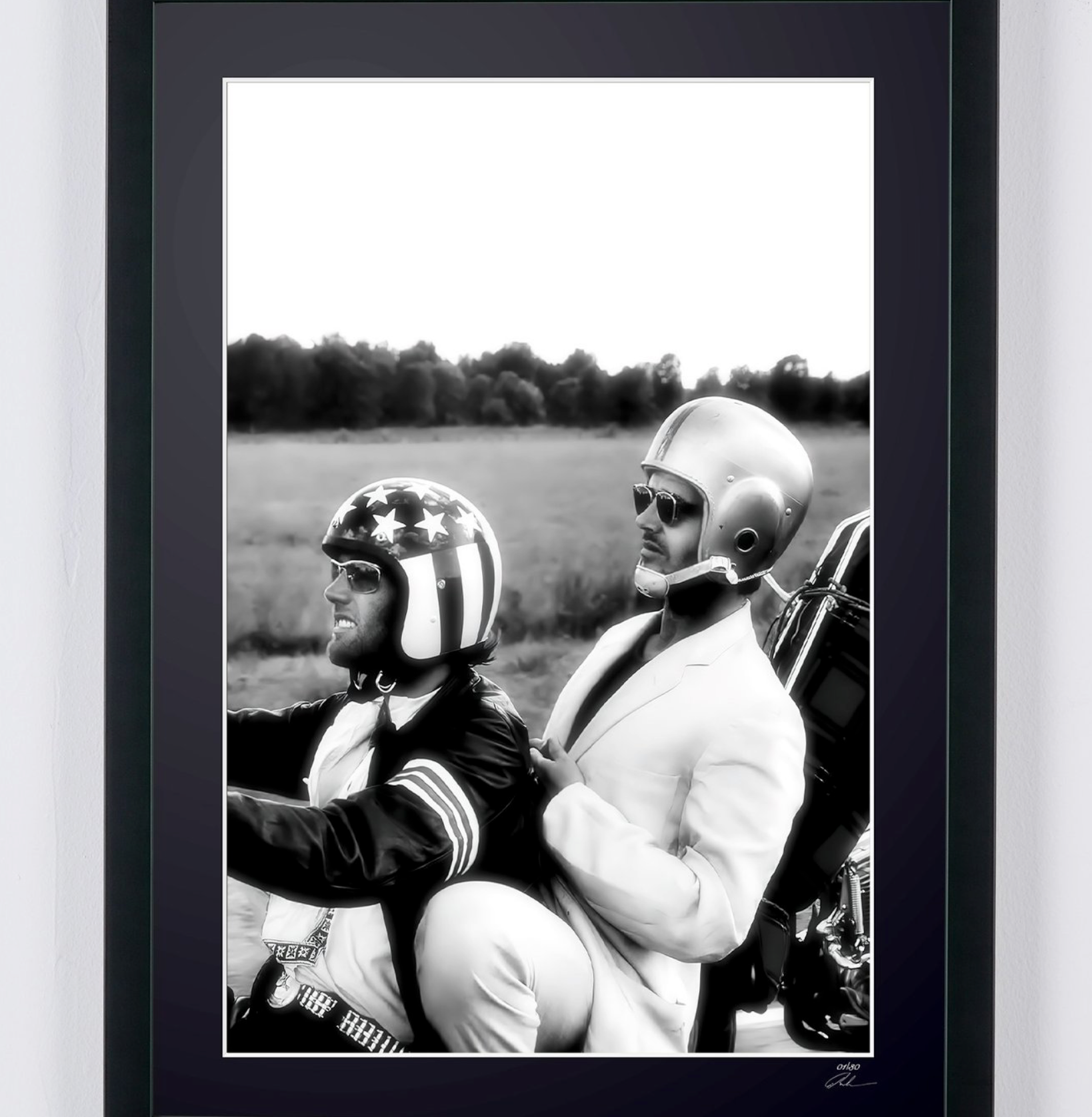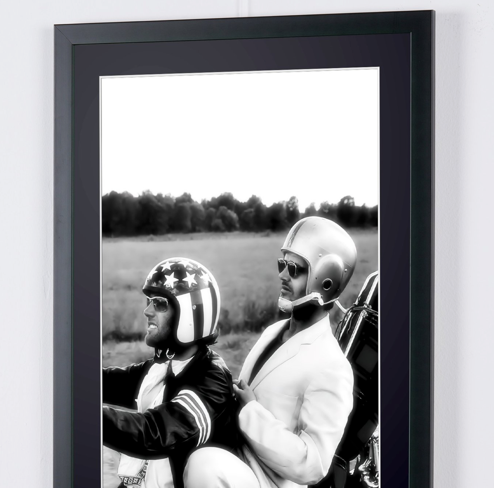 Foto incorniciata tratta da "Easy Rider (1969) - Jack Nicholson, George Hanson e Peter Fonda, Wyatt" — Stampa artistica in bianco e nero su carta Fine Art 70x50 cm