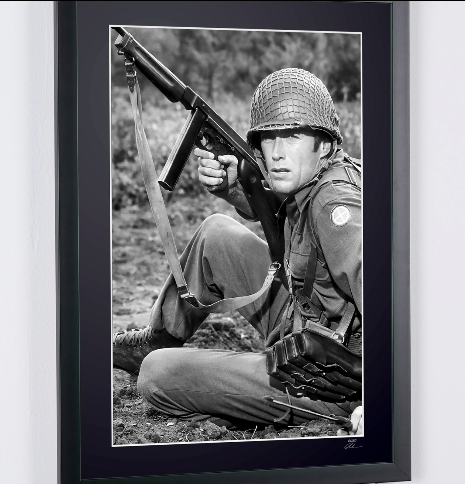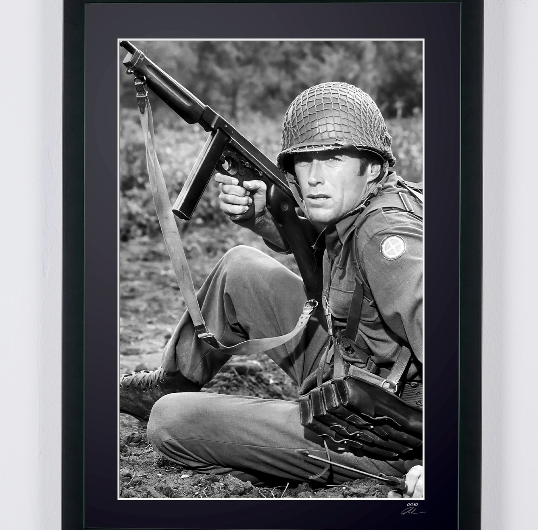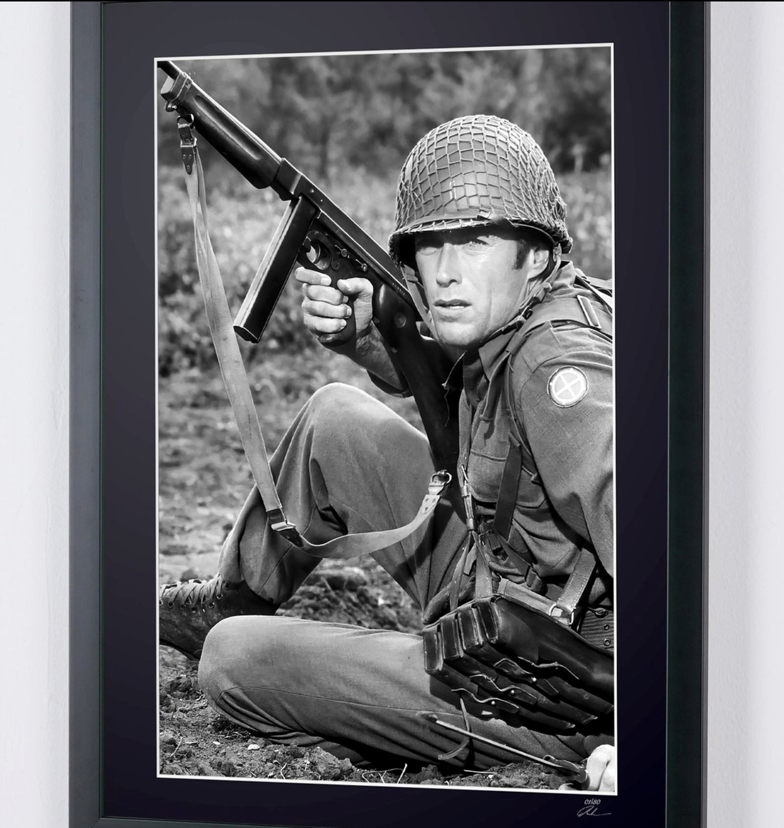 Foto incorniciata tratta da "Kelly's Heroes (1970) - Clint Eastwood nel ruolo del soldato Kelly sul set" — Stampa artistica in bianco e nero su carta Fine Art 70x50 cm