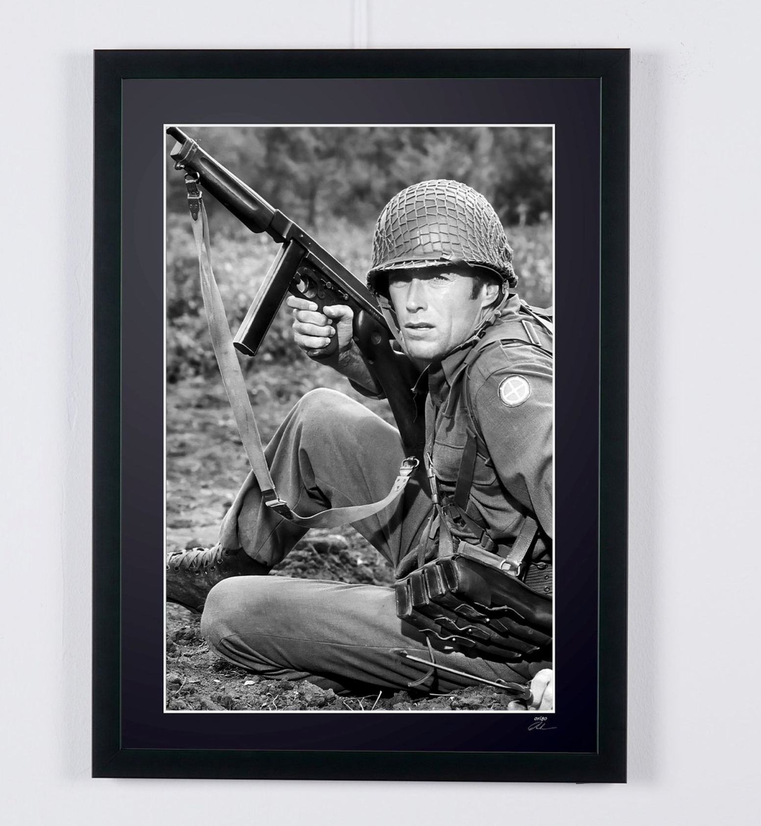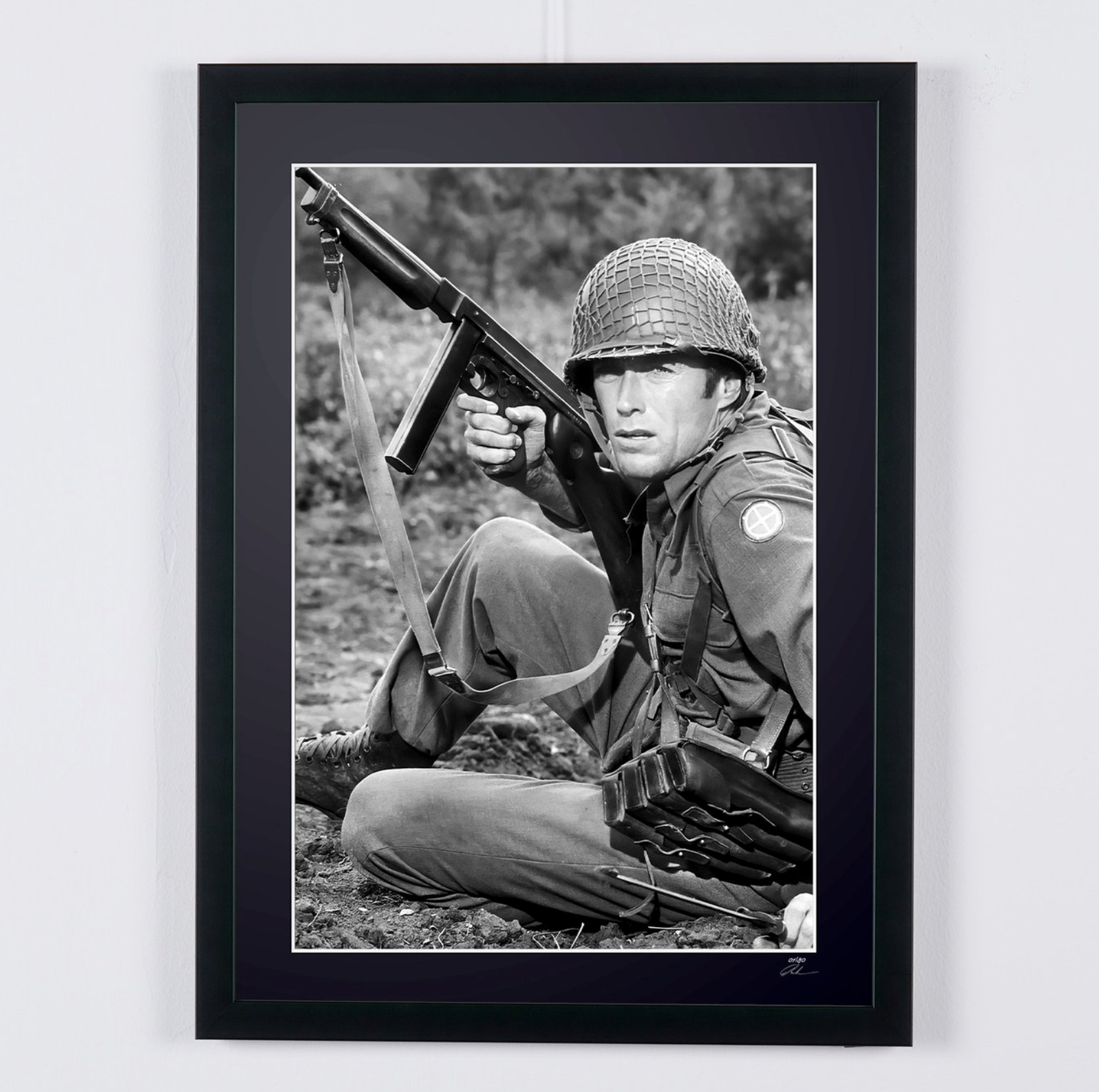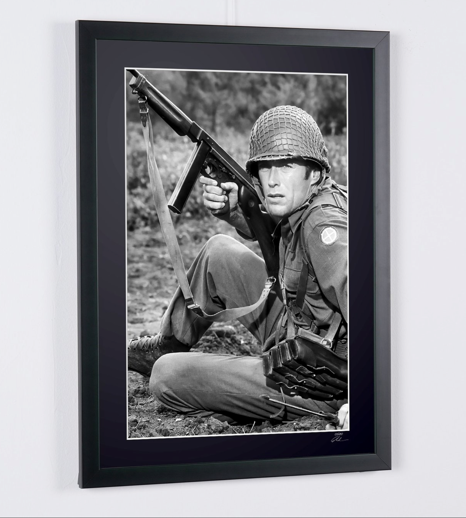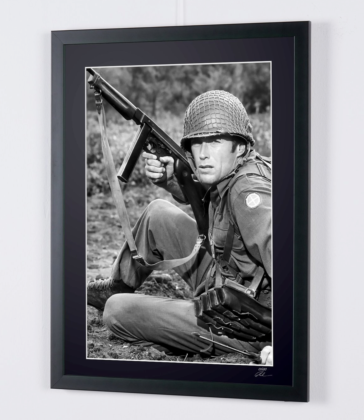 Foto incorniciata tratta da "Kelly's Heroes (1970) - Clint Eastwood nel ruolo del soldato Kelly sul set" — Stampa artistica in bianco e nero su carta Fine Art 70x50 cm