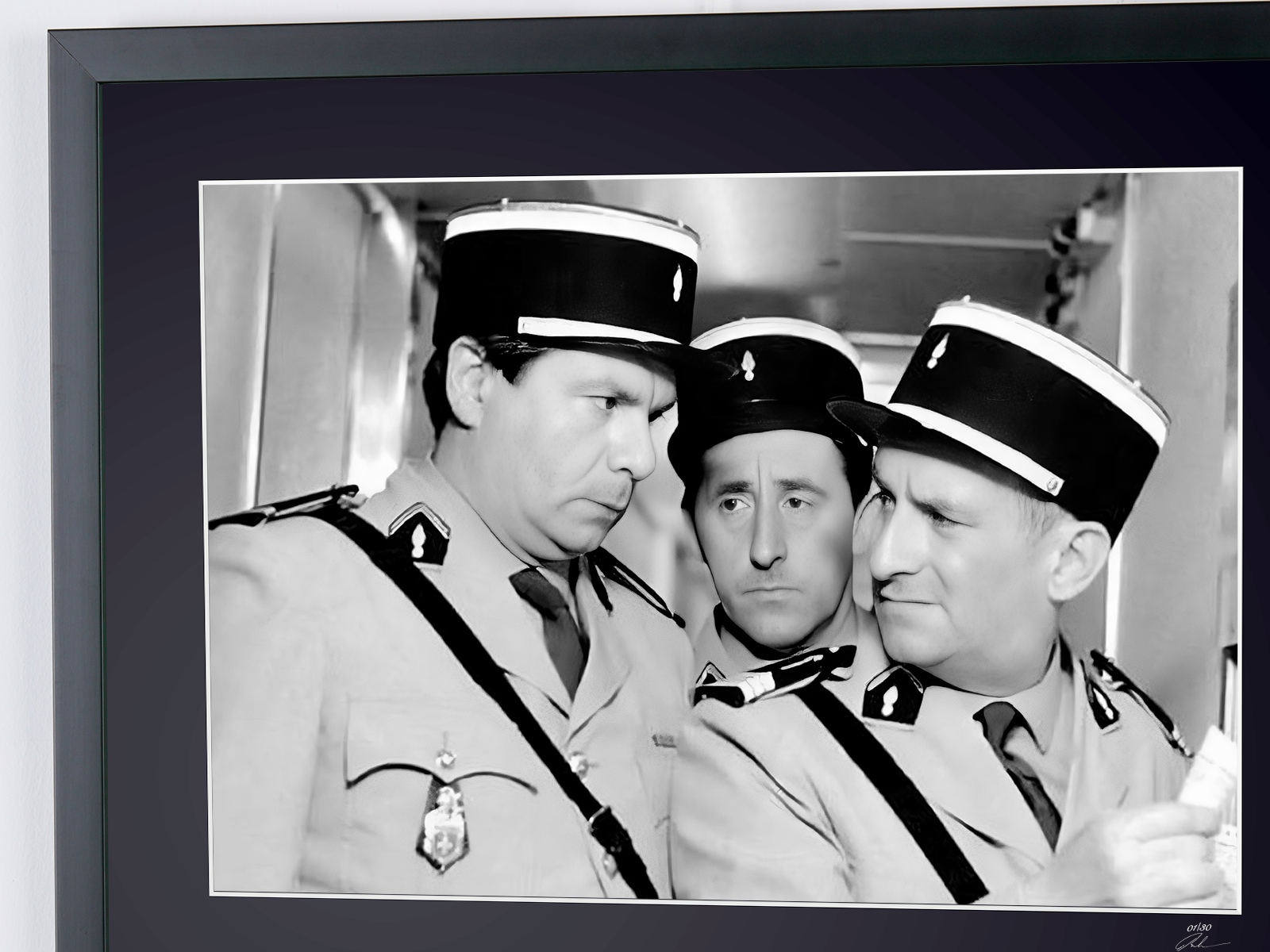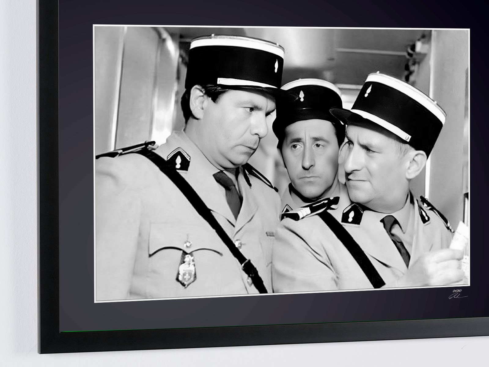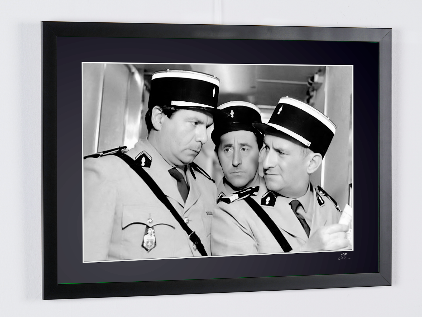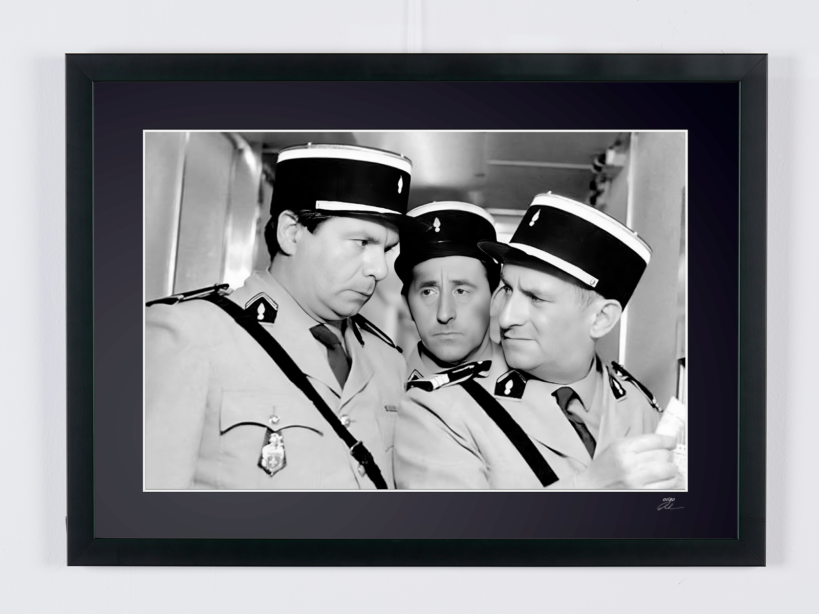 Foto incorniciata tratta dal film "Il gendarme di Saint-Tropez - Louis de Funès, Michel Galabru, Jean Lefèvre" — Stampa artistica in bianco e nero su carta Fine Art 70x50 cm