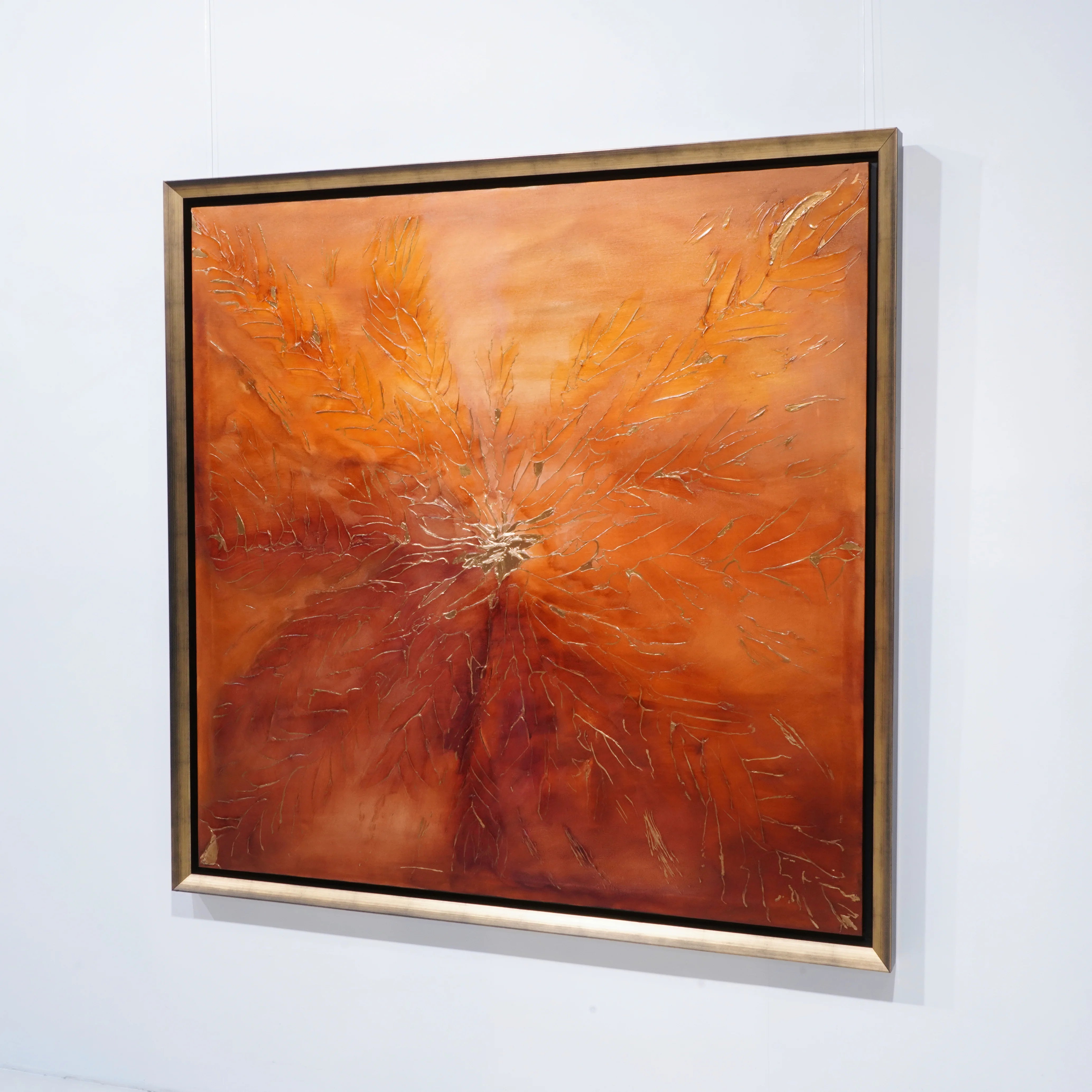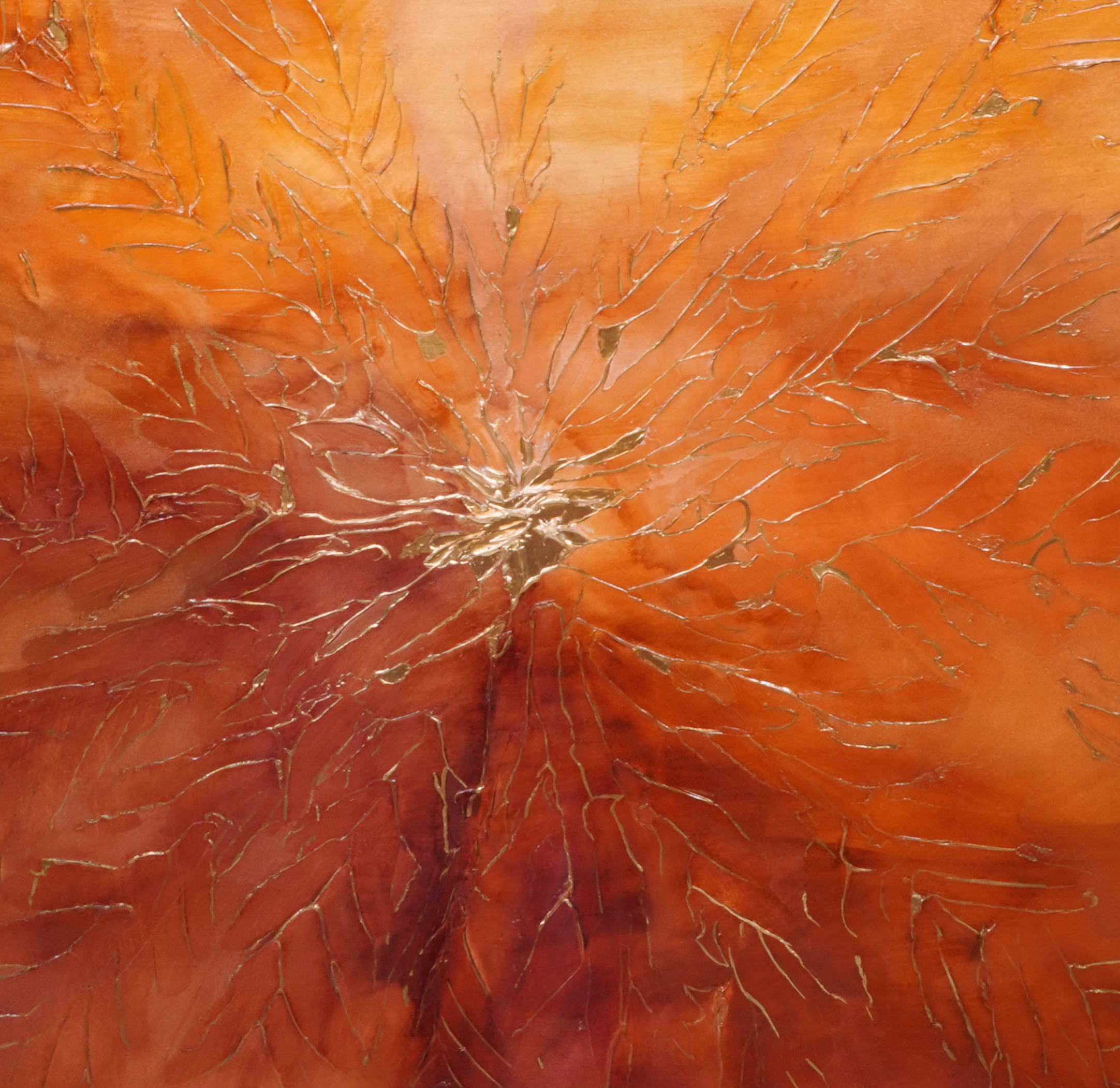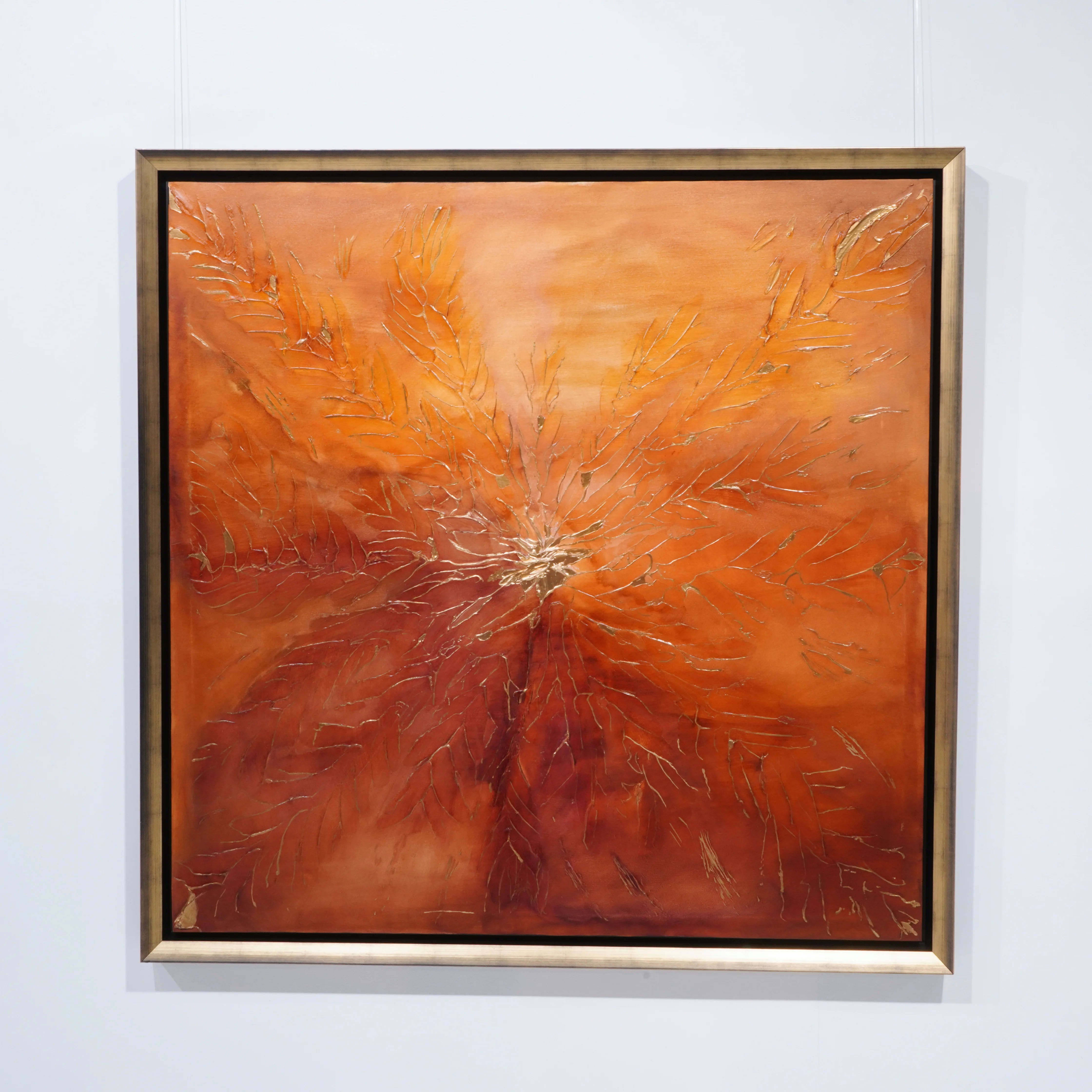 Otoño is een hedendaags abstract kunstwerk van Elvira Lopez, uitgevoerd in acrylverf op doek met bladgoud. Dit unieke werk van groot formaat (150 x 150 cm ) is een ode aan de herfst door middel van een intens kleurenpalet van oranje, koper en dieprood, dat de warmte, het licht en de transformatie van de natuur oproept.