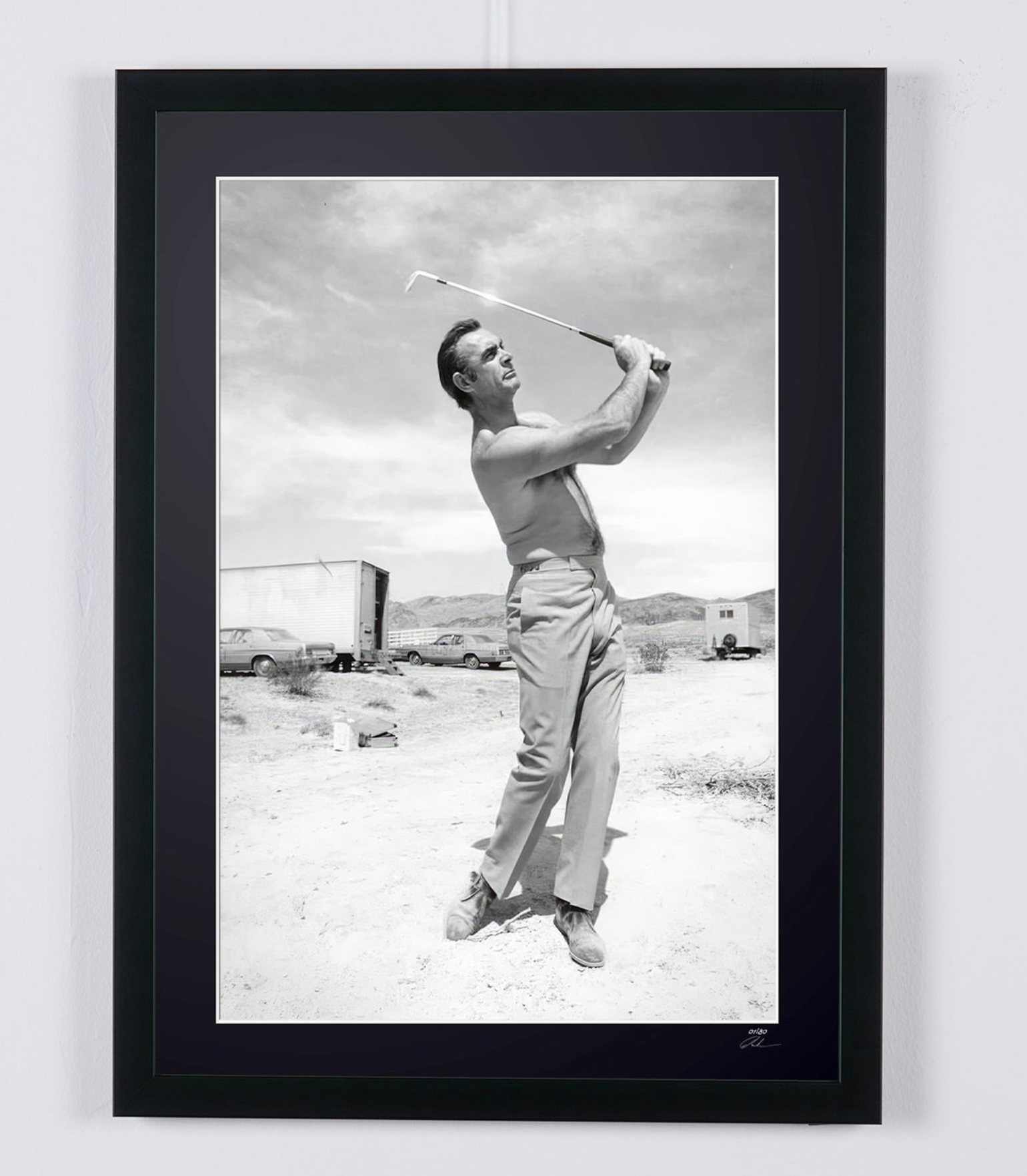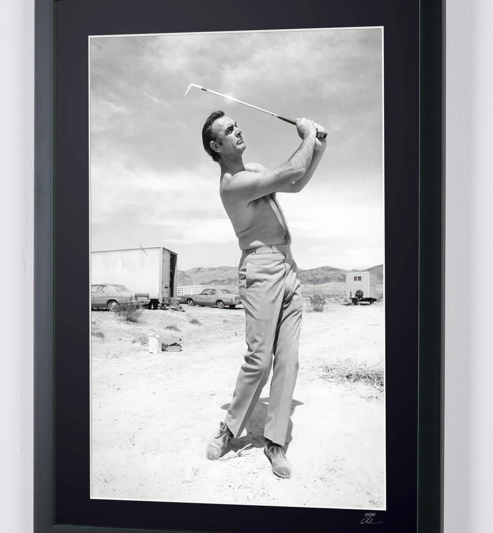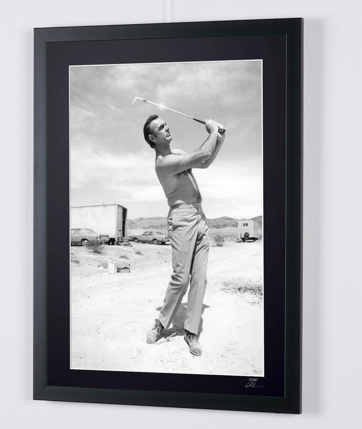 Ingelijste foto van "Diamonds are forever - Sean Connery aan het golfen in Las Vegas, Nevada - 1971 - Houten lijst 70x50 cm - Origineel certificaat (COA), hologramlogo van de uitgever en QR-code" — Zwart-wit kunstafdruk op Fine Art-papier 70x50 cm