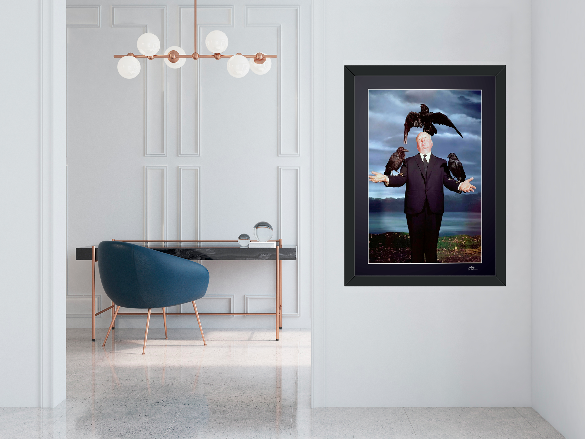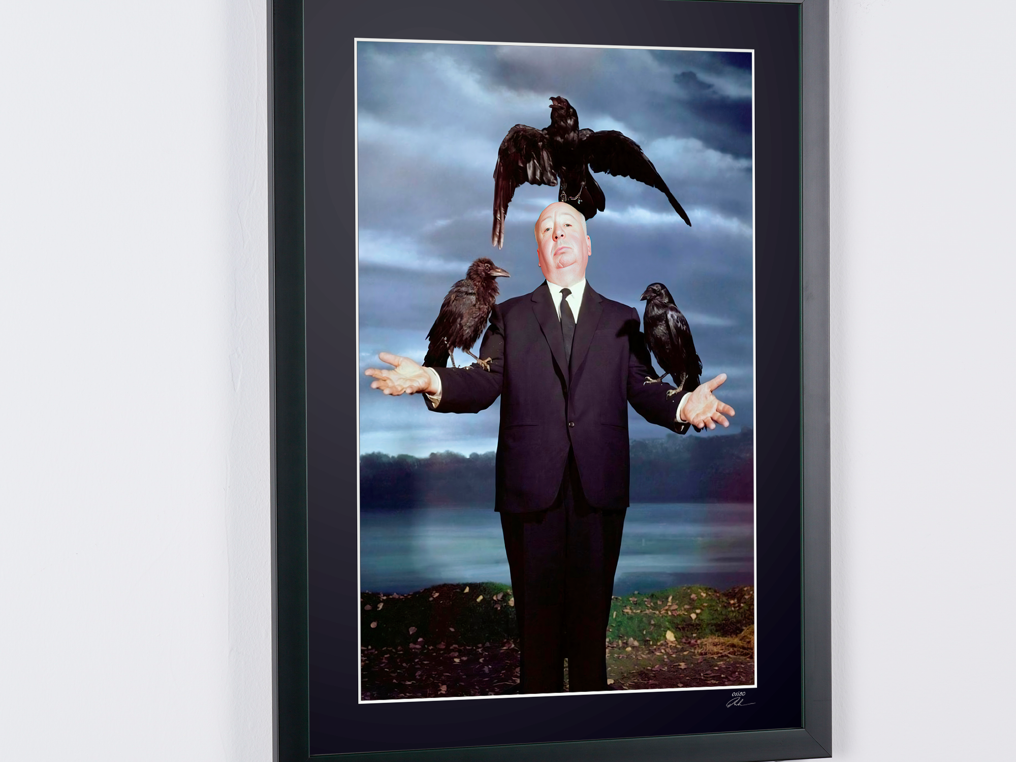 Ingelijste foto van "Alfred Hitchcock - The Birds 1963" — Zwart-wit kunstafdruk op Fine Art-papier 70x50 cm