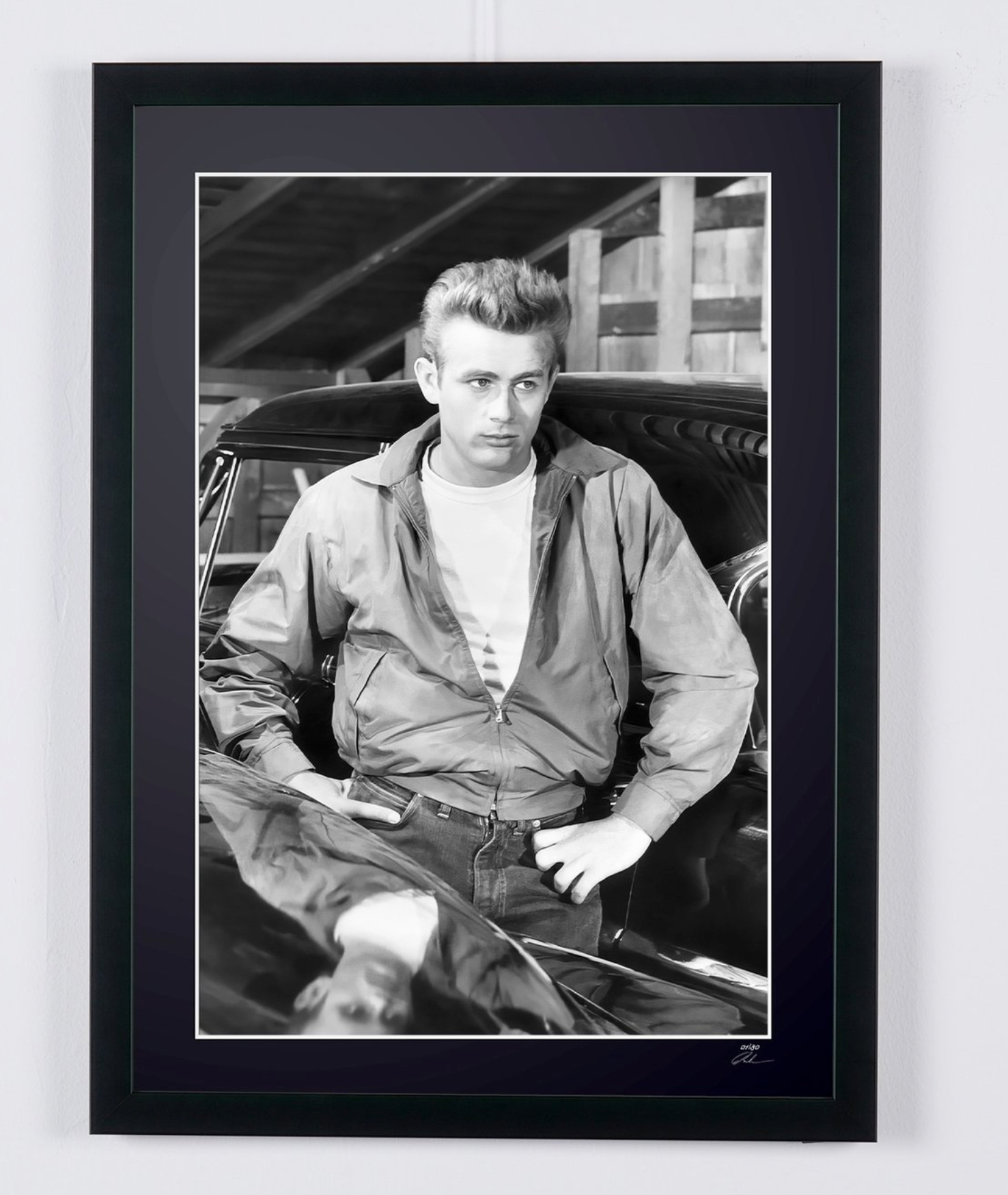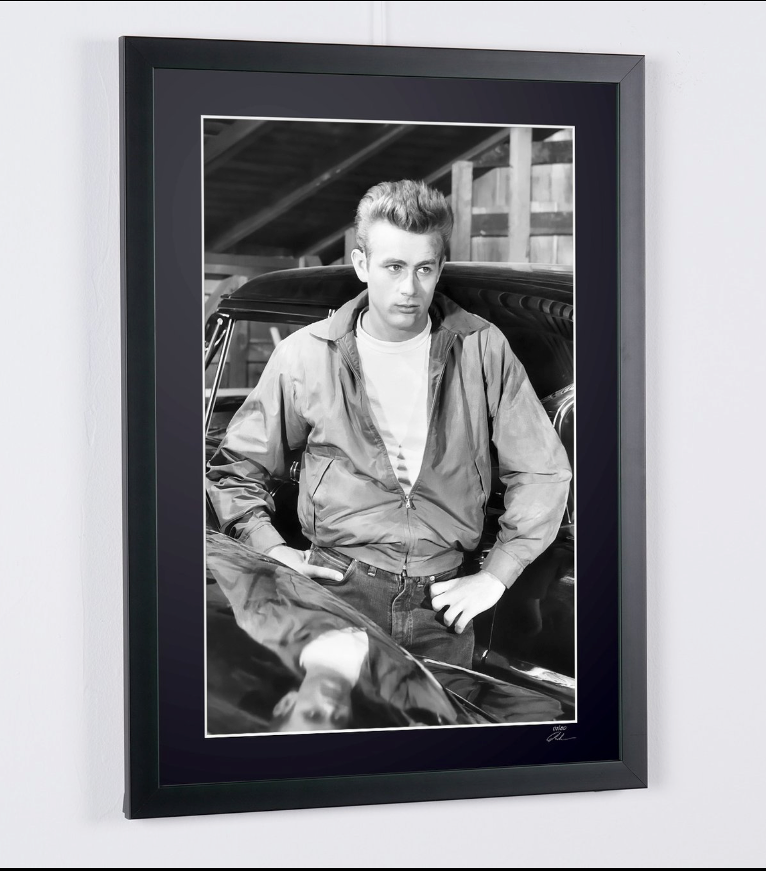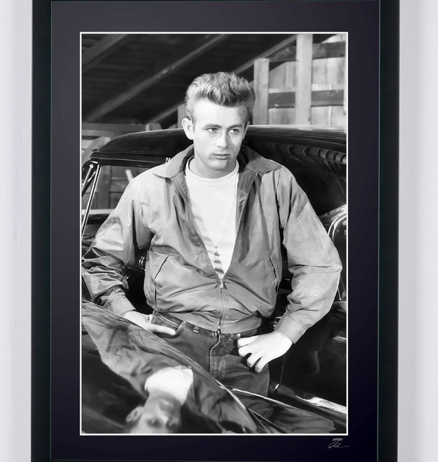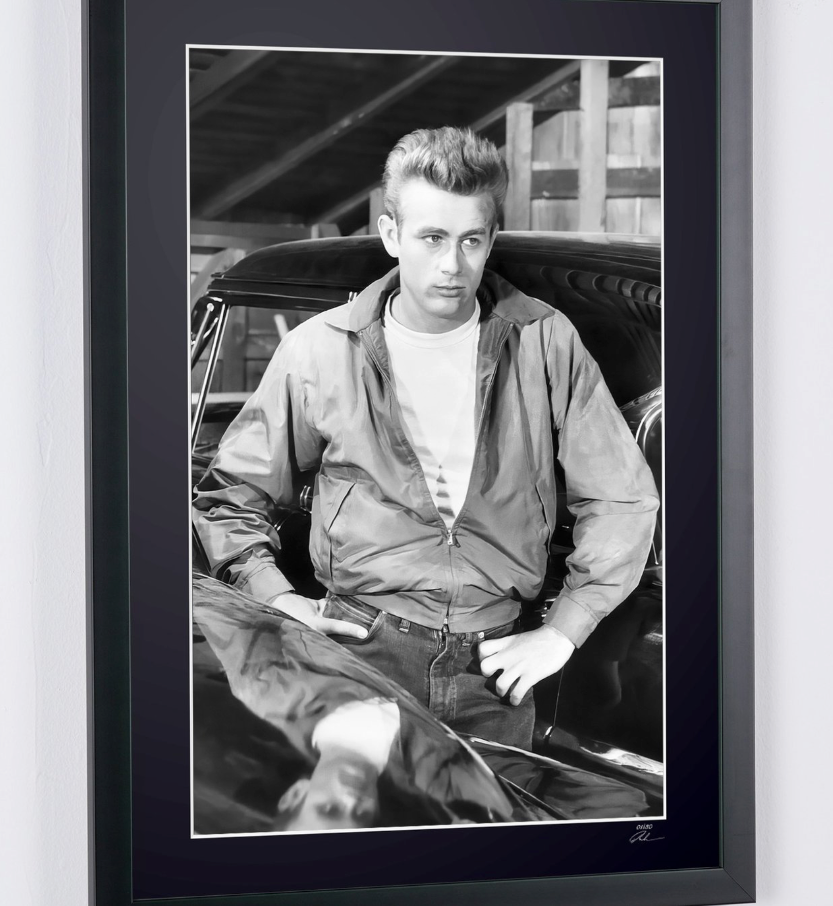 Ingelijste foto van "Rebel Without a Cause (1955) - James Dean als Jim Stark" — Kunstafdruk in zwart-wit op Fine Art-papier 70 x 50 cm