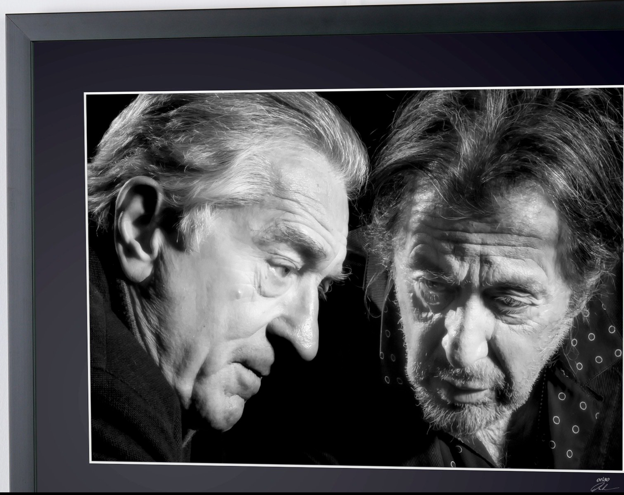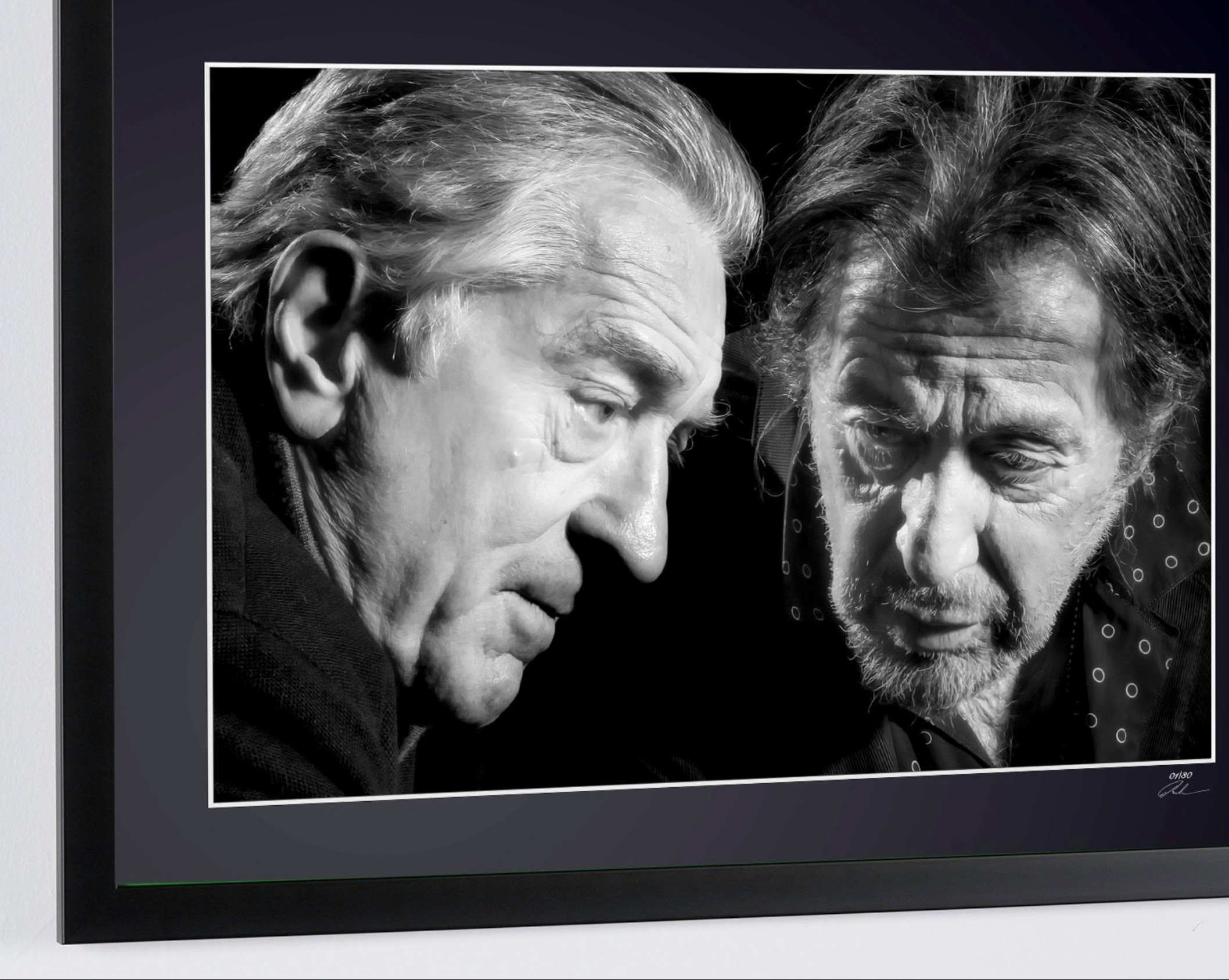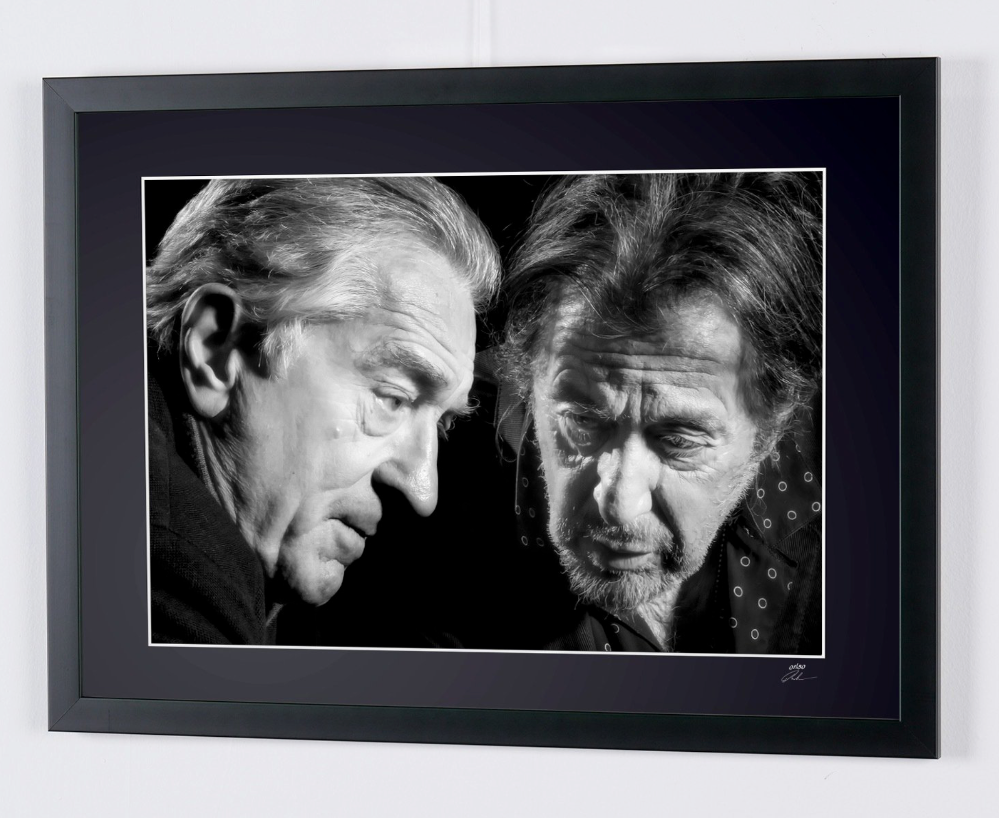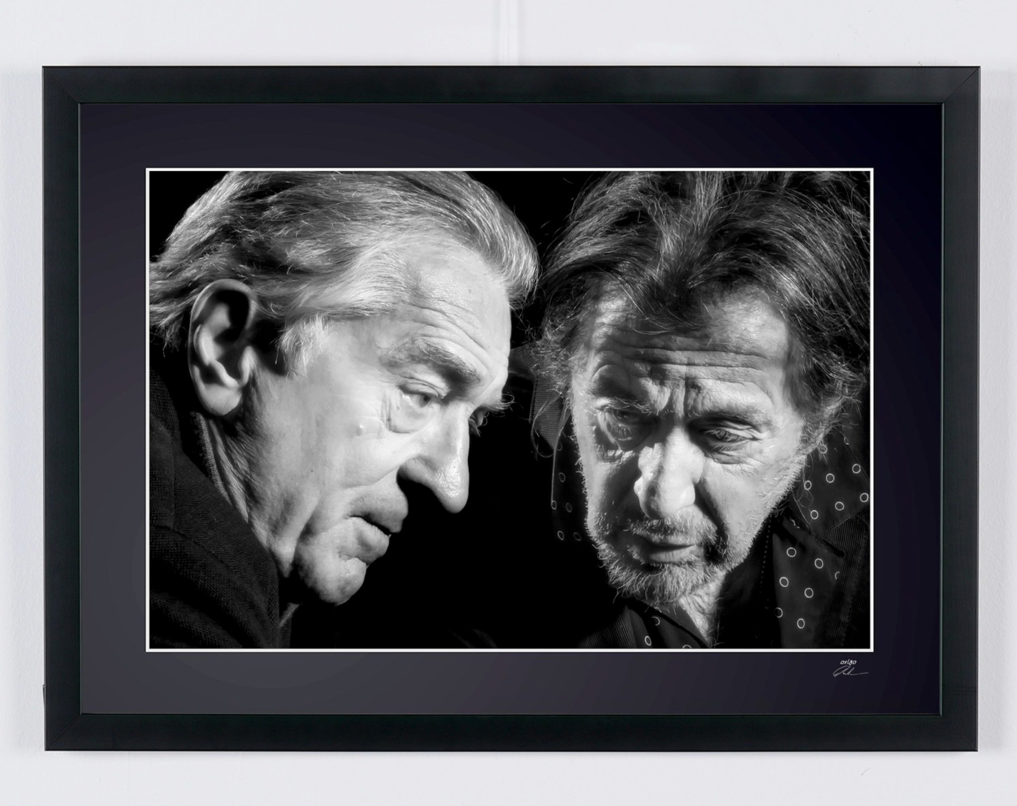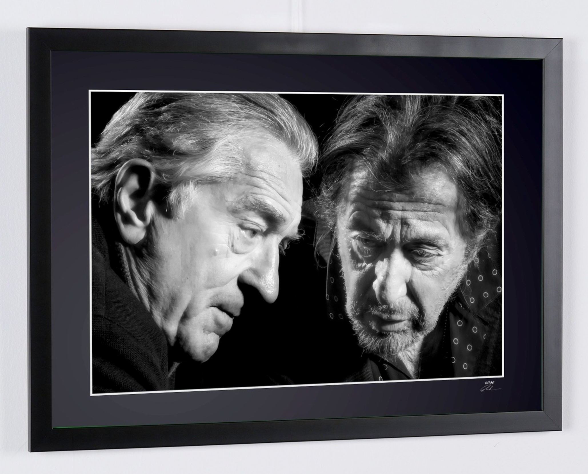 Ingelijste foto van "Robert De Niro & Al Pacino - Hollywood Legends" — Kunstafdruk in zwart-wit op Fine Art-papier 70 x 50 cm