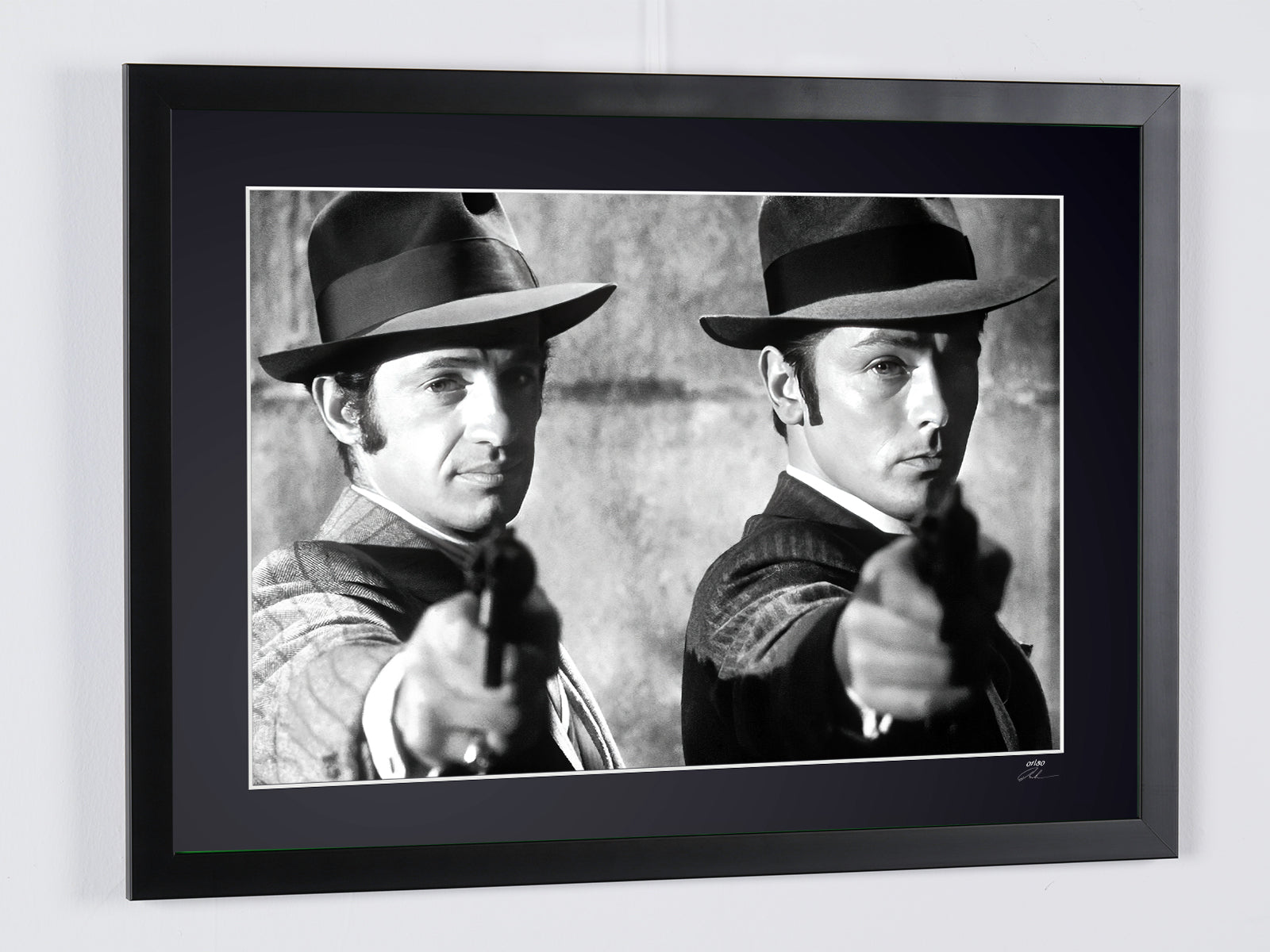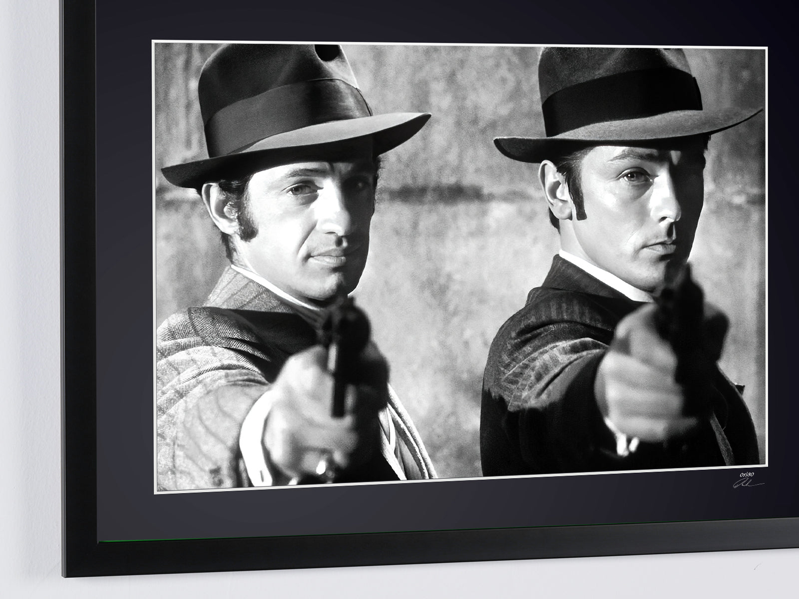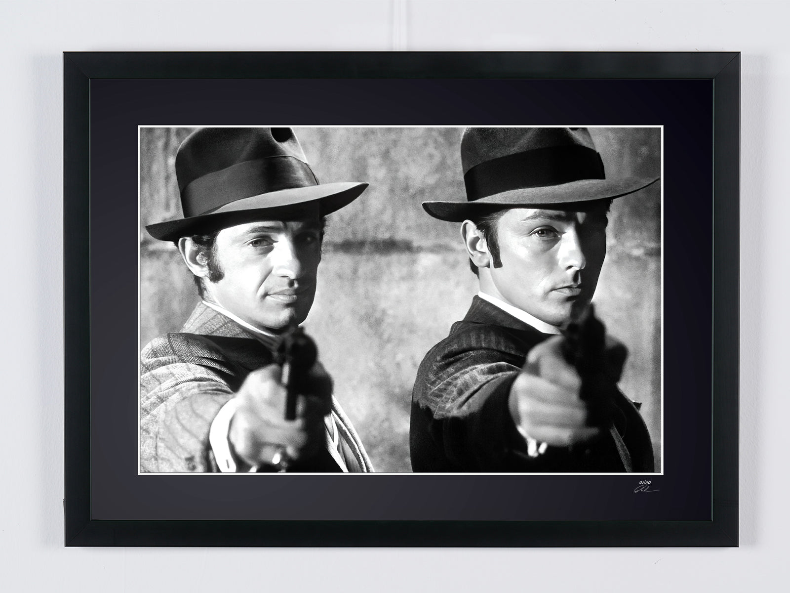 Photo encadrée de "Borsalino 1970 - Jean-Paul Belmondo (François Capella) & Alain Delon (Roch Siffredi)" — Tirage d'art noir et blanc sur papier Fine Art 70x50 cm
