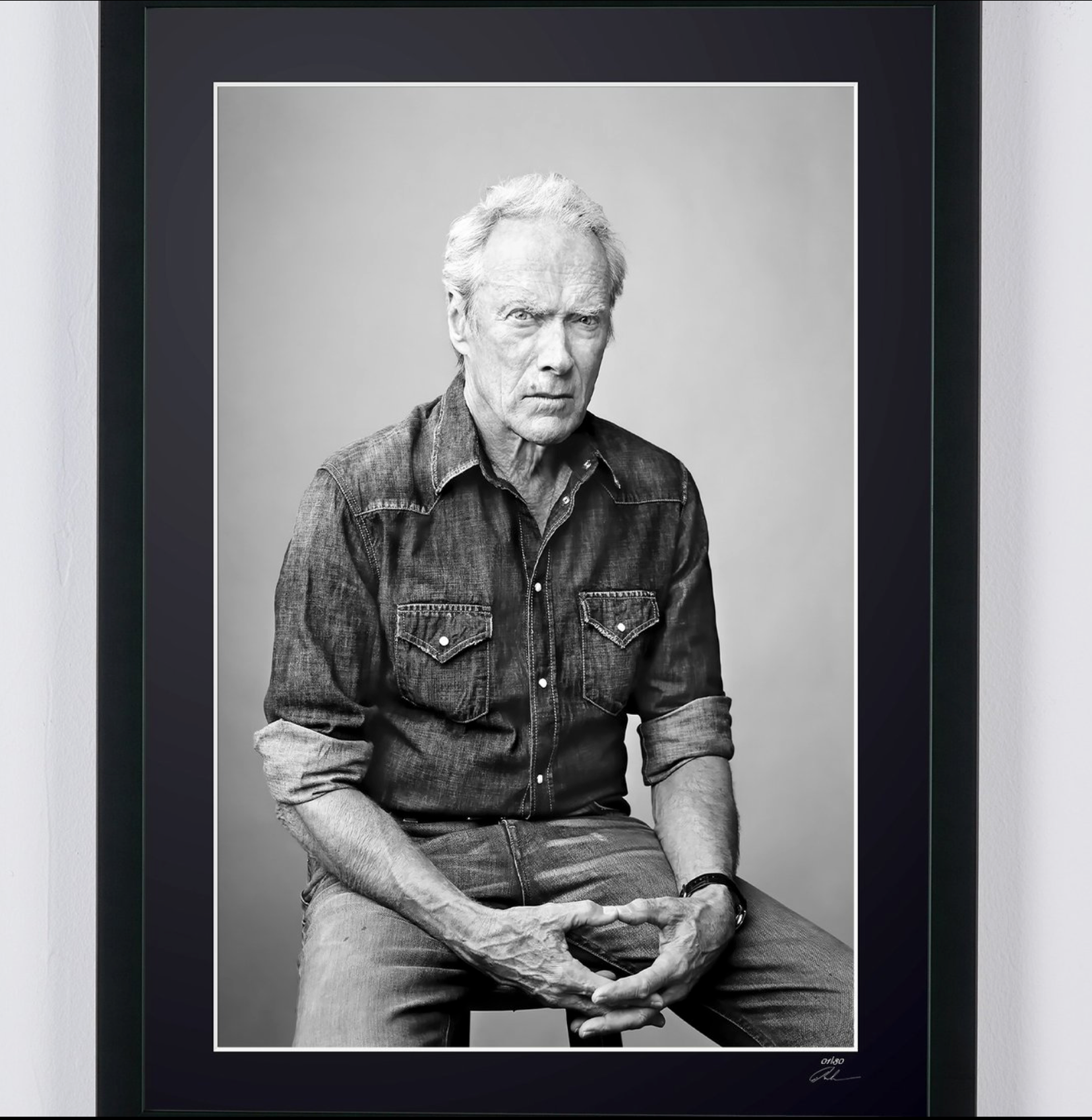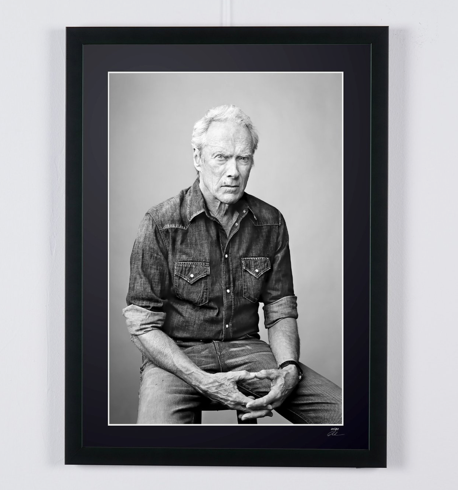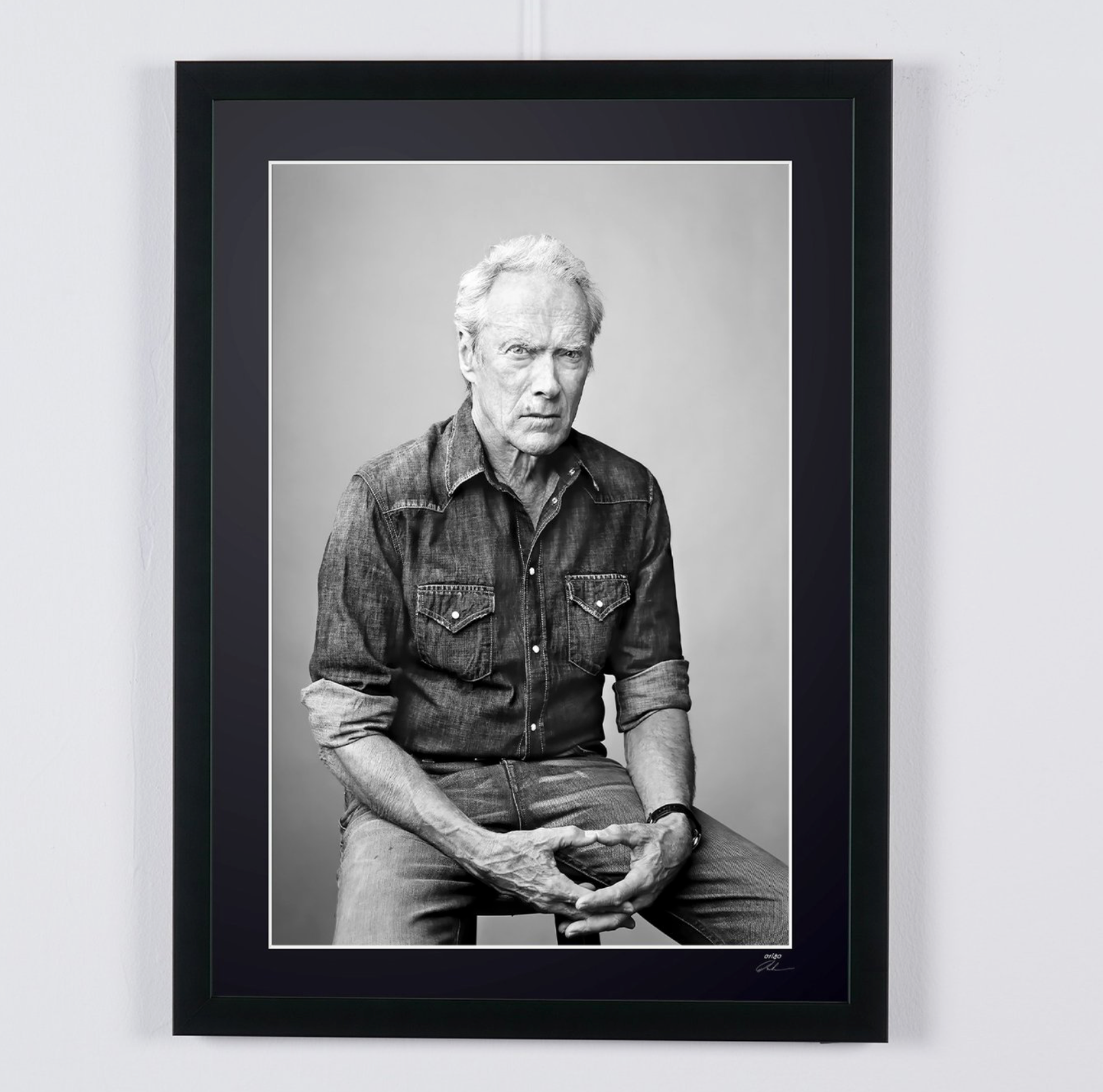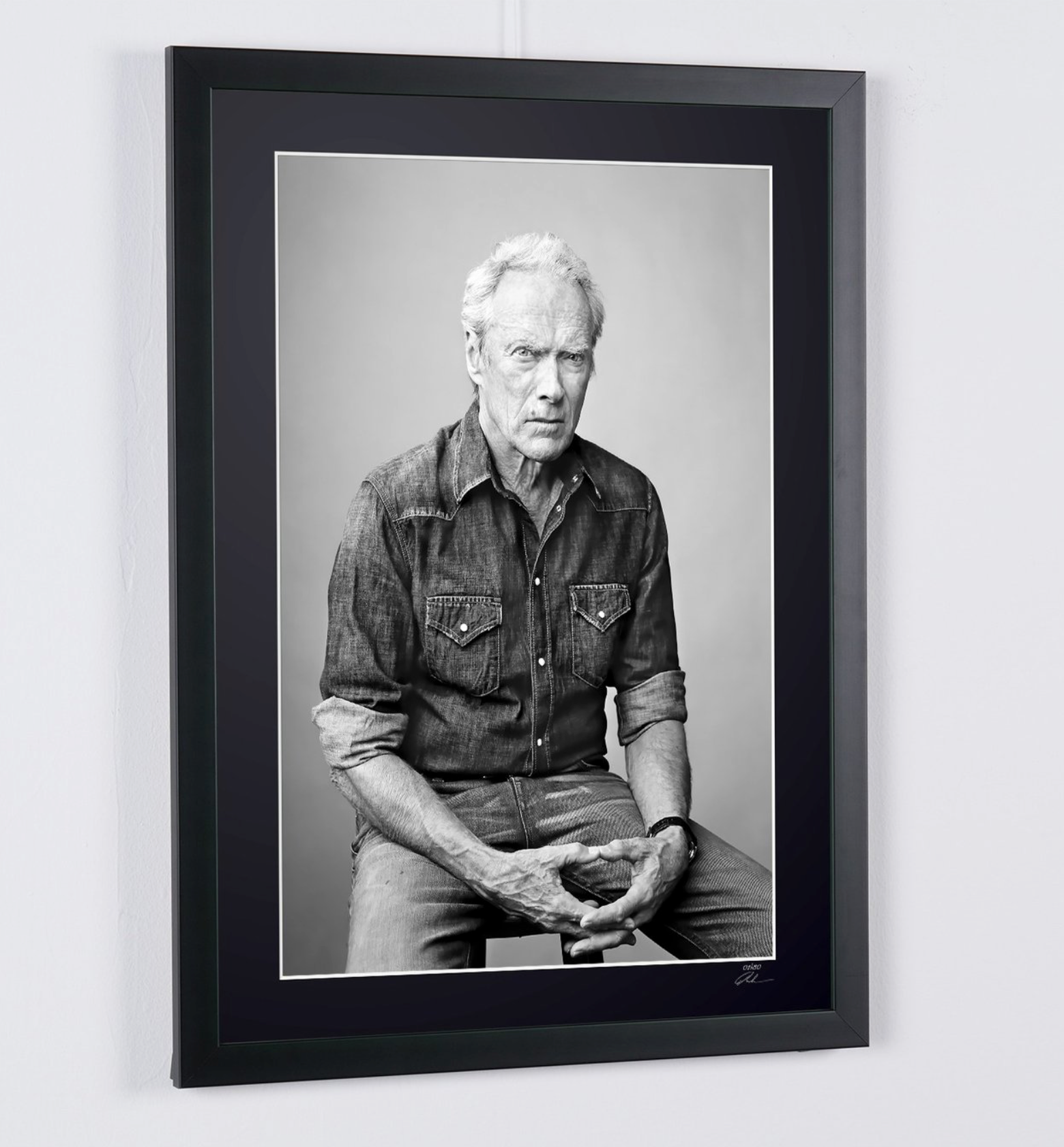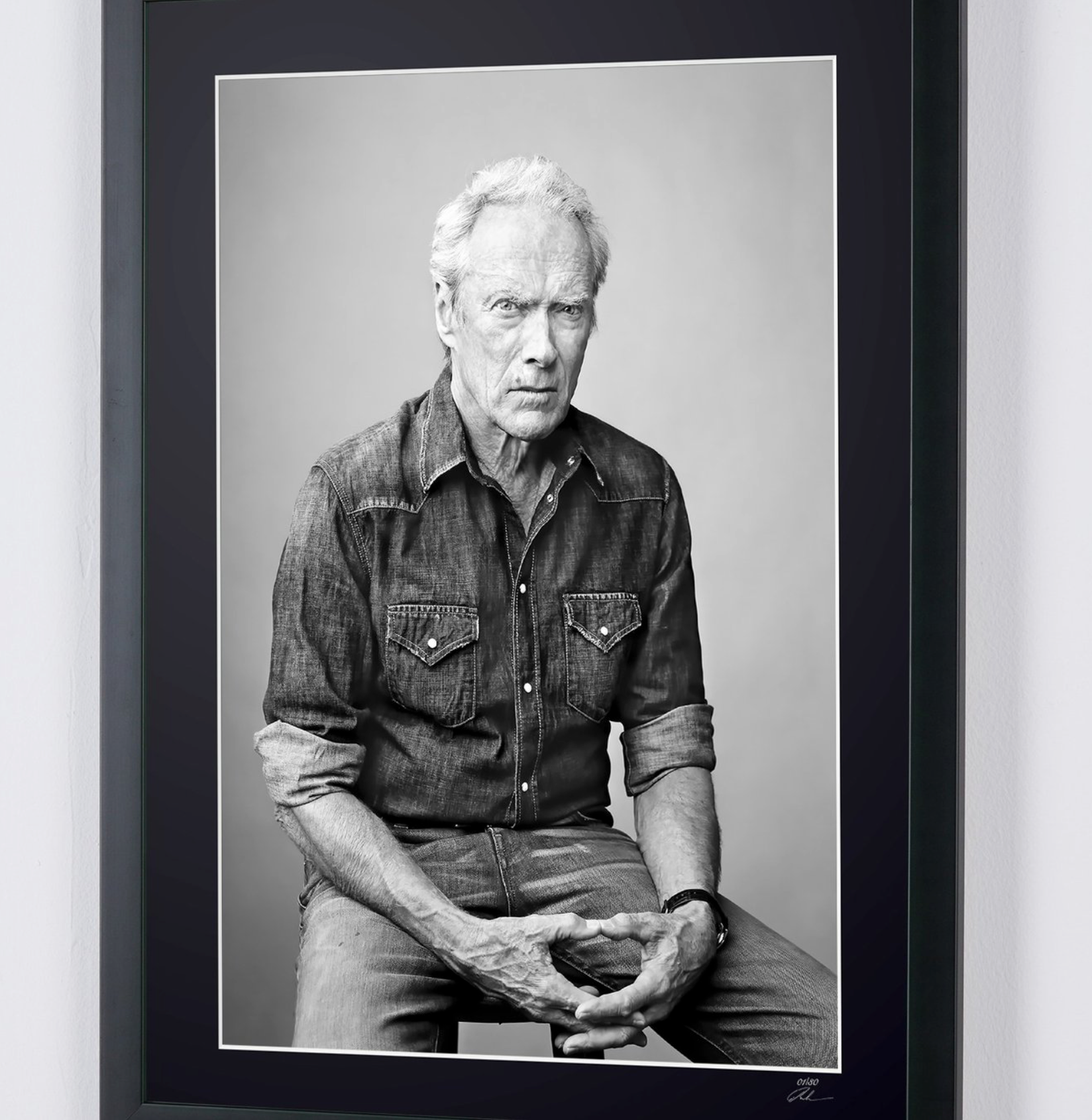 Photo encadrée de "Clint Eastwood -Portrait Of Legend" — Tirage d'art noir et blanc sur papier Fine Art 70x50 cm
