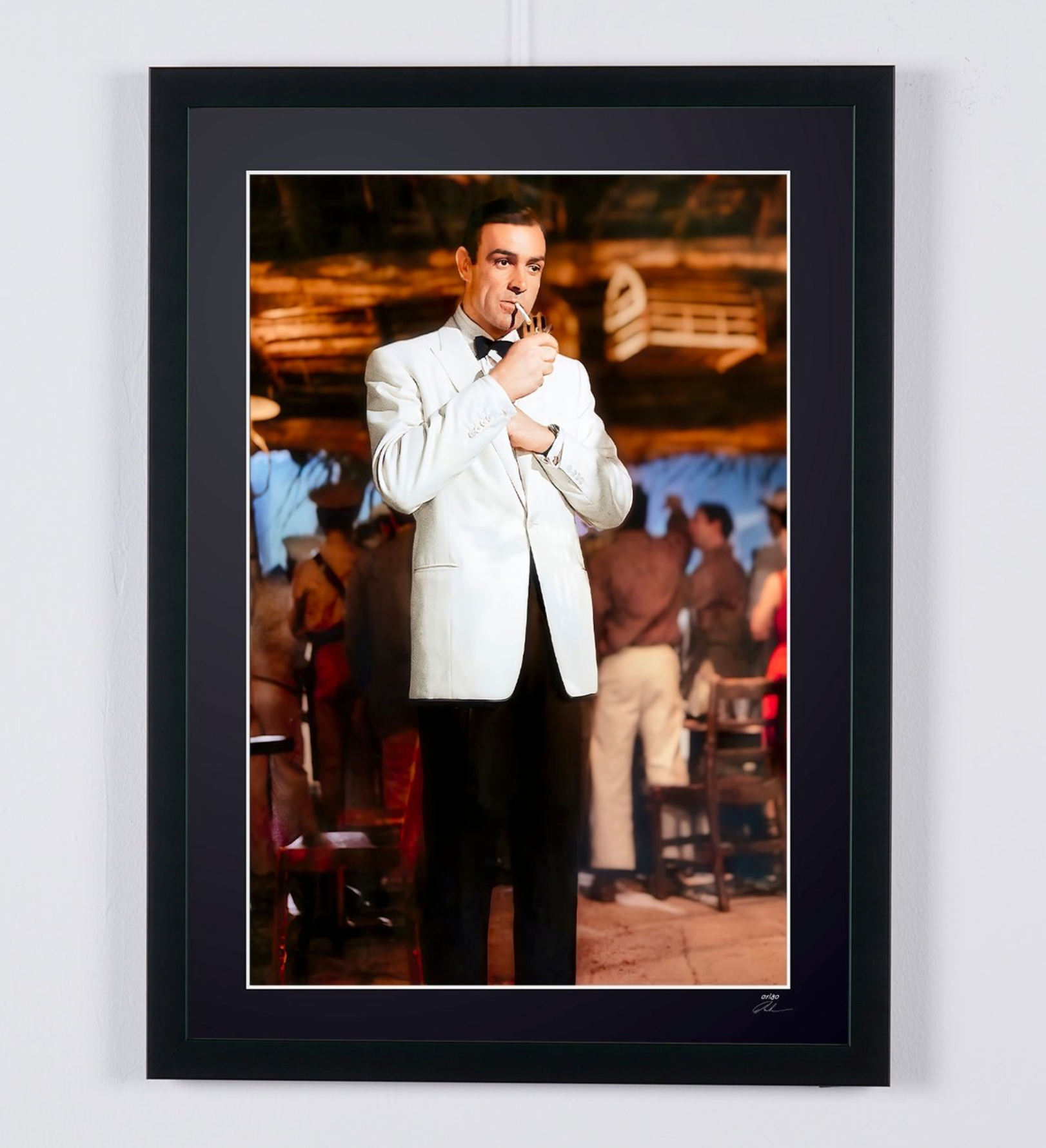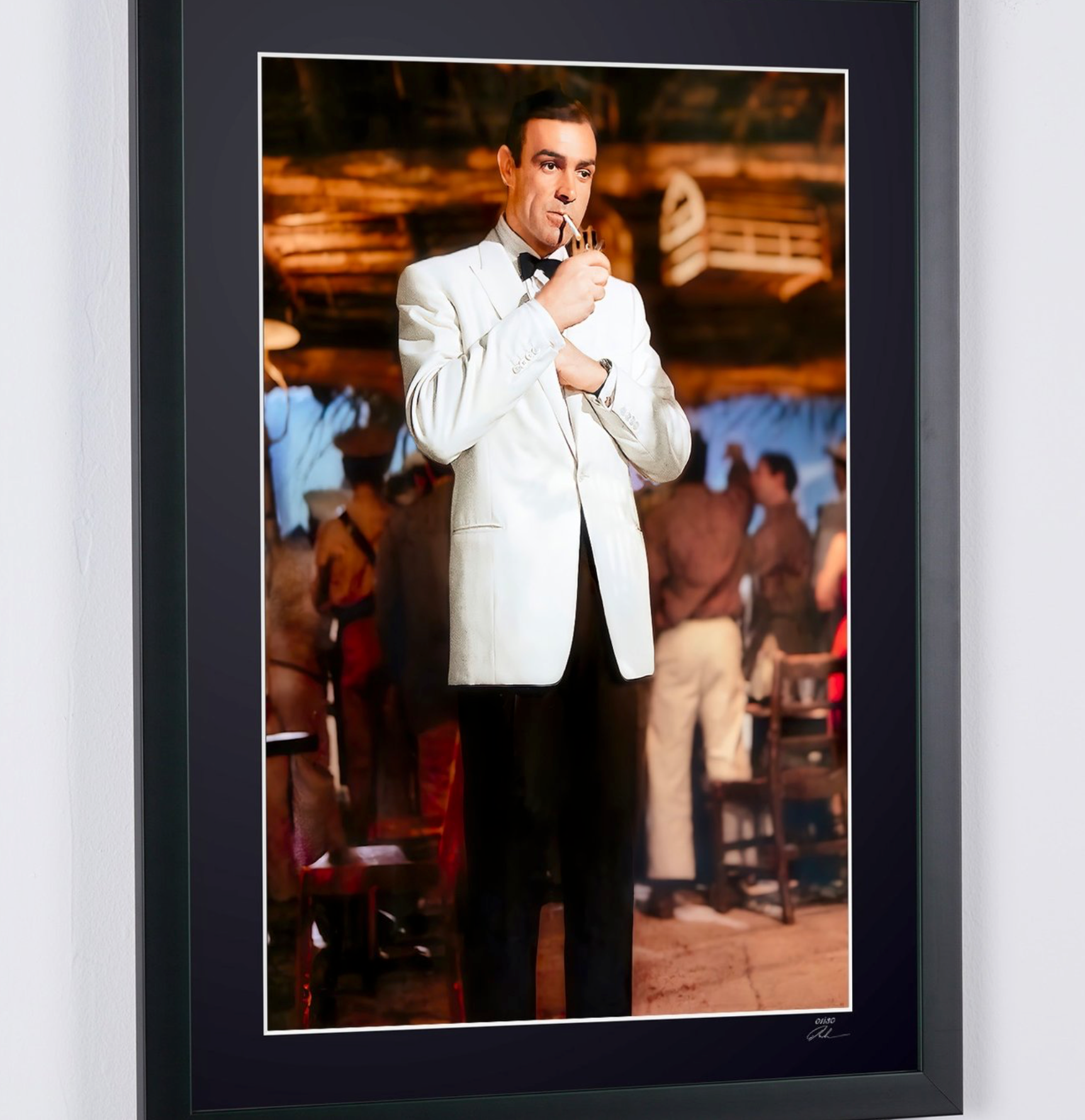 Photo encadrée de "James Bond 007: Goldfinger - Sean Connery in Classic White Tuxedo" — Tirage d'art noir et blanc sur papier Fine Art 70x50 cm