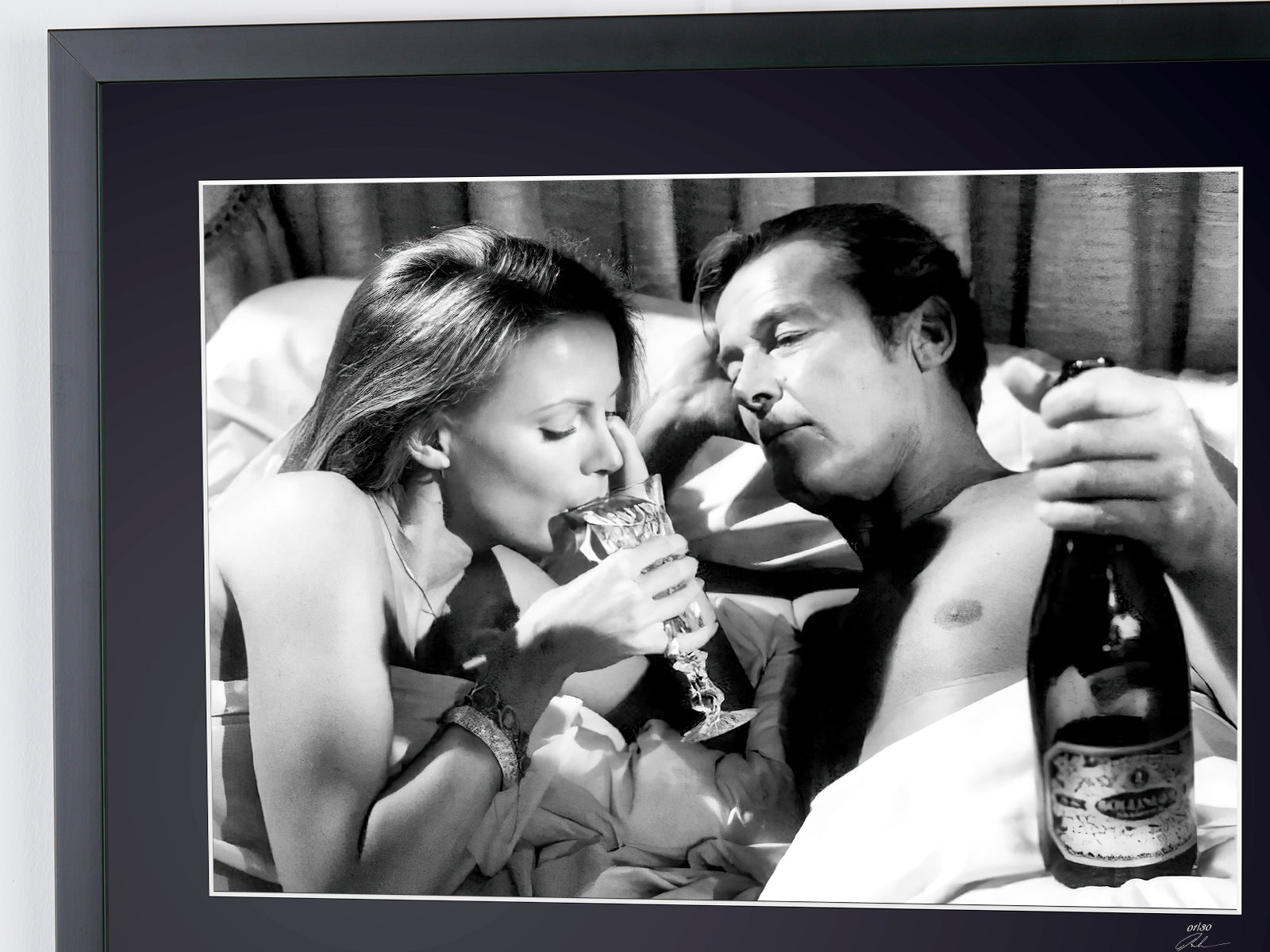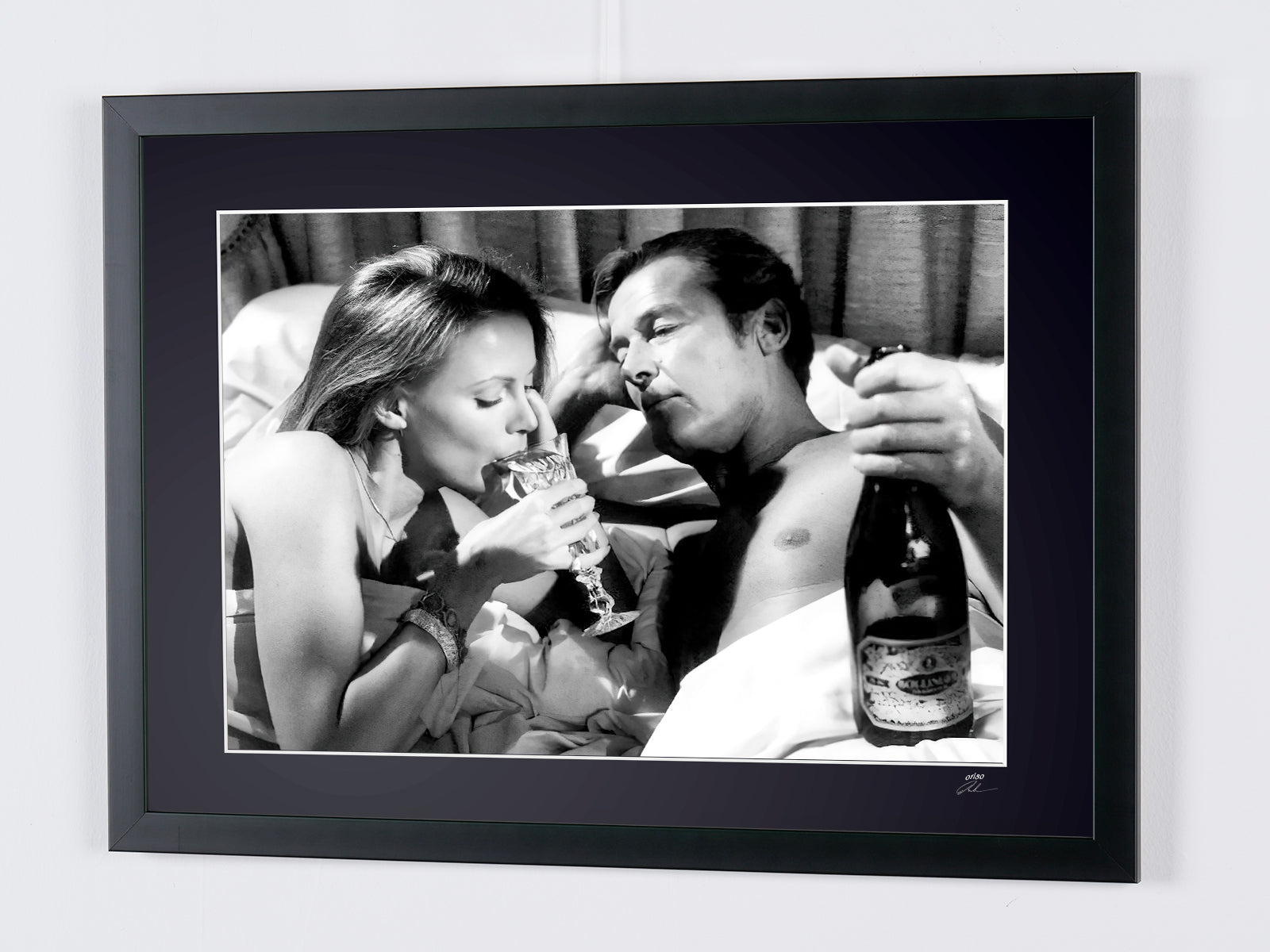 Photo encadrée de "James Bond 007: Octopussy - Roger Moore & Kristina Wayborn drink Bollinger Champagne" — Tirage d'art noir et blanc sur papier Fine Art 70x50 cm