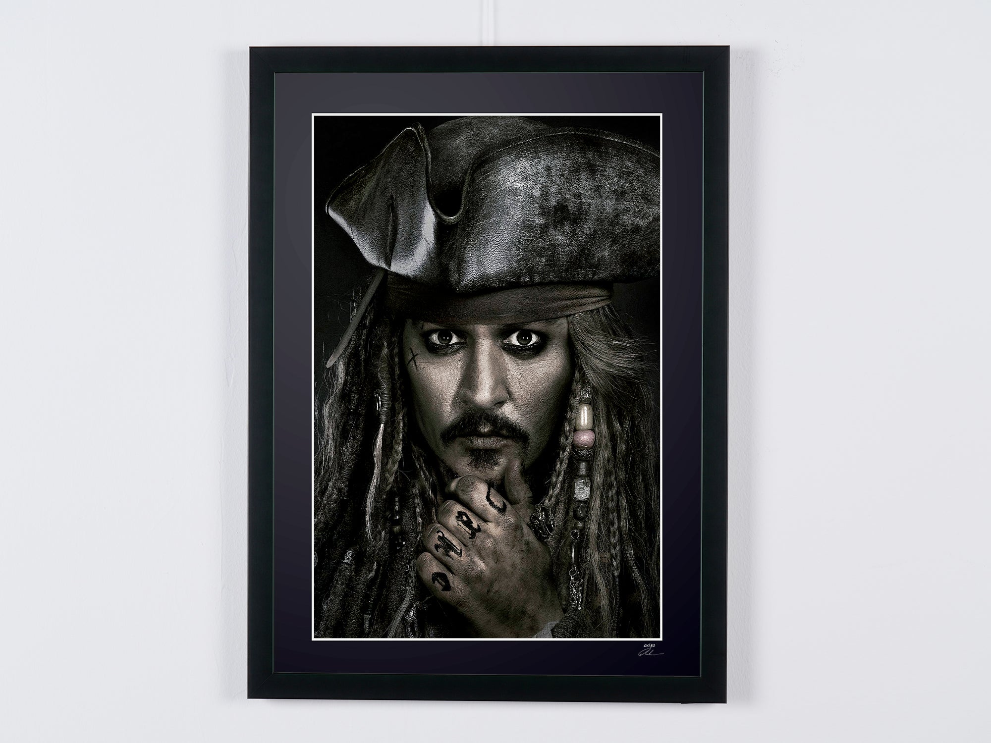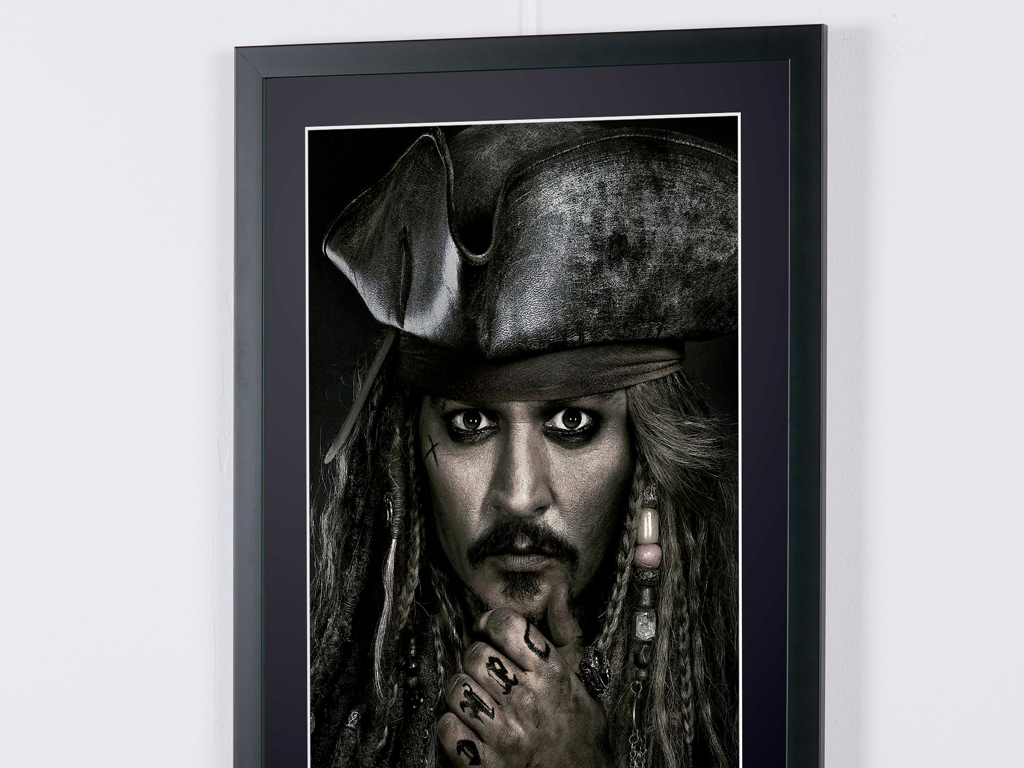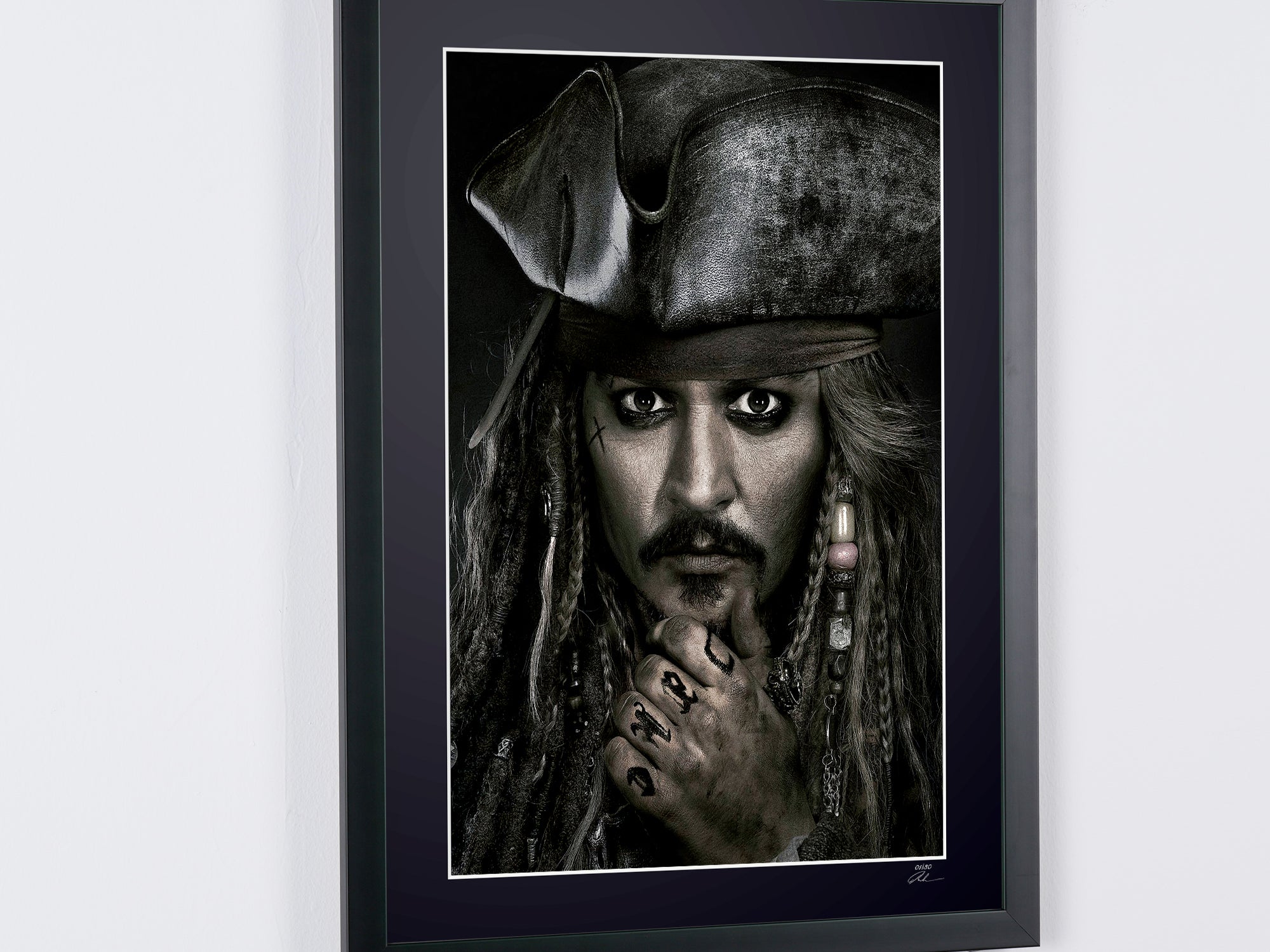 Photo encadrée de "Pirates of the Caribbean - Johnny Depp as Jack Sparrow" — Tirage d'art noir et blanc sur papier Fine Art 70x50 cm
