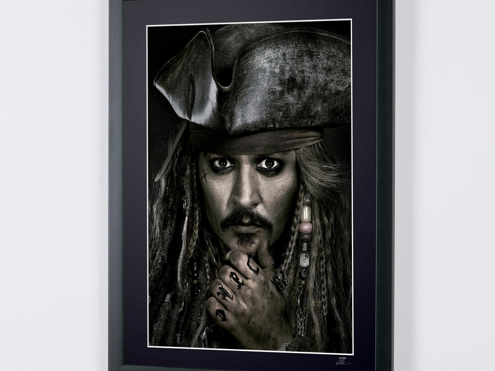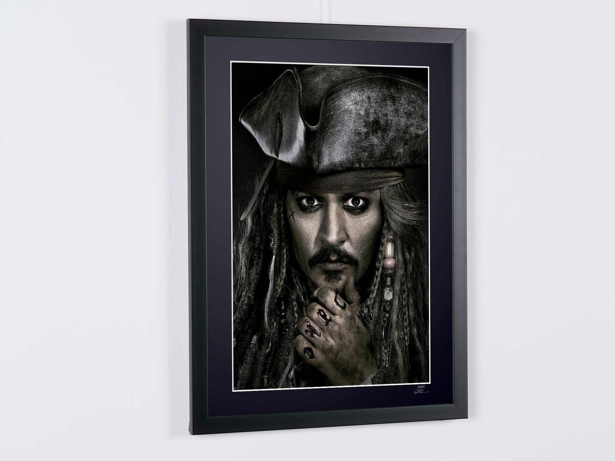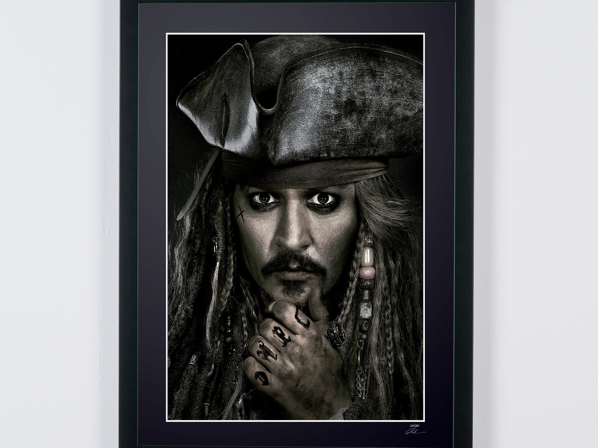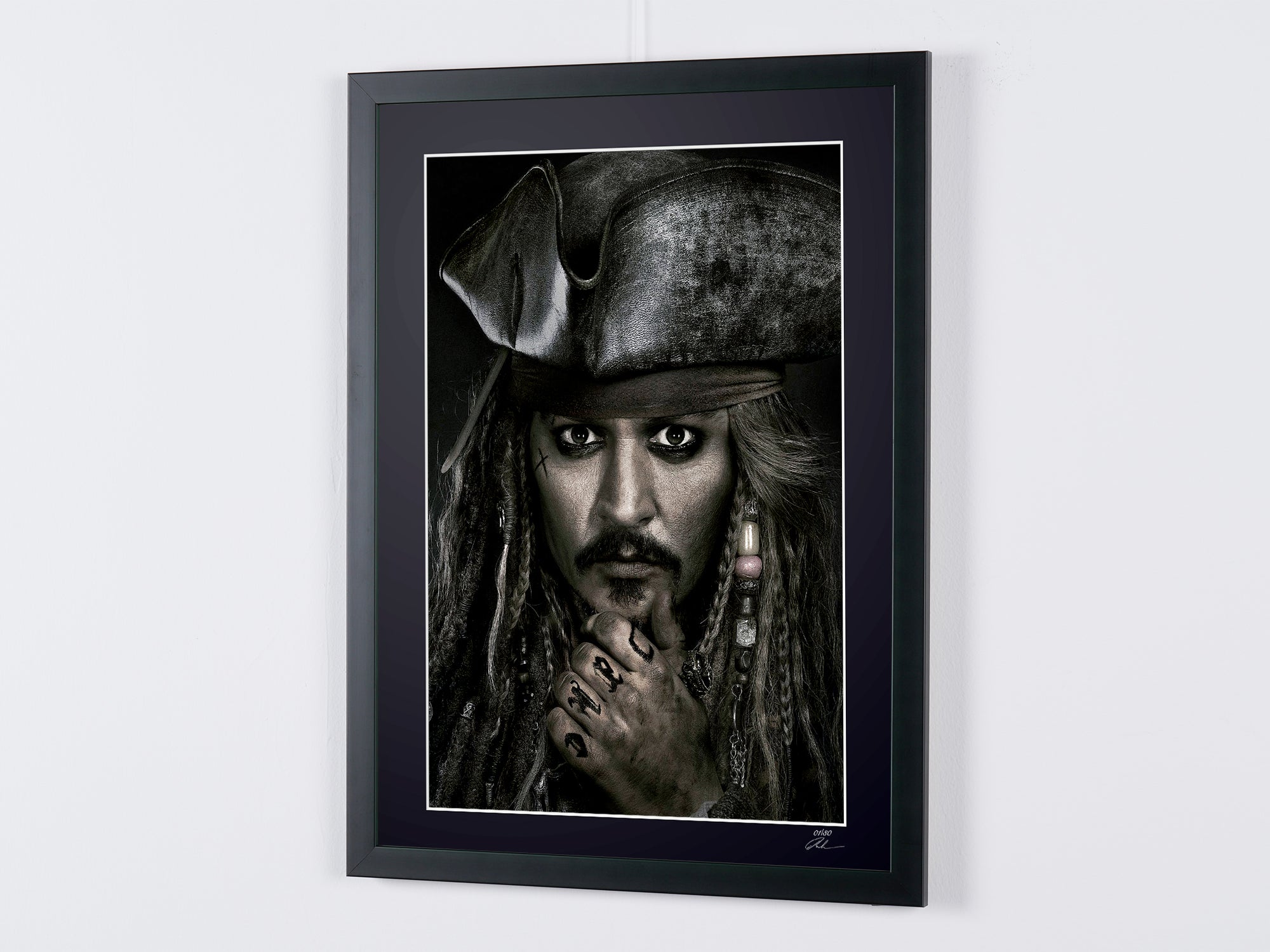 Photo encadrée de "Pirates of the Caribbean - Johnny Depp as Jack Sparrow" — Tirage d'art noir et blanc sur papier Fine Art 70x50 cm