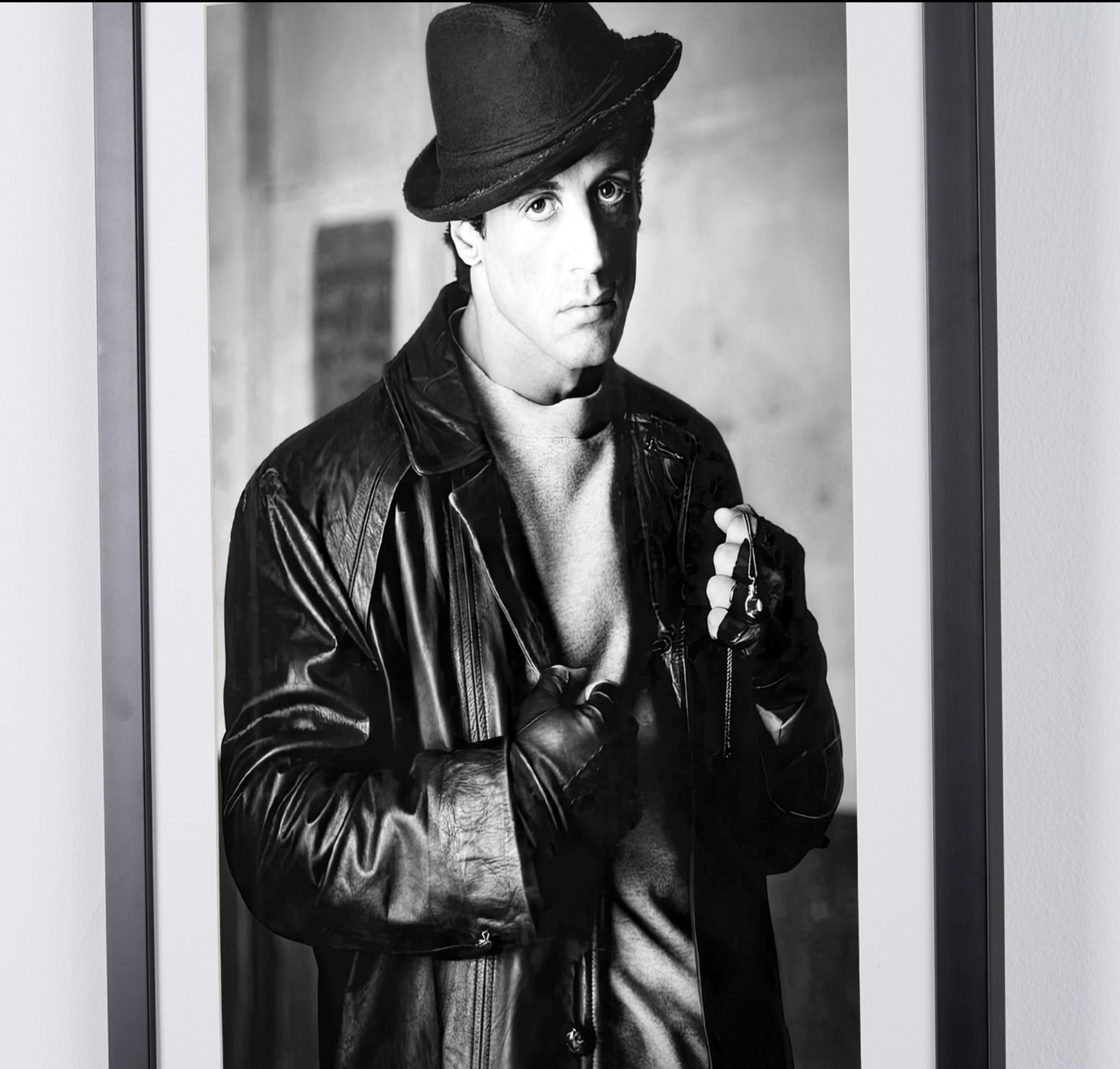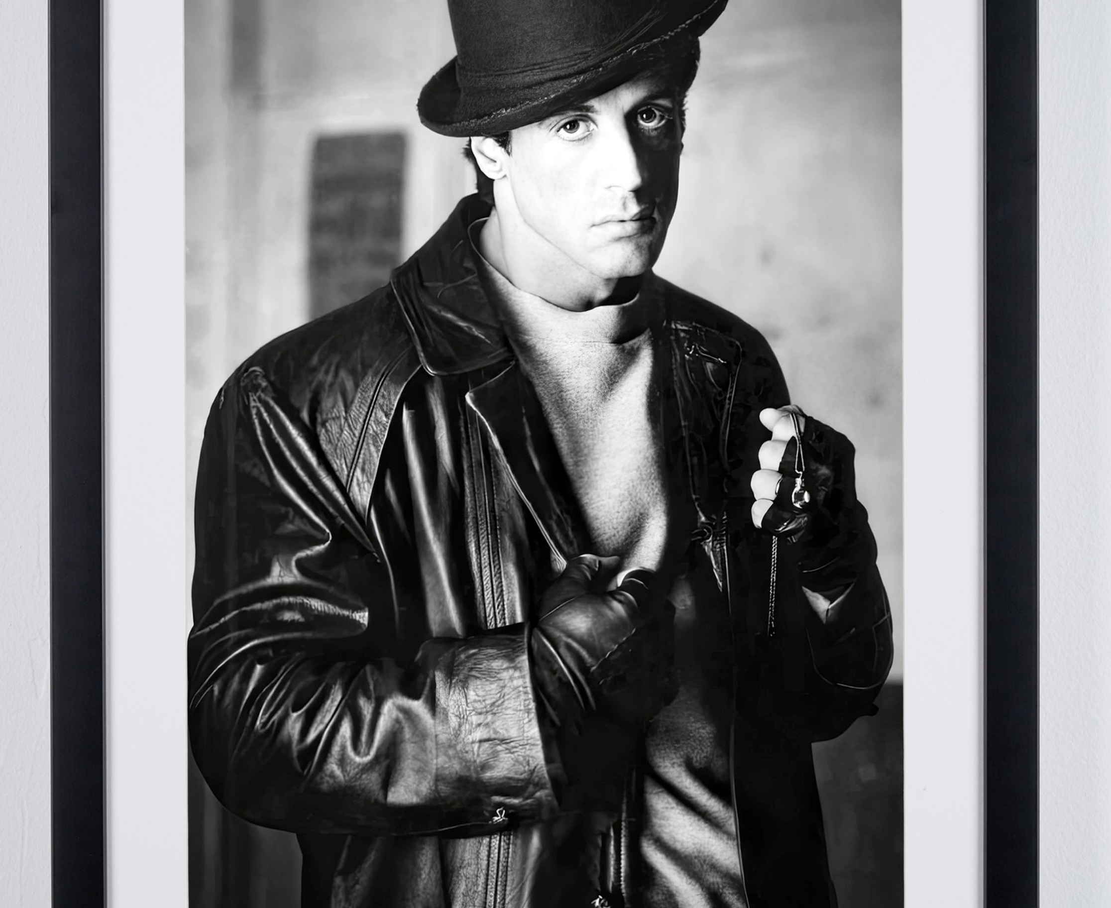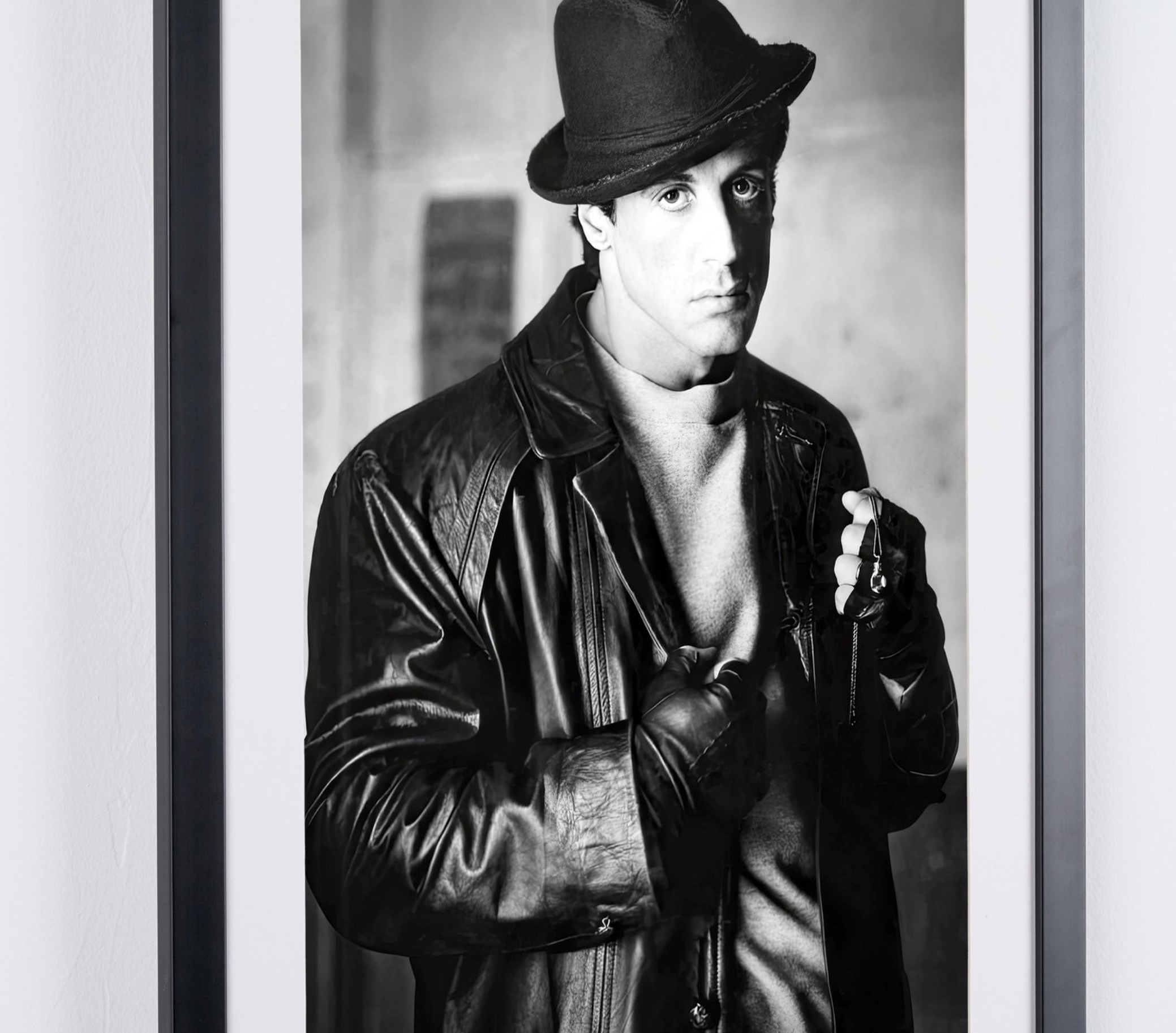 Cette photographie immortalise Sylvester Stallone dans le rôle de Rocky Balboa, tournée dans les quartiers populaires de Philadelphie en 1976. Réalisé par John G. Avildsen avec un budget dérisoire de 1 million de dollars, le film fut écrit par Stallone lui-même en seulement trois jours et demi. L'acteur avait refusé de vendre son scénario sans pouvoir incarner le personnage principal, malgré les offres substantielles des studios.