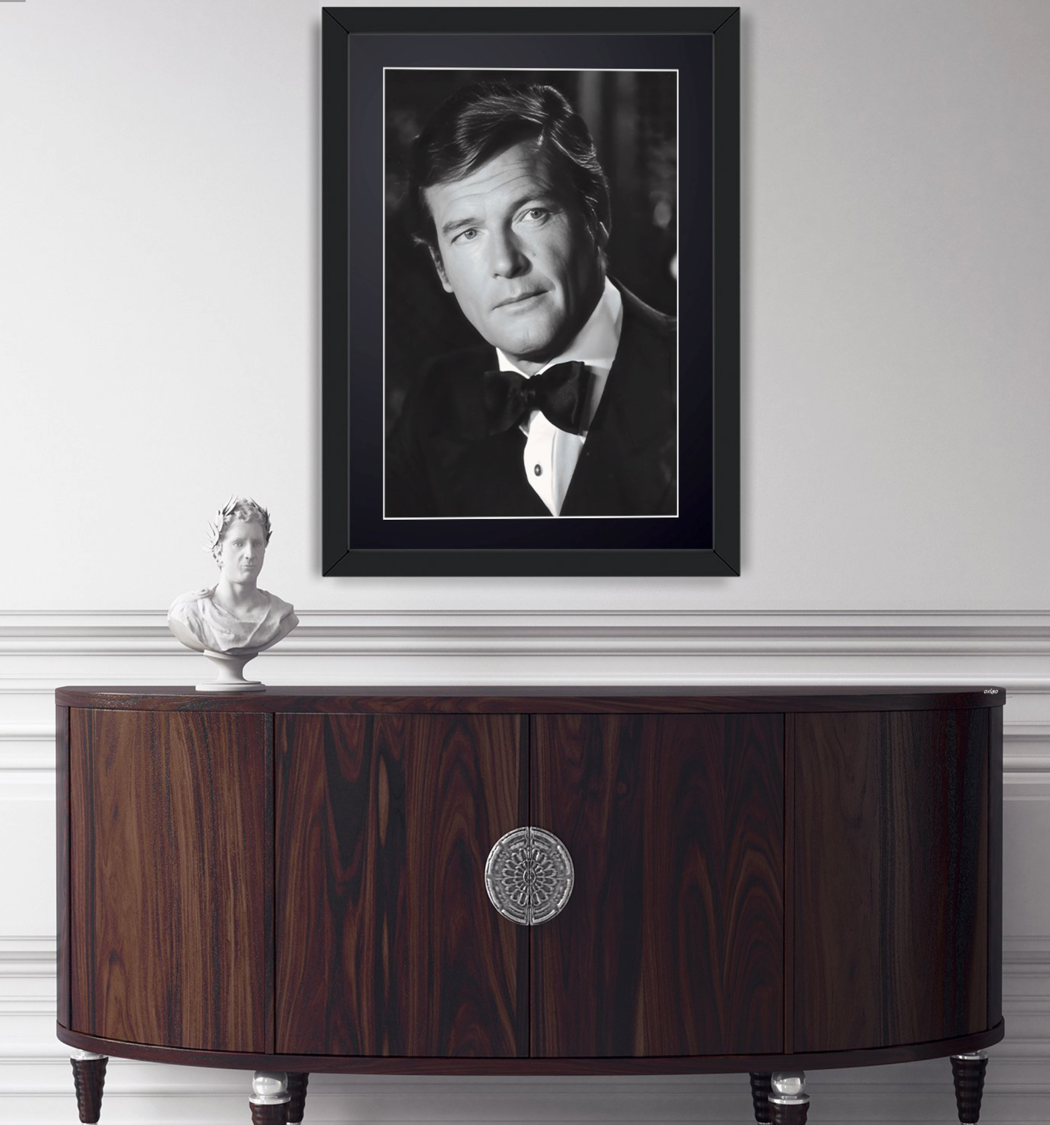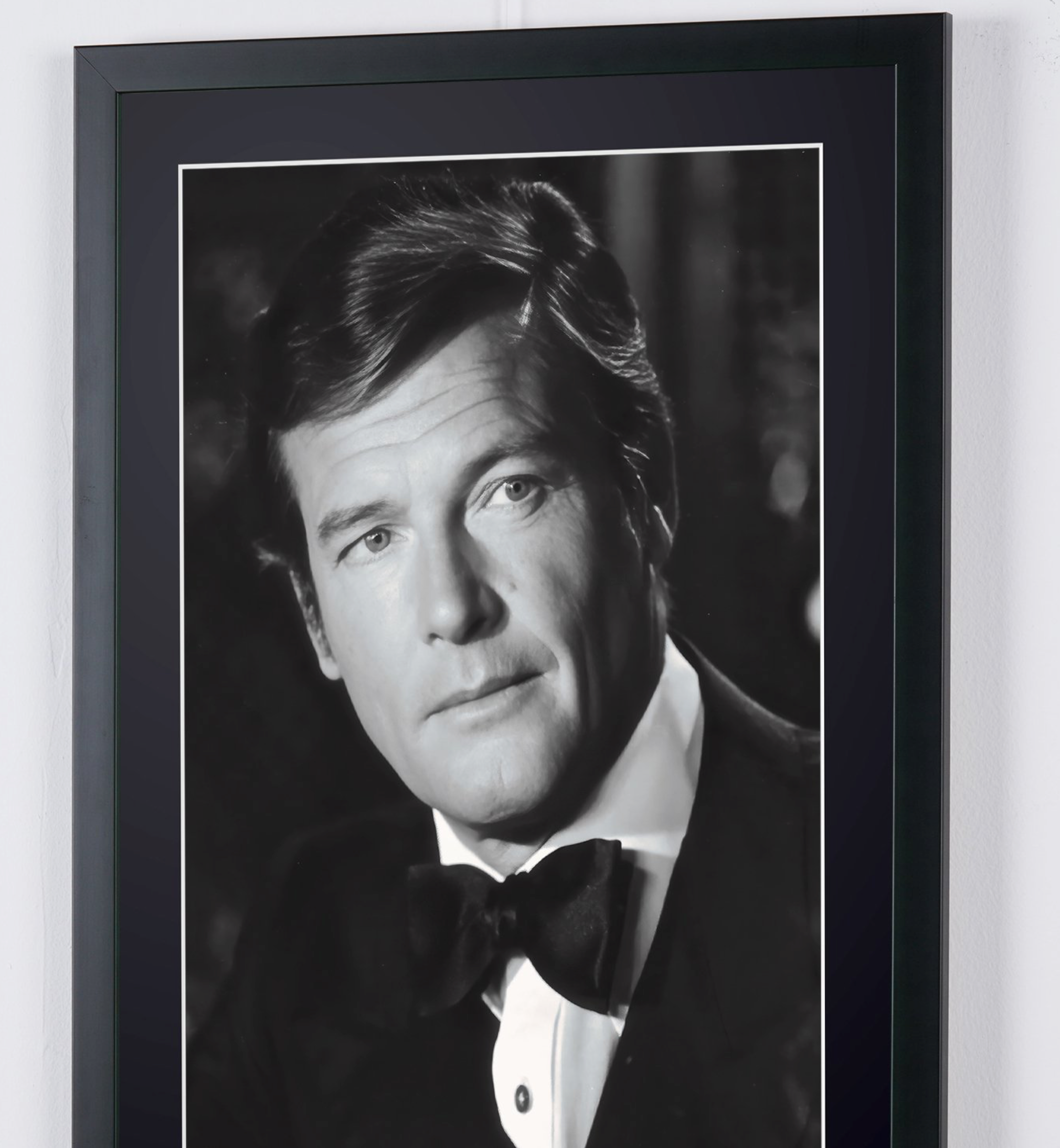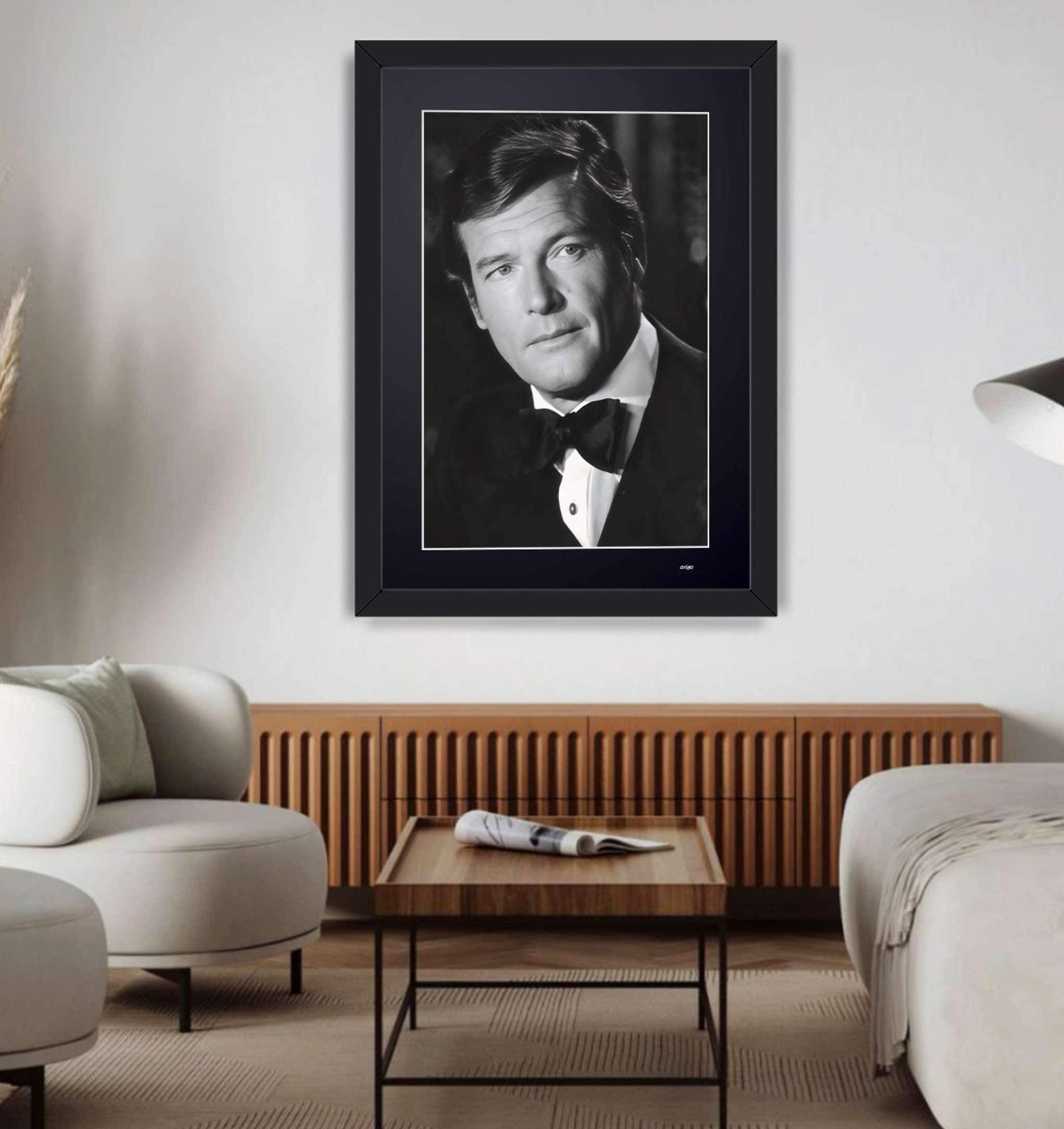 Photo encadrée de "Sir Roger Moore - JAmes Bond 007" — Tirage d'art noir et blanc sur papier Fine Art 70x50 cm