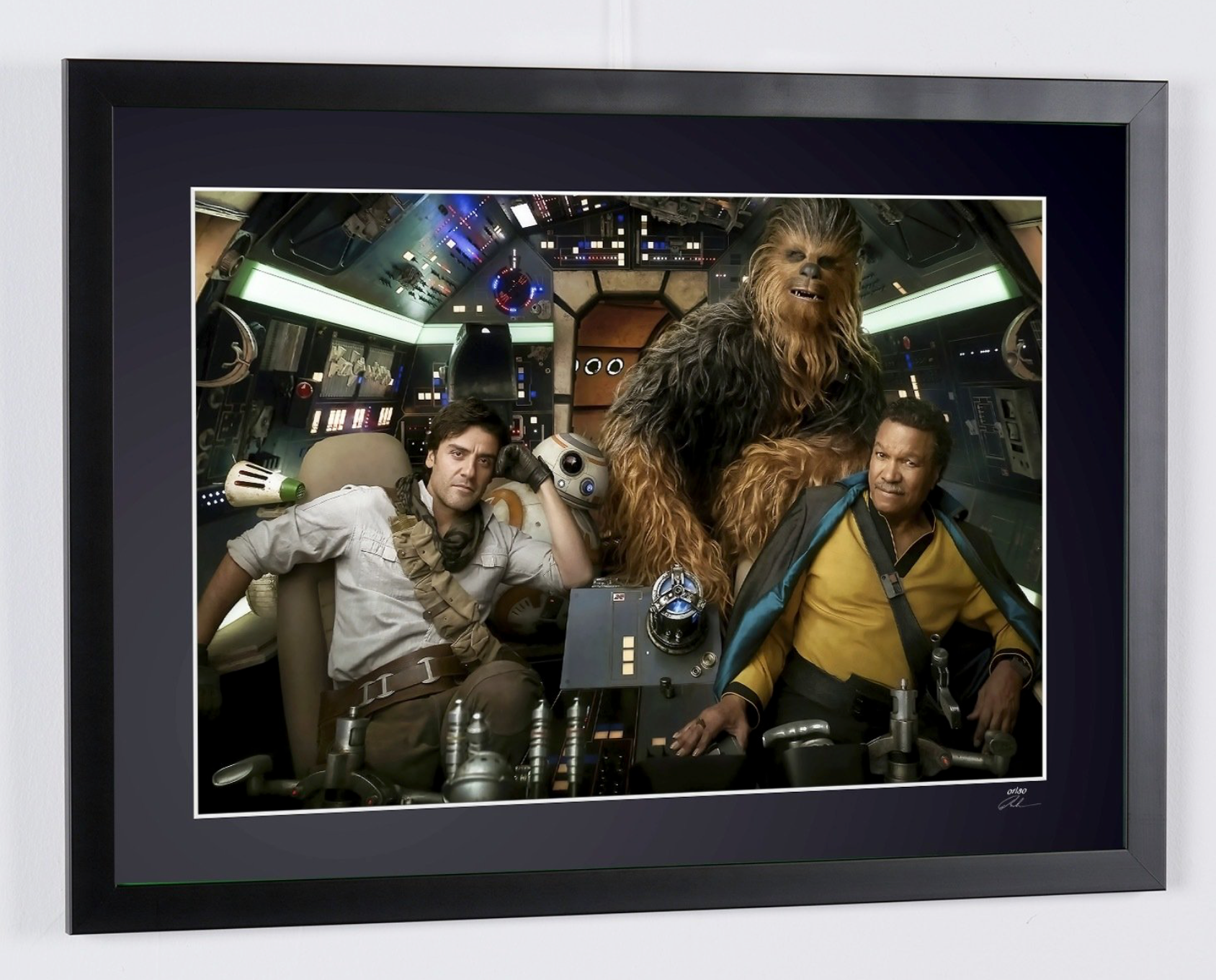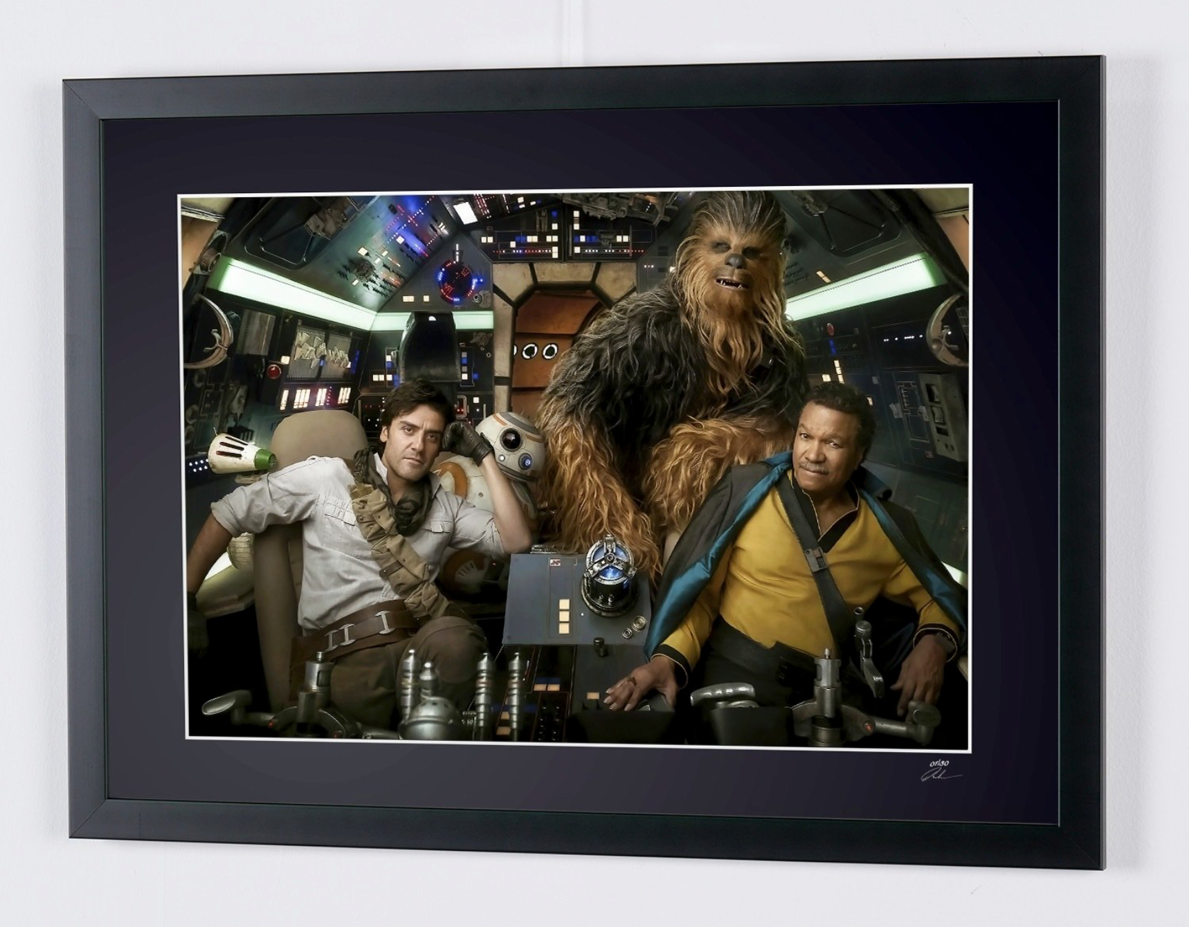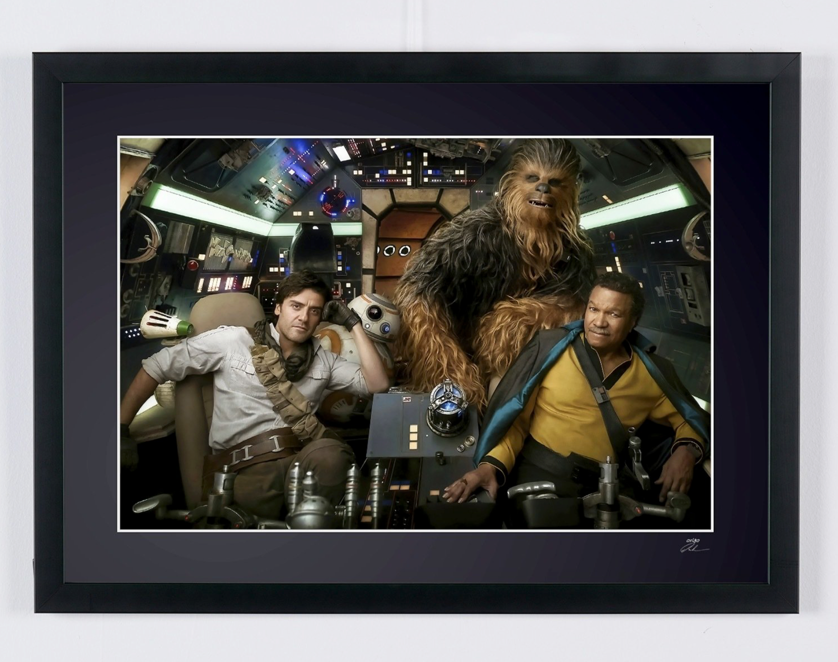 Photo encadrée de "Star Wars Episode IX: The Rise of Skywalker - The Cast on Falcon Millenium" — Tirage d'art noir et blanc sur papier Fine Art 70x50 cm