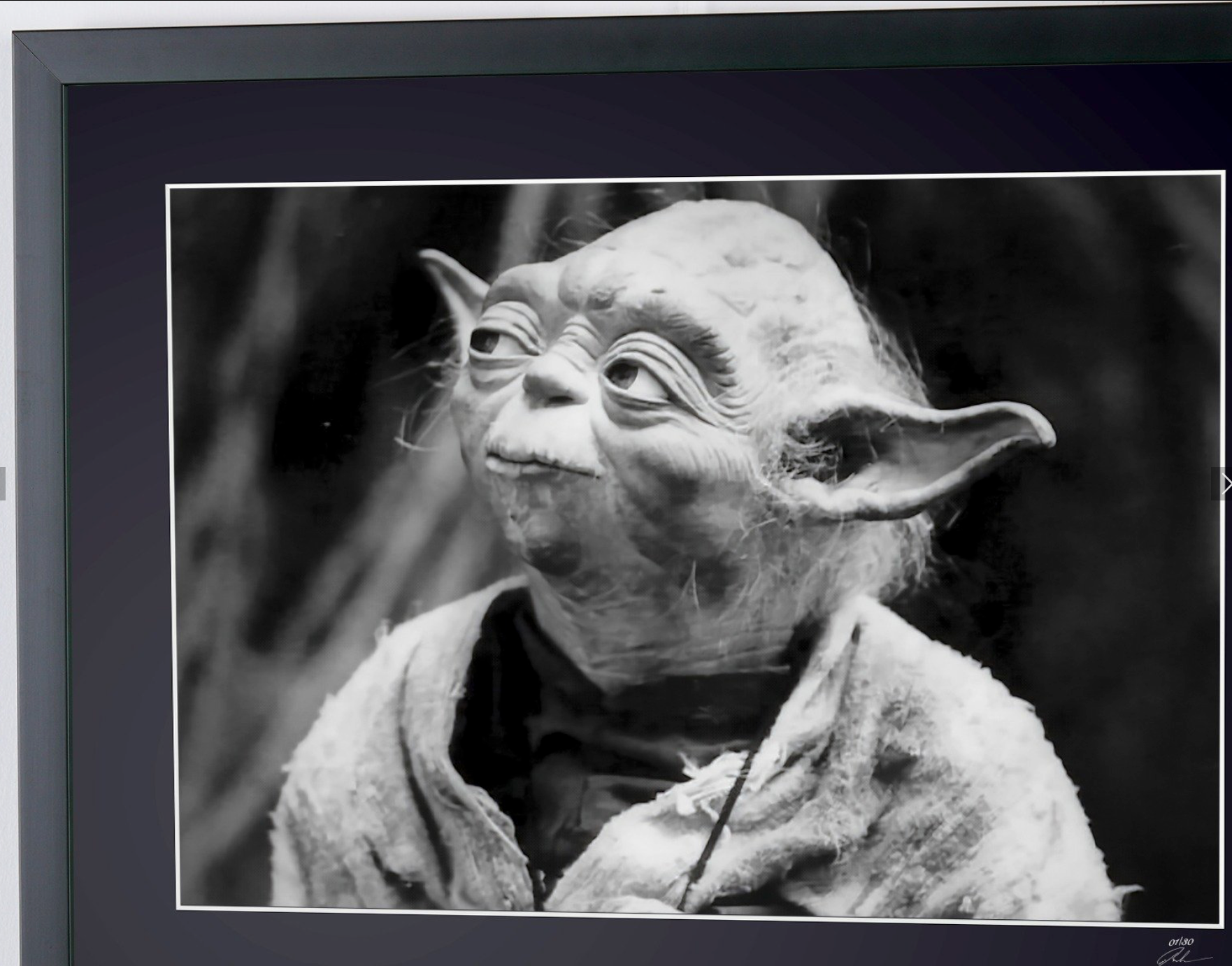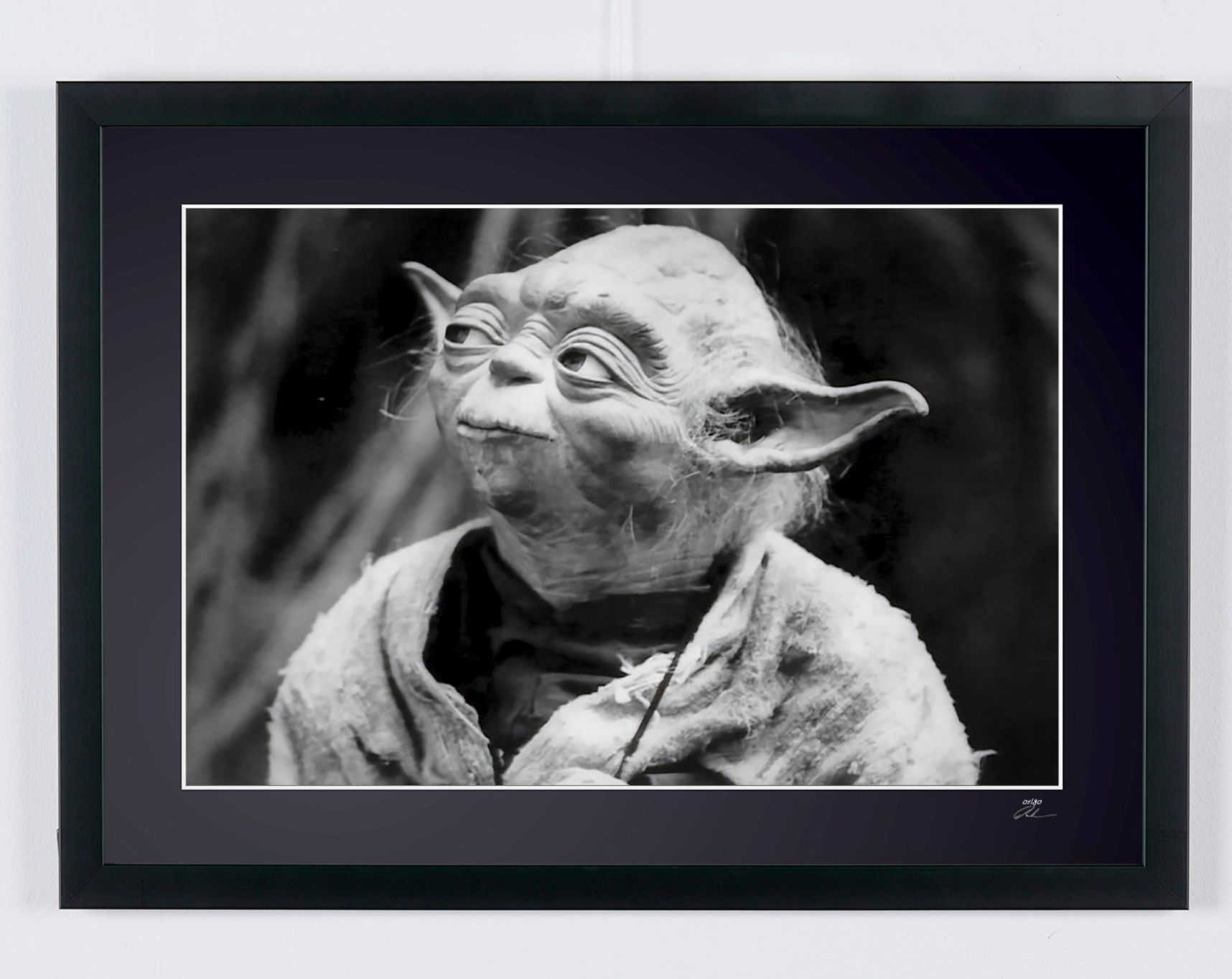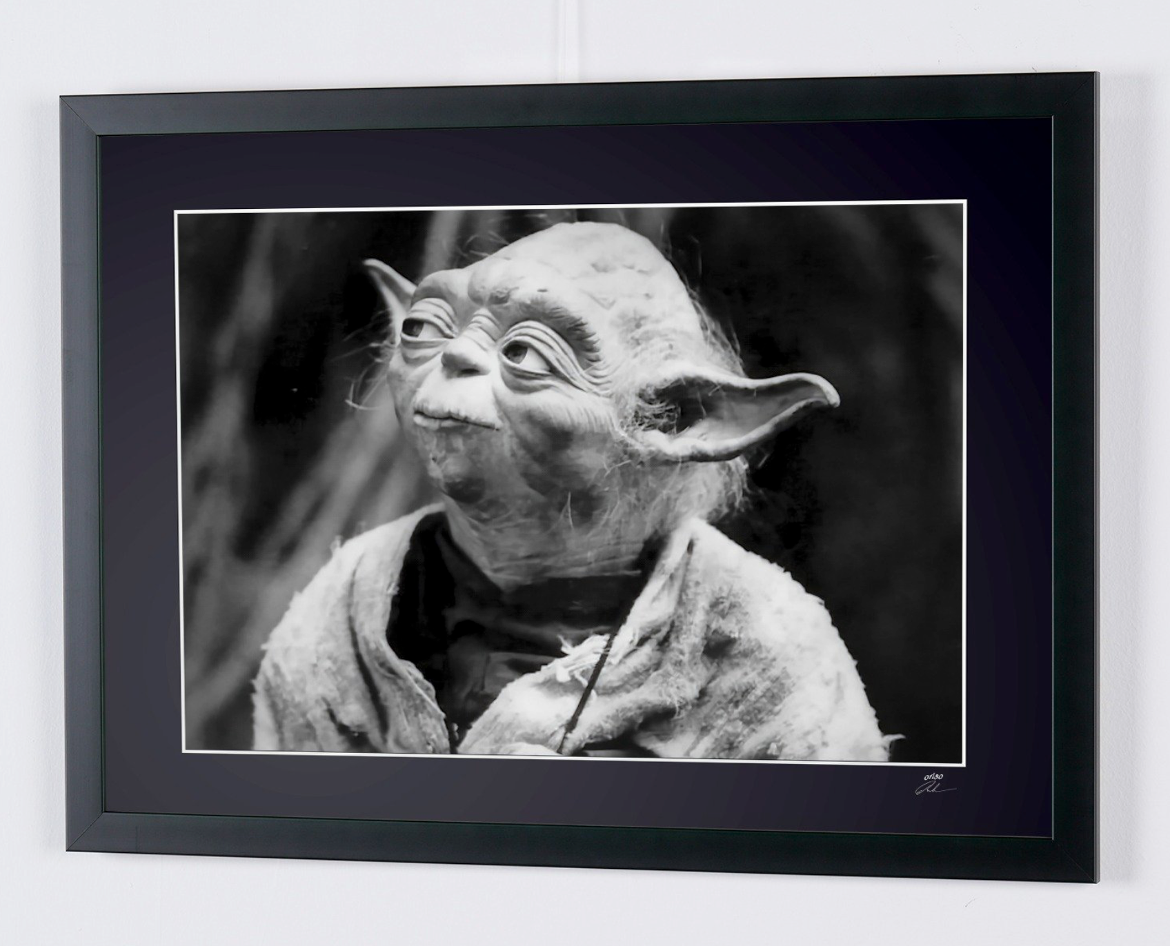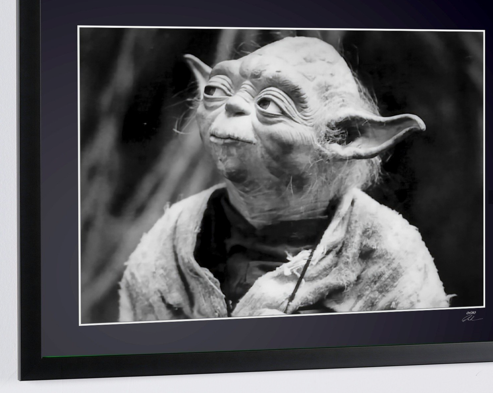 Photo encadrée de "Star Wars Episode V: The Empire Strikes Back (1980) - Master Yodas" — Tirage d'art noir et blanc sur papier Fine Art 70x50 cm