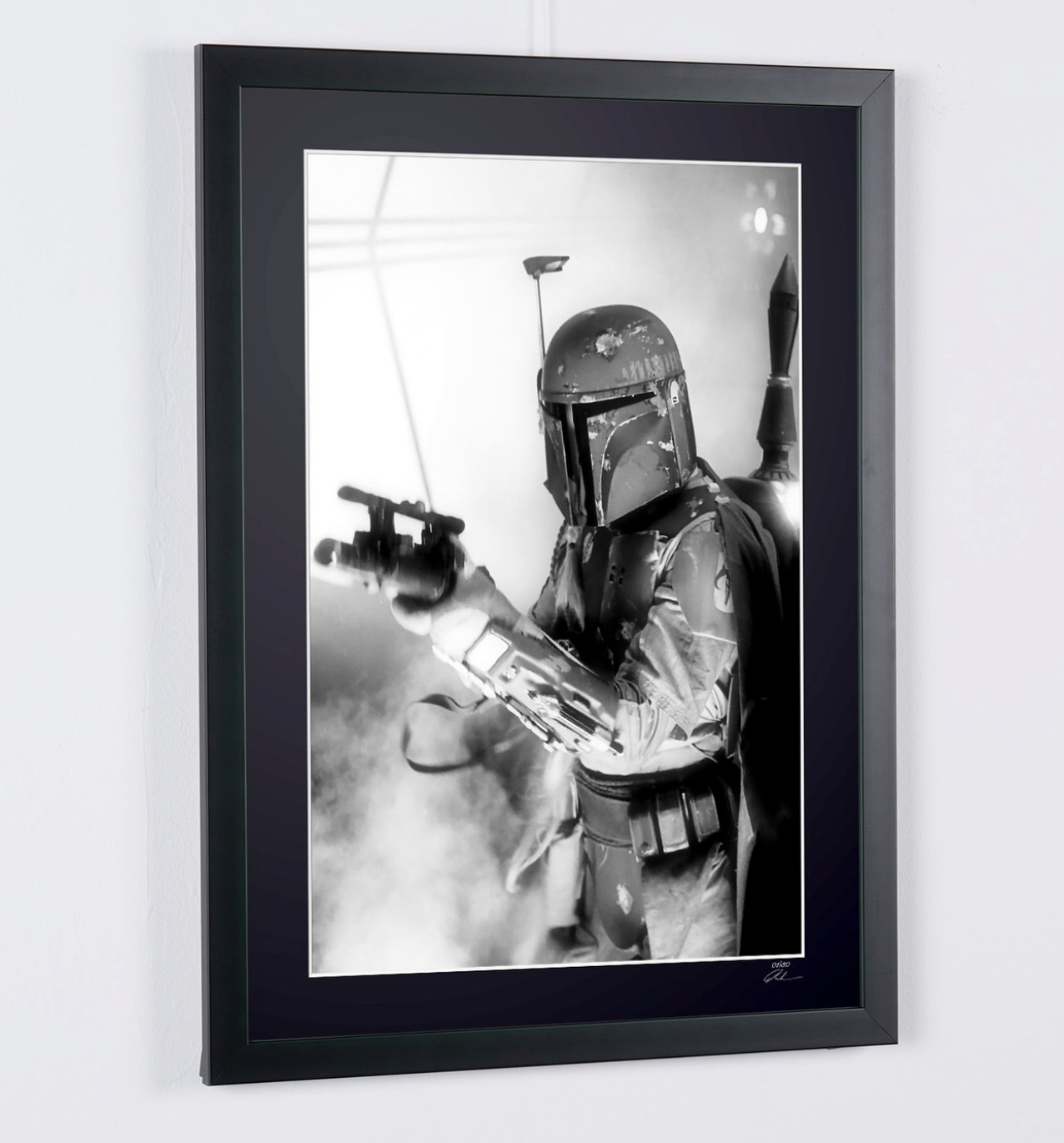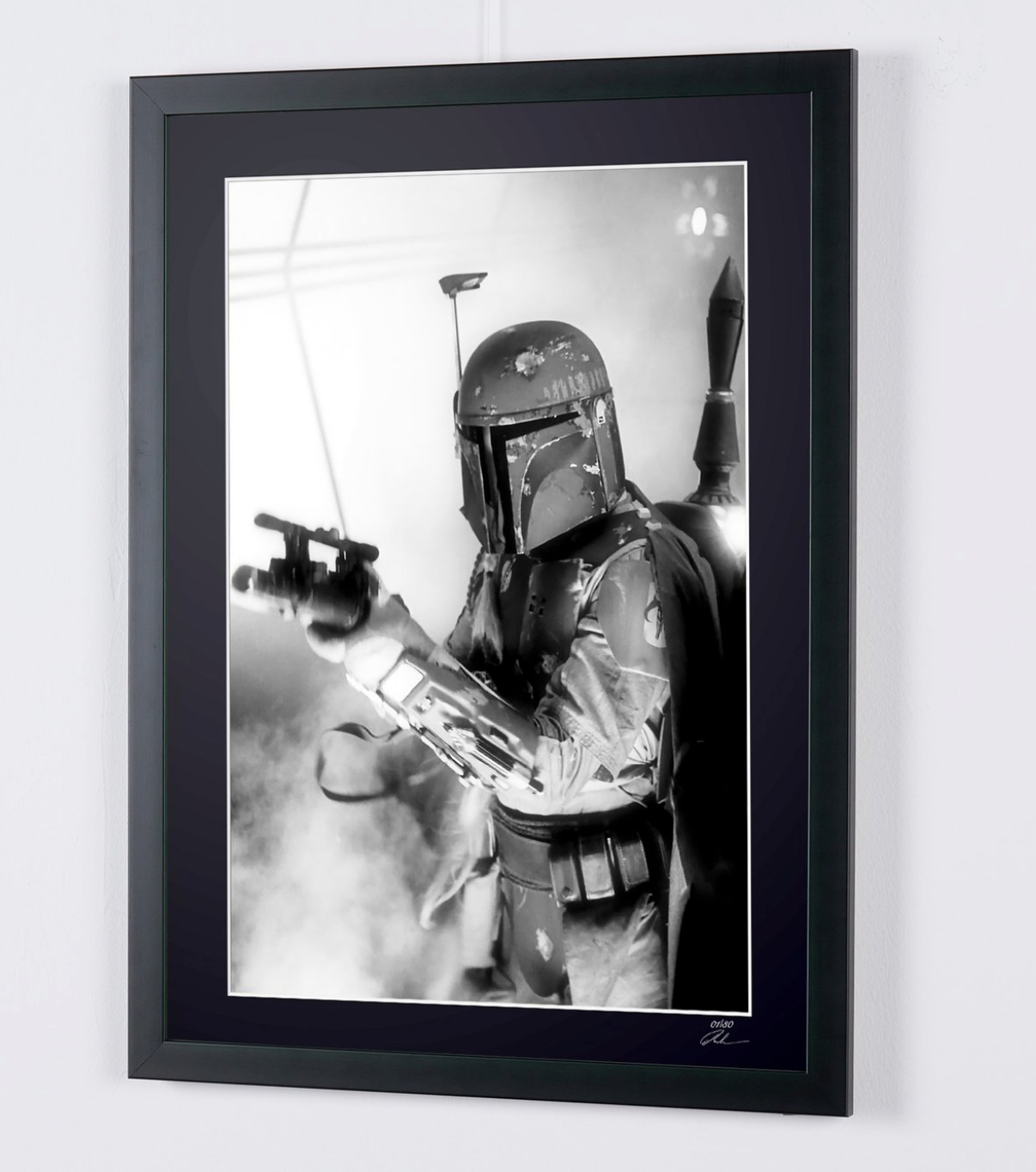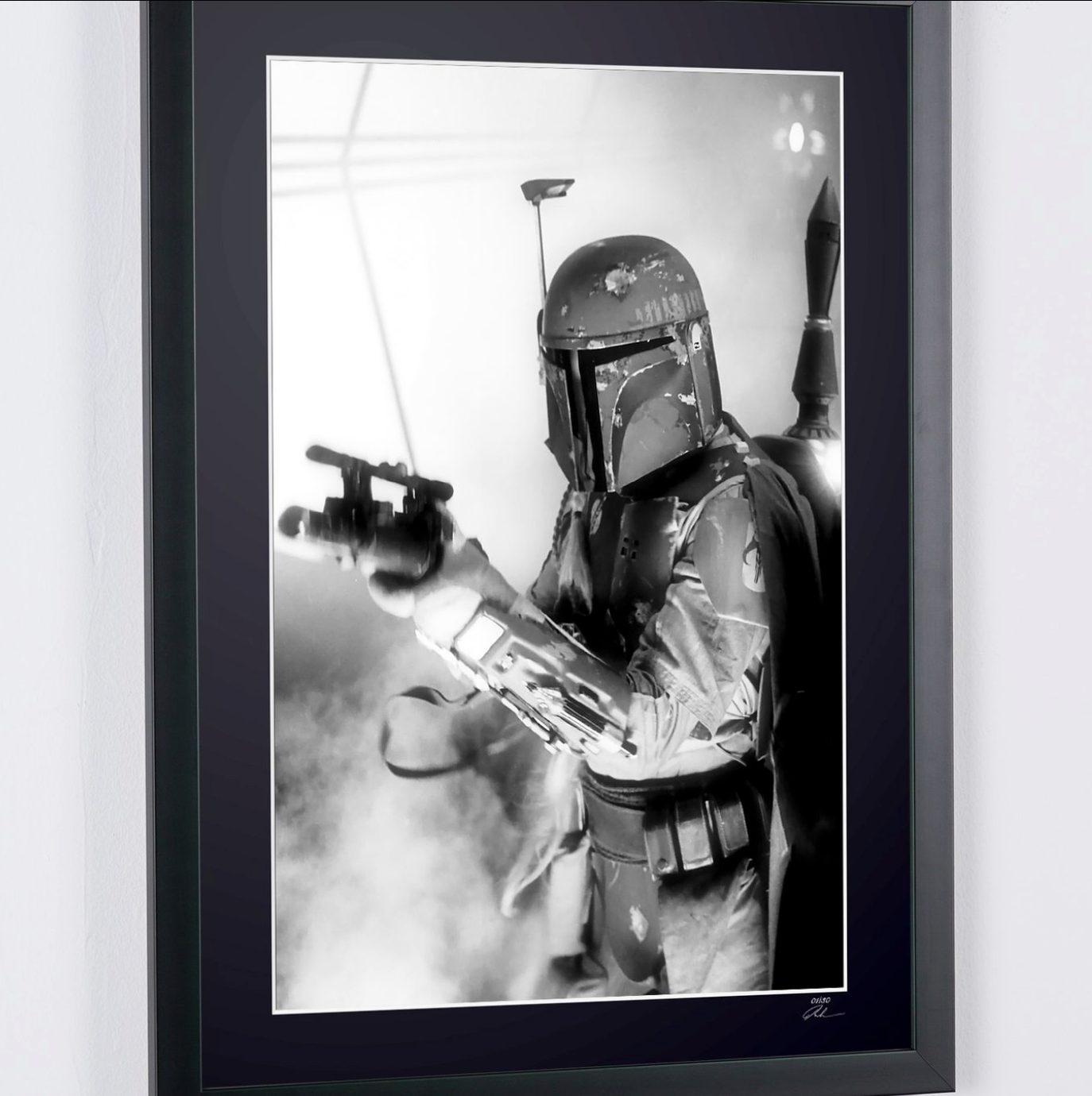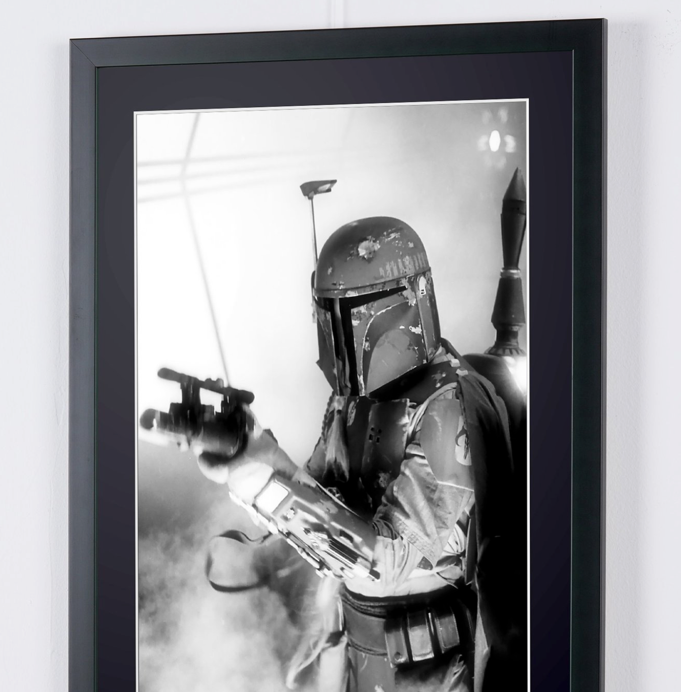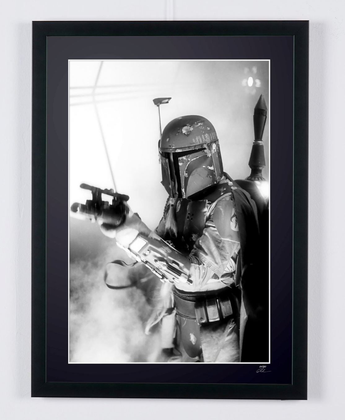 Photo encadrée de "Star Wars Episode V: The Empire Strikes Back, Boba Fett (Jeremy Bulloch)" — Tirage d'art noir et blanc sur papier Fine Art 70x50 cm