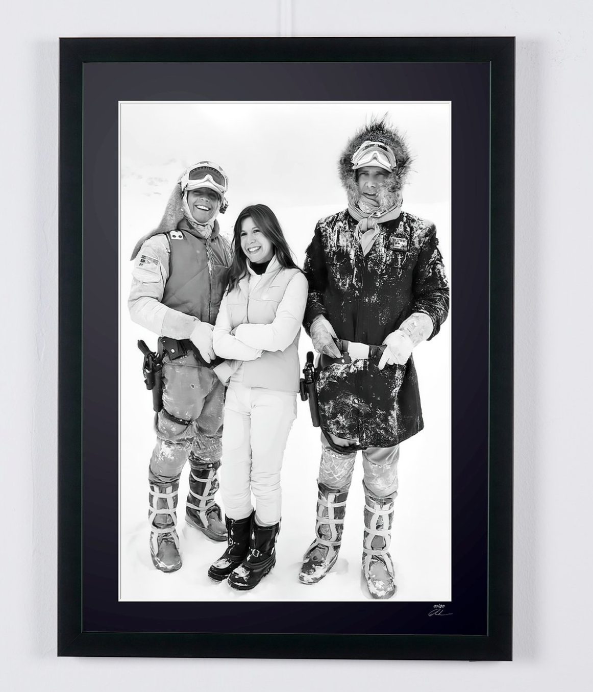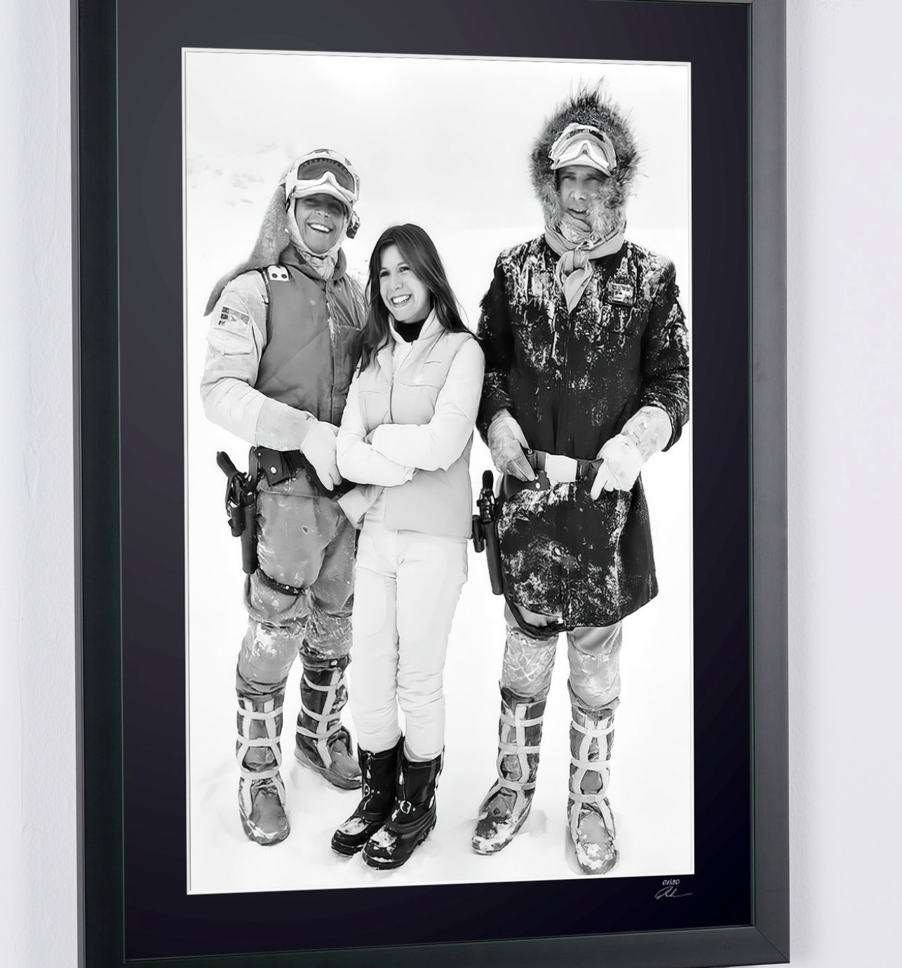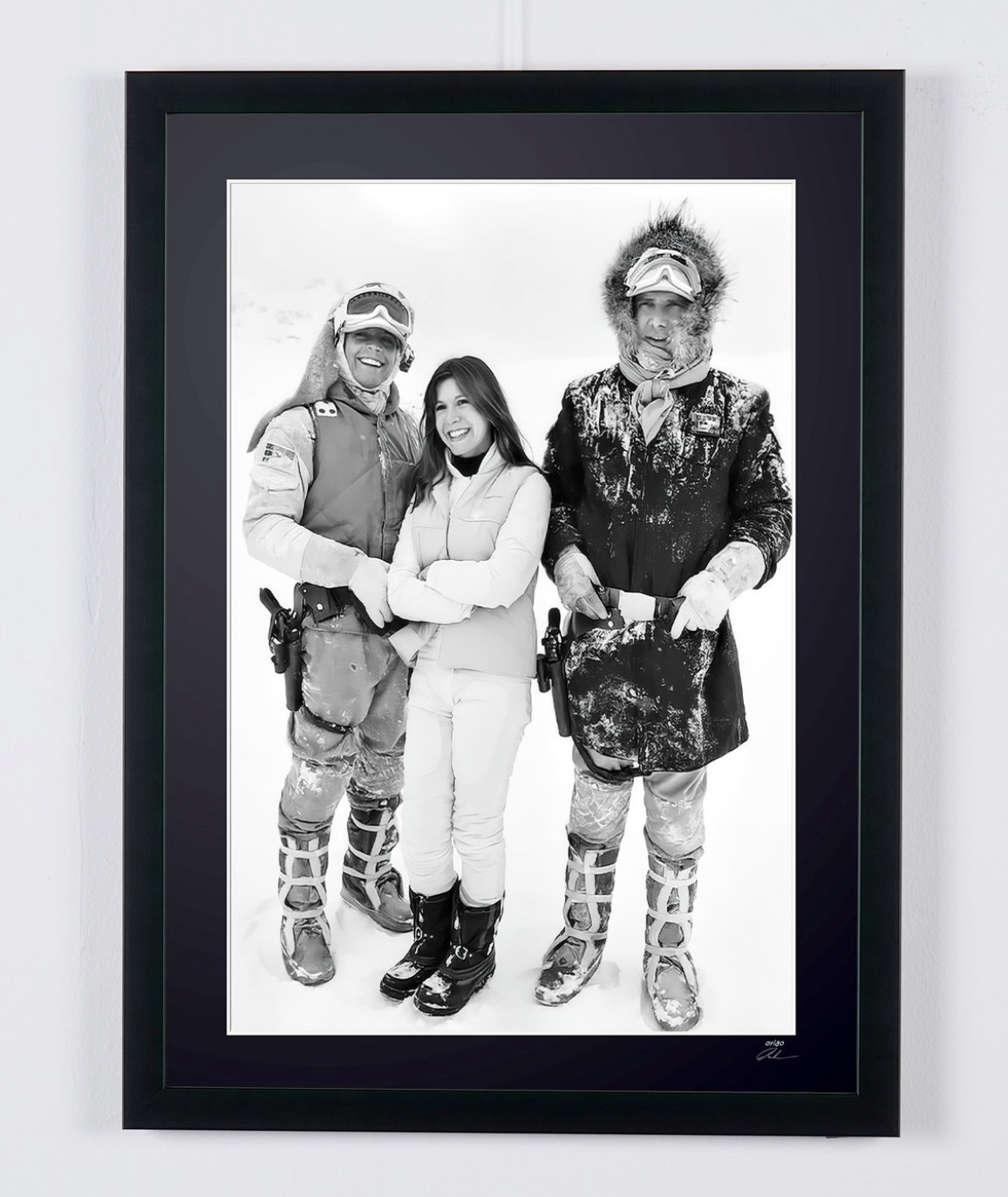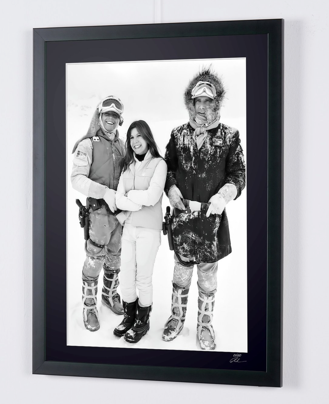 Photo encadrée de "Star Wars Episode V: The Empire Strikes Back - Han Solo, Leia Organa and Luke Skywalker On Set" — Tirage d'art noir et blanc sur papier Fine Art 70x50 cm