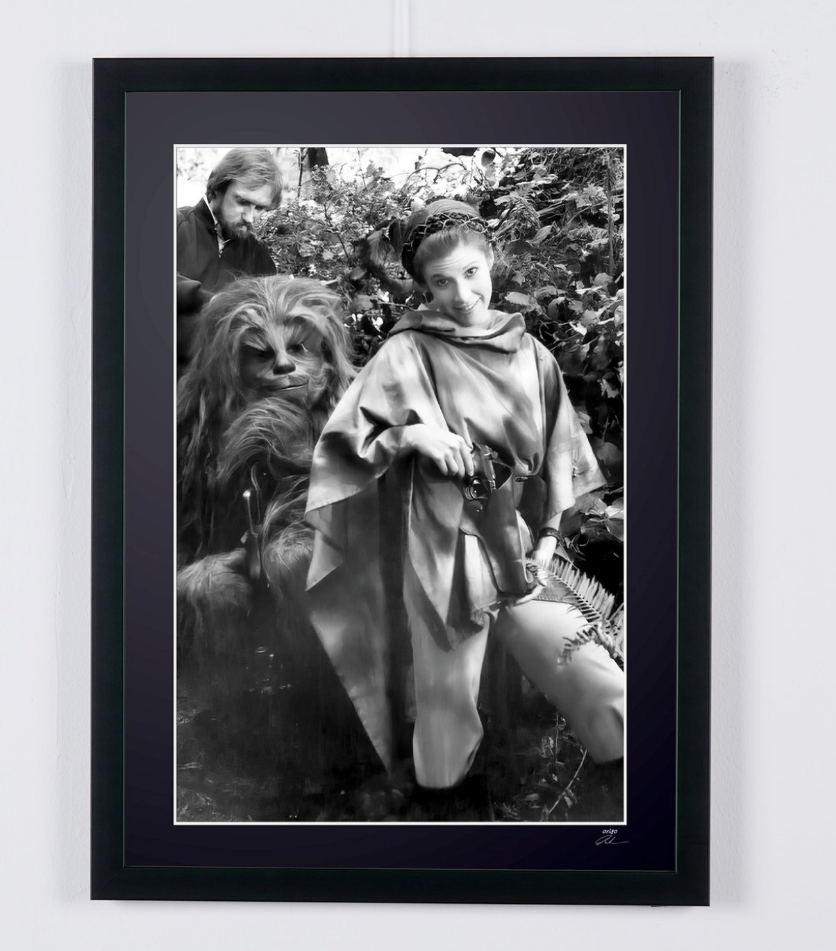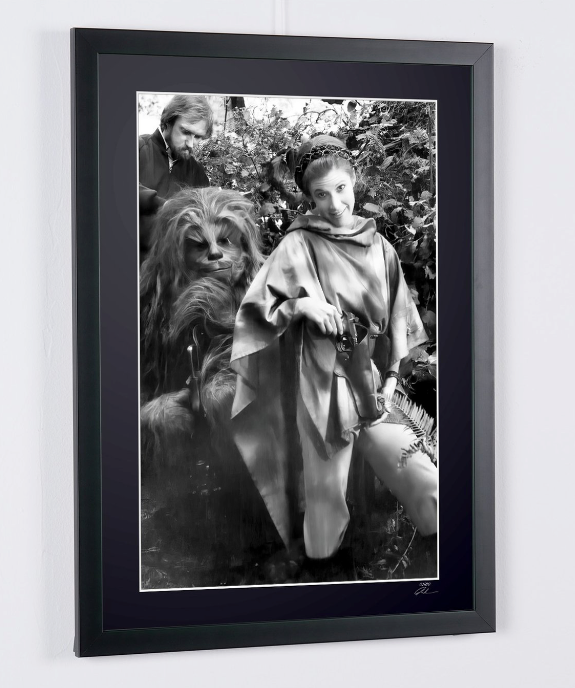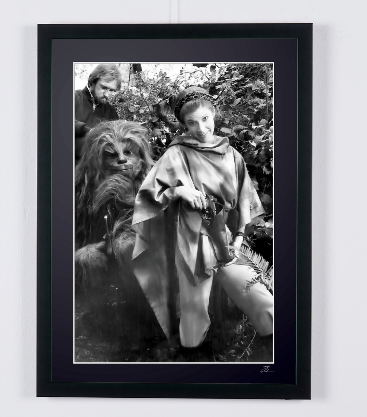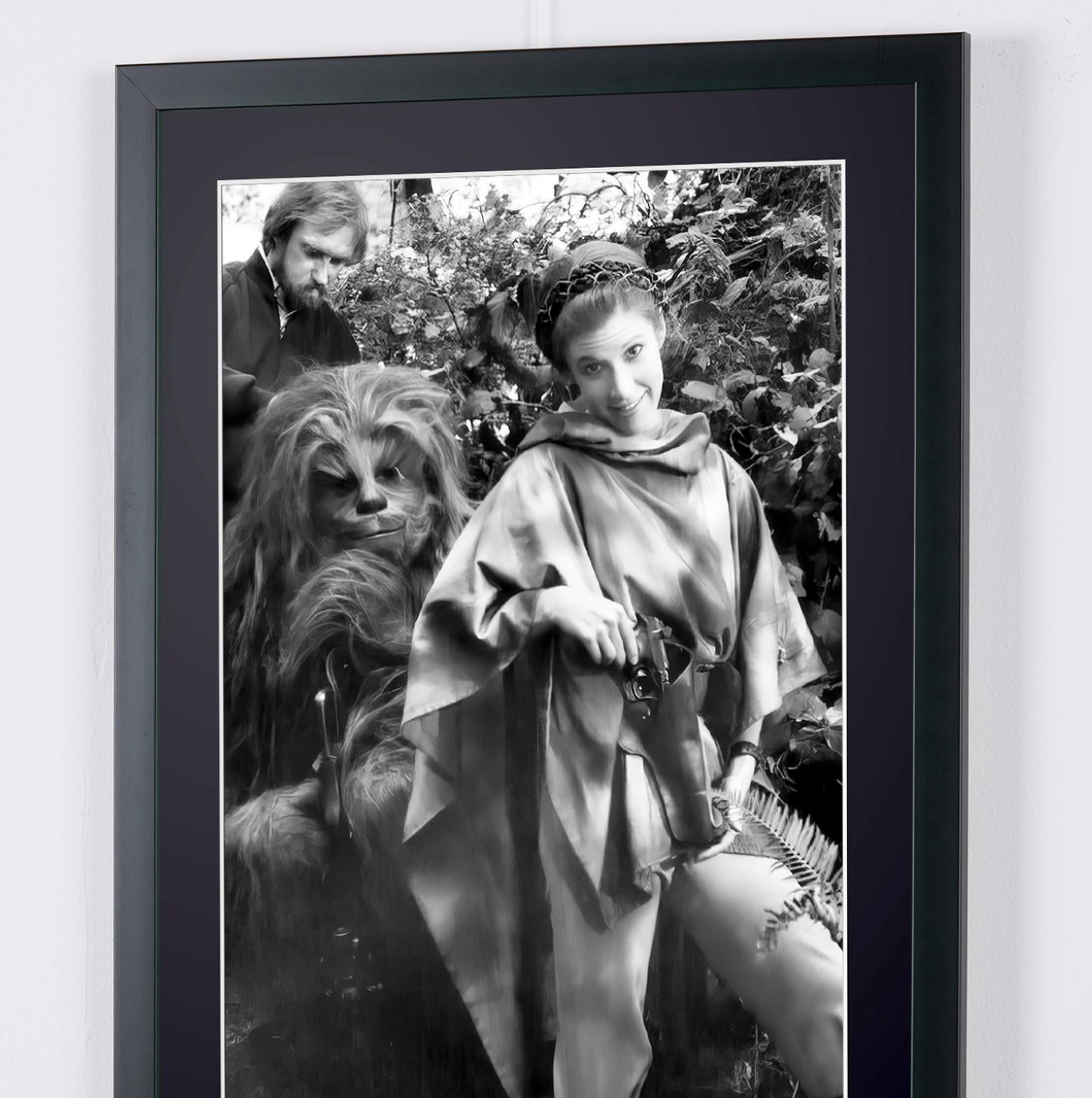 Photo encadrée de "Star Wars Episode VI: Return of the Jedi, Carrie Fisher and Peter Mayhew, behind the scenes" — Tirage d'art noir et blanc sur papier Fine Art 70x50 cm